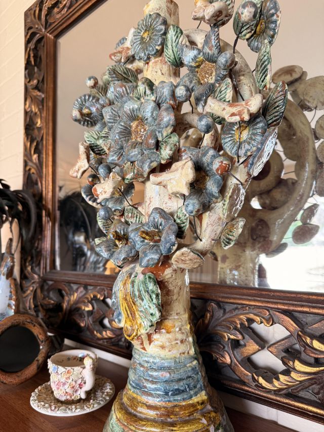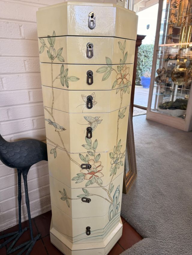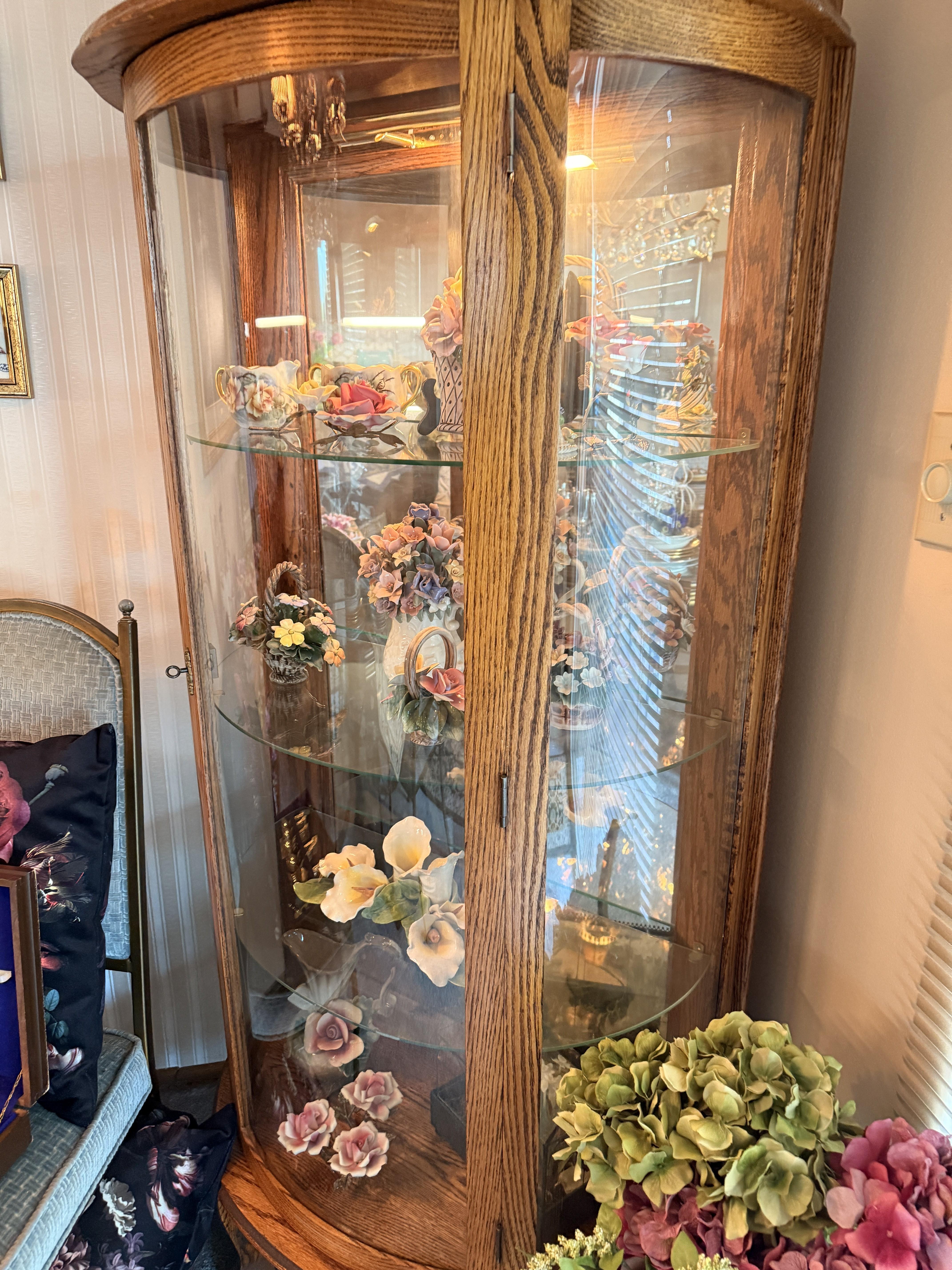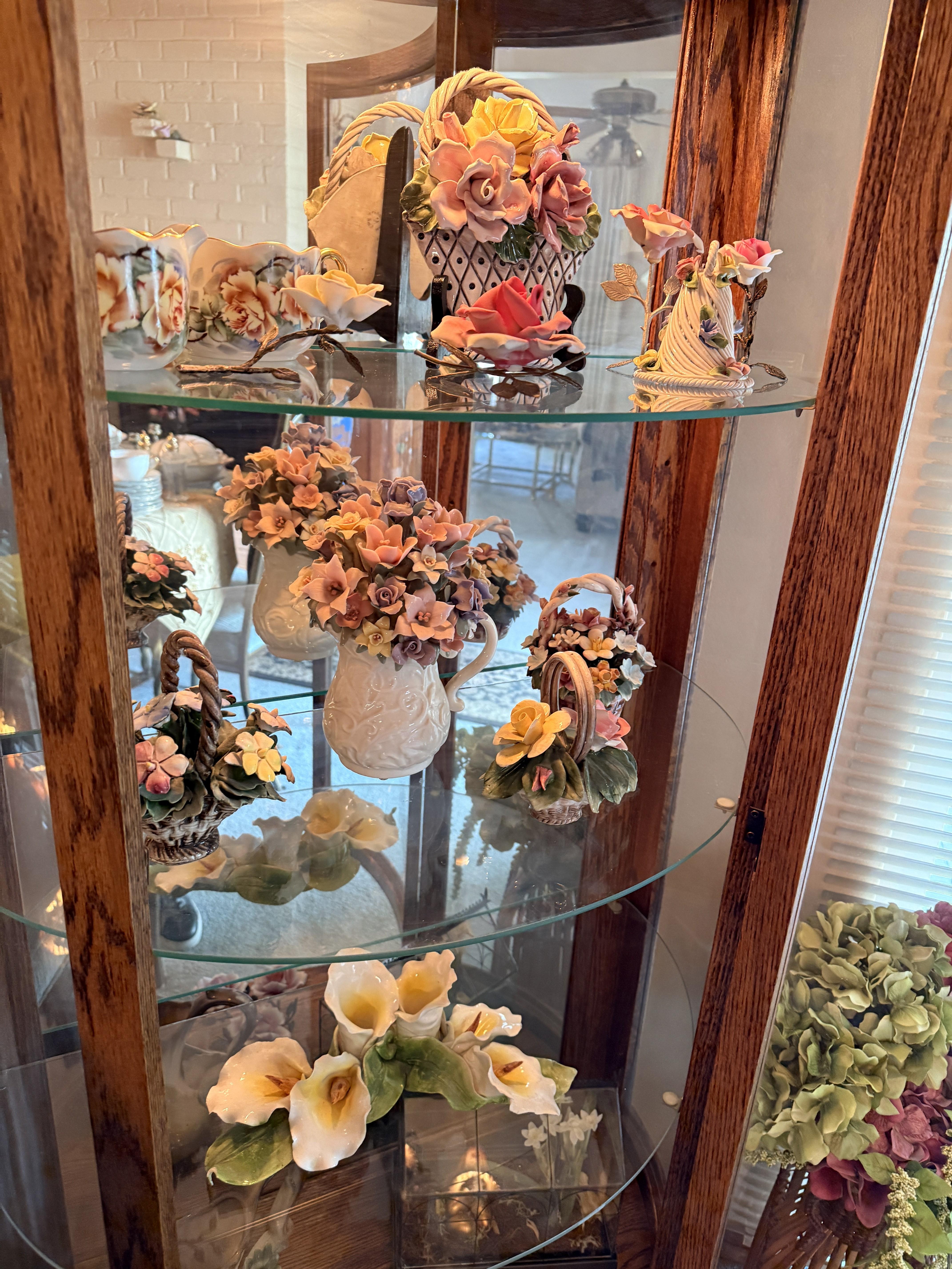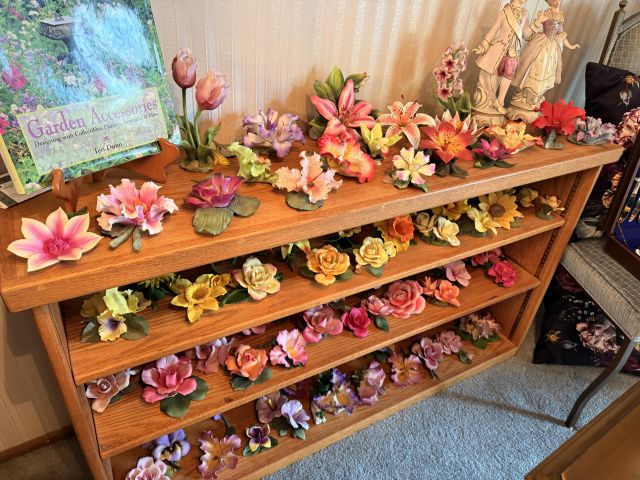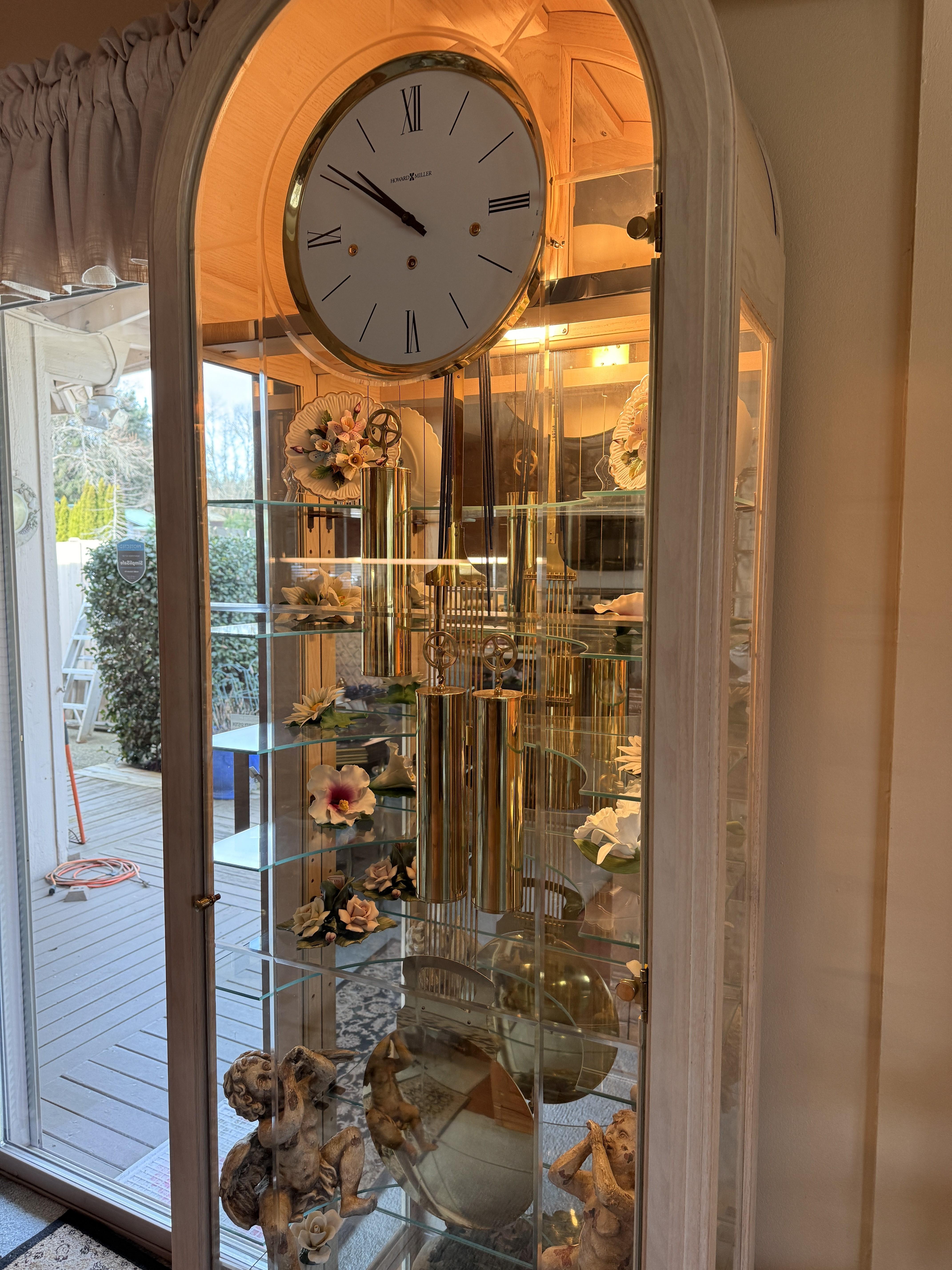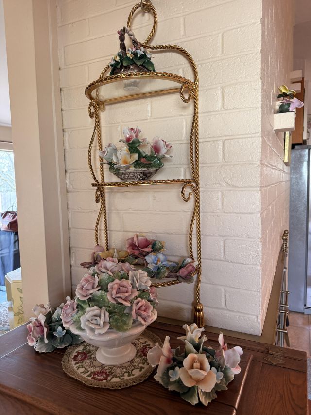 Hollywood Regency dining table? Check. Hundreds of Capodimonte flowers? Also check. Not to mention the lime wash Howard Miller grandfather clock with glass shelves inside. Can you imagine what you could do with that?