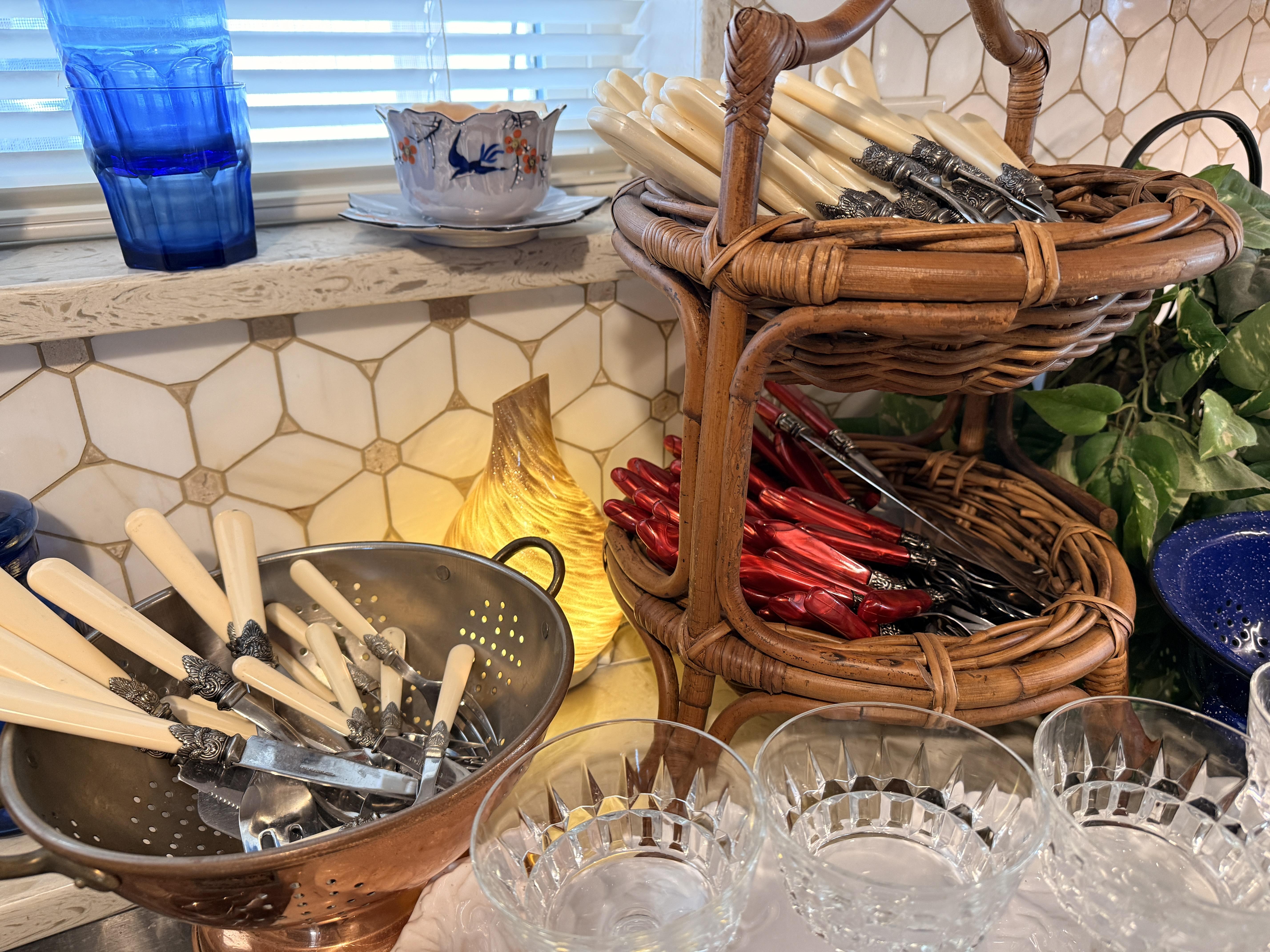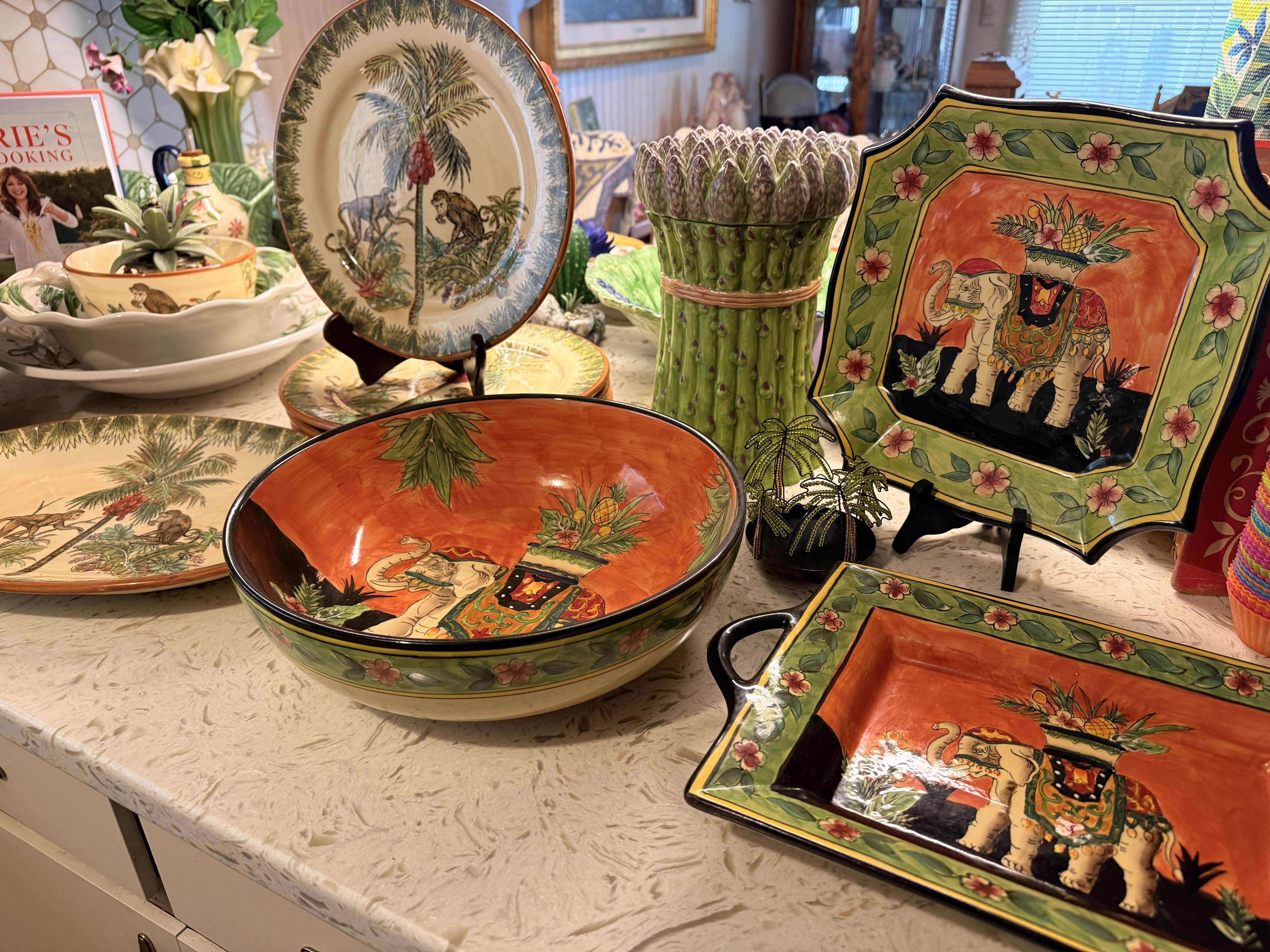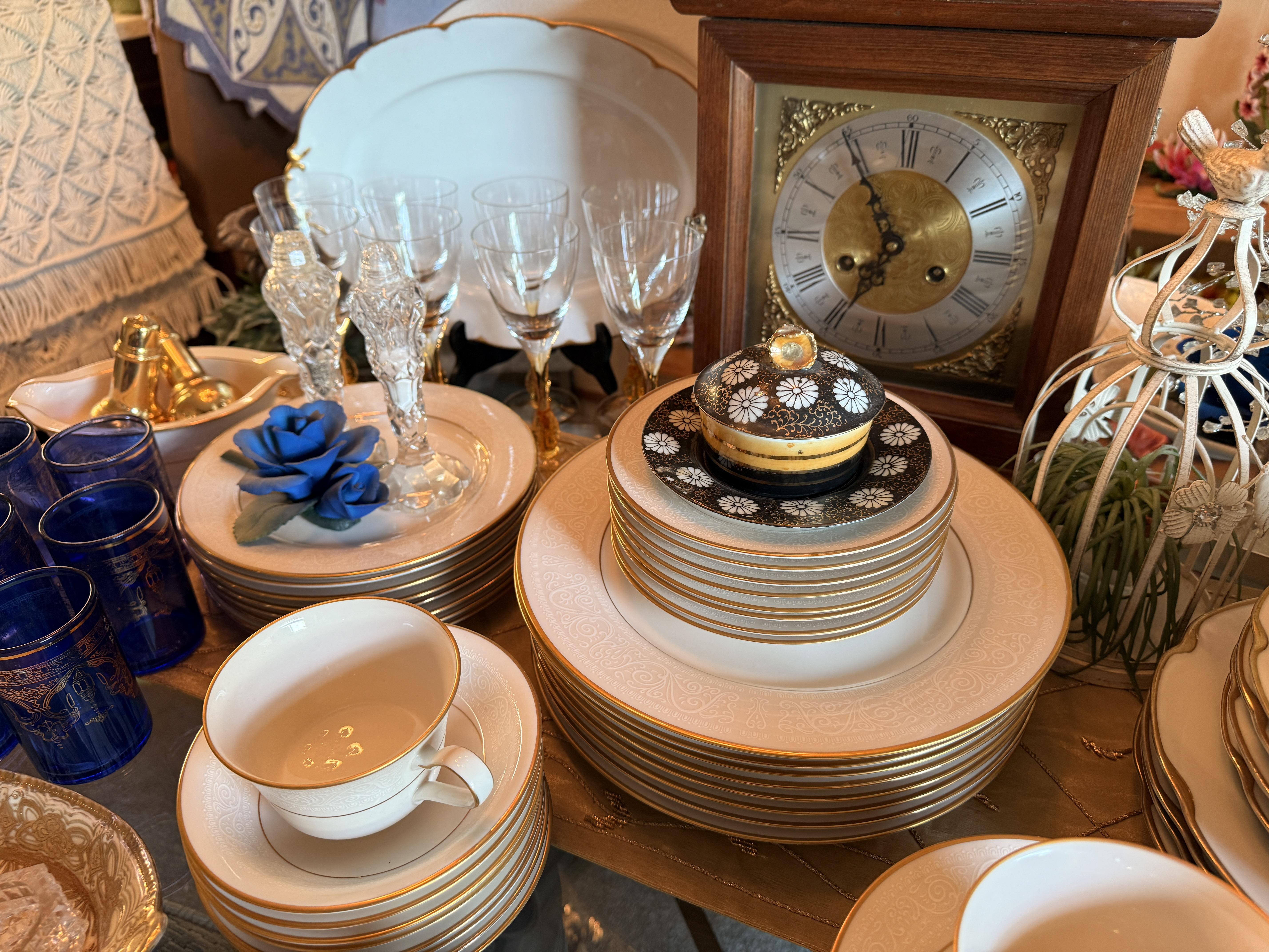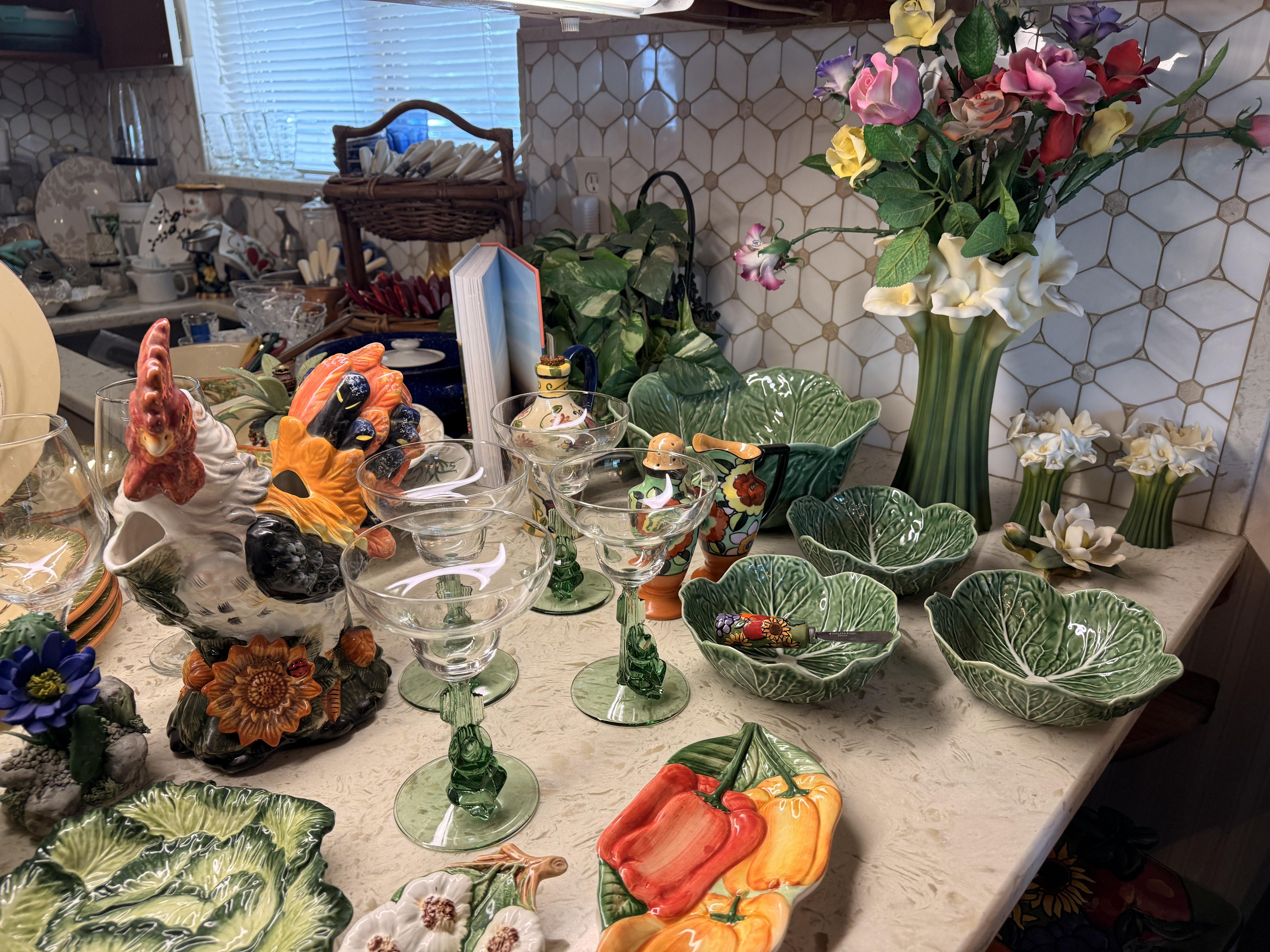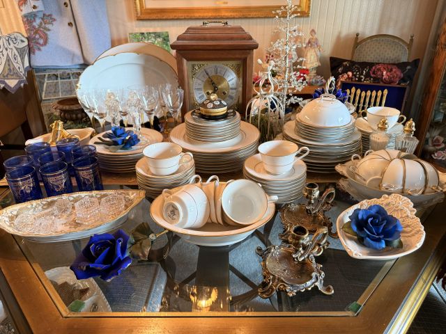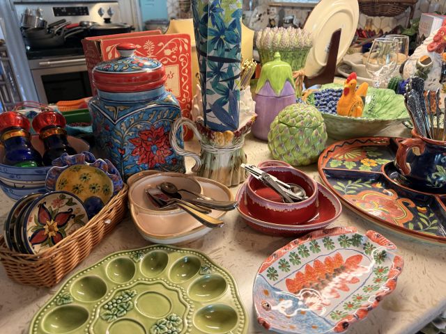 Incredible and BIG! antique ice chest with galvanized interior. Oak curio with curved glass front, full of More Capodimonte, gold tone flatware, set of versatile gold/ivory china, cobalt blue Moroccan tea glasses, gorgeous ornate brass candleholders, classic mantle clock, super pretty Sundance embroidered coat, pair of camel brown faux leather barstools, Majolica style cabbage bowls, colorful serving pieces, Mexican/Italian/Safari style pieces, Bugatti Italy stainless flatware with cream handles, similar set - but red handles also available, nicer cookware/bakeware, small appliances and utensils....