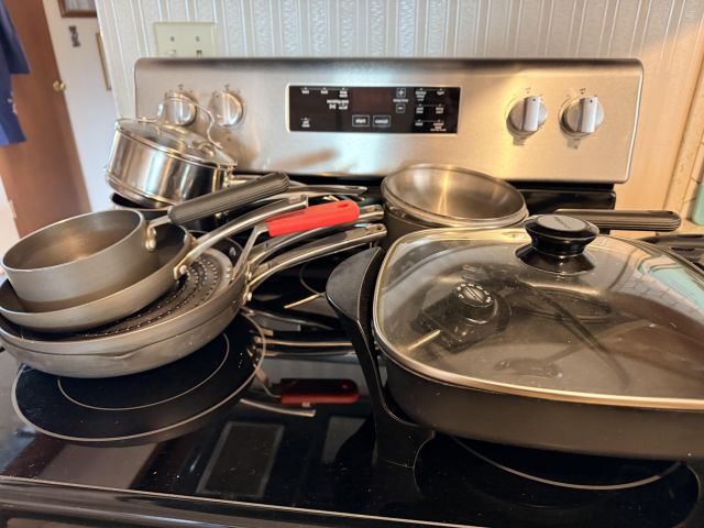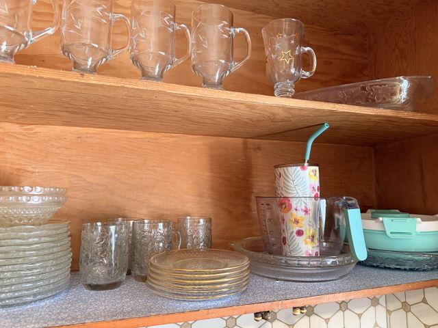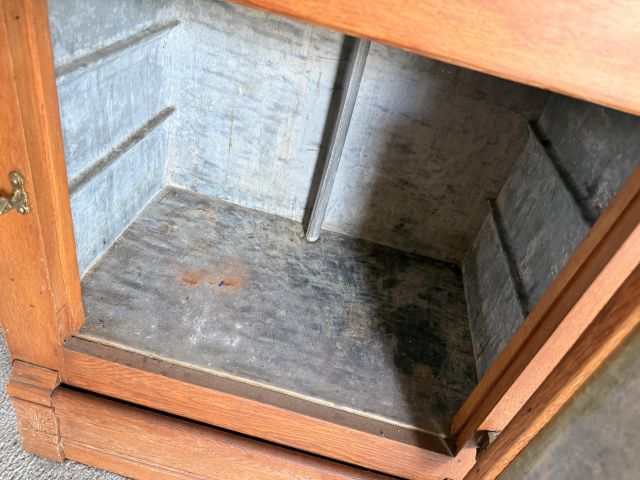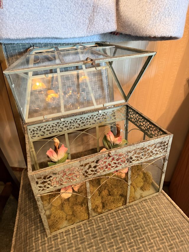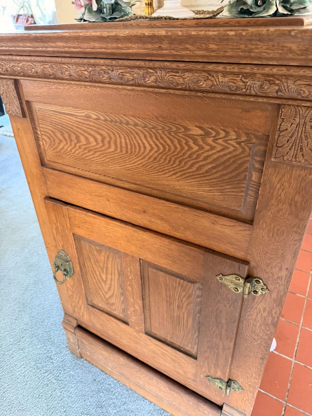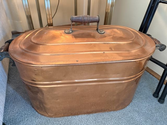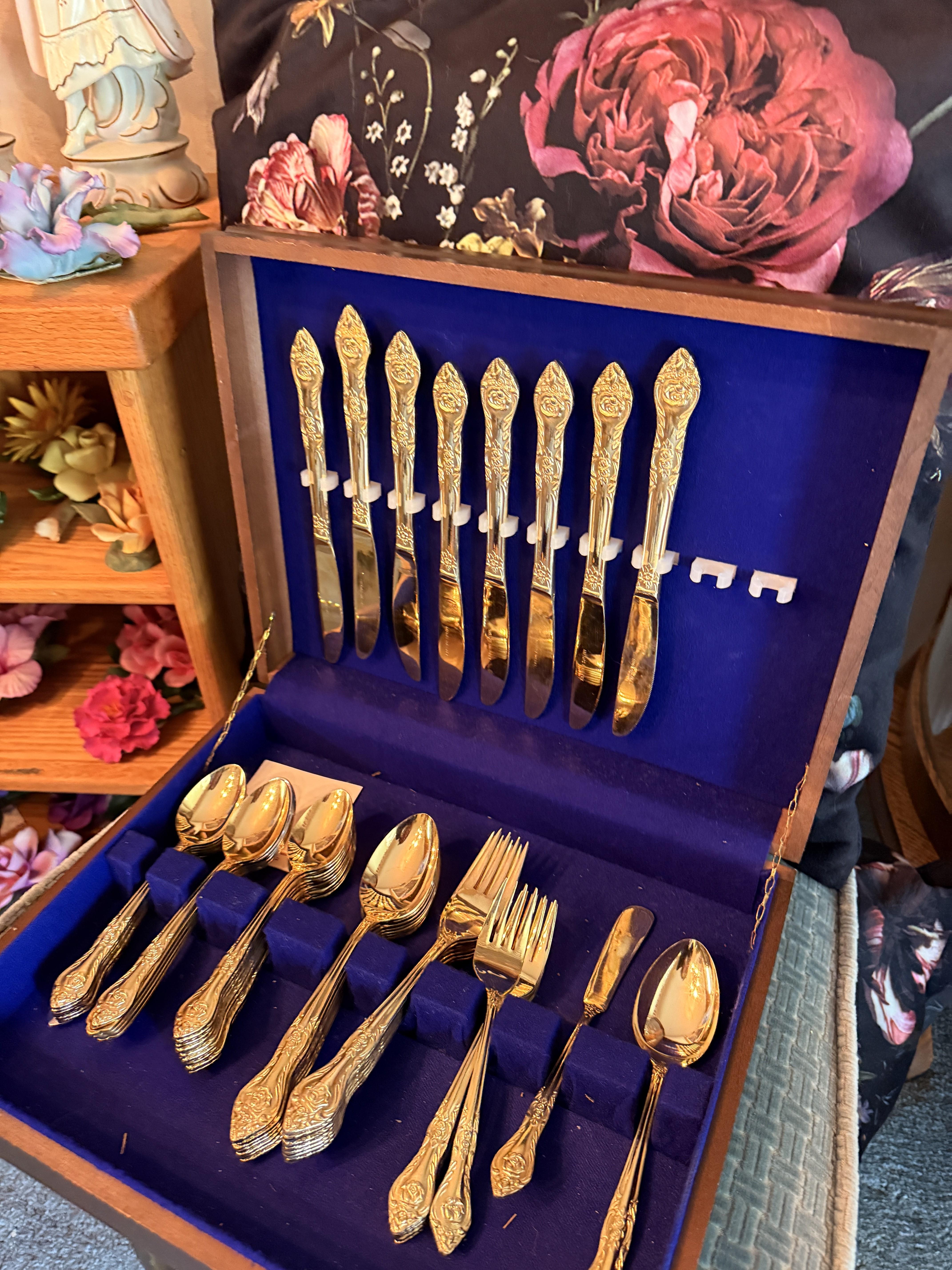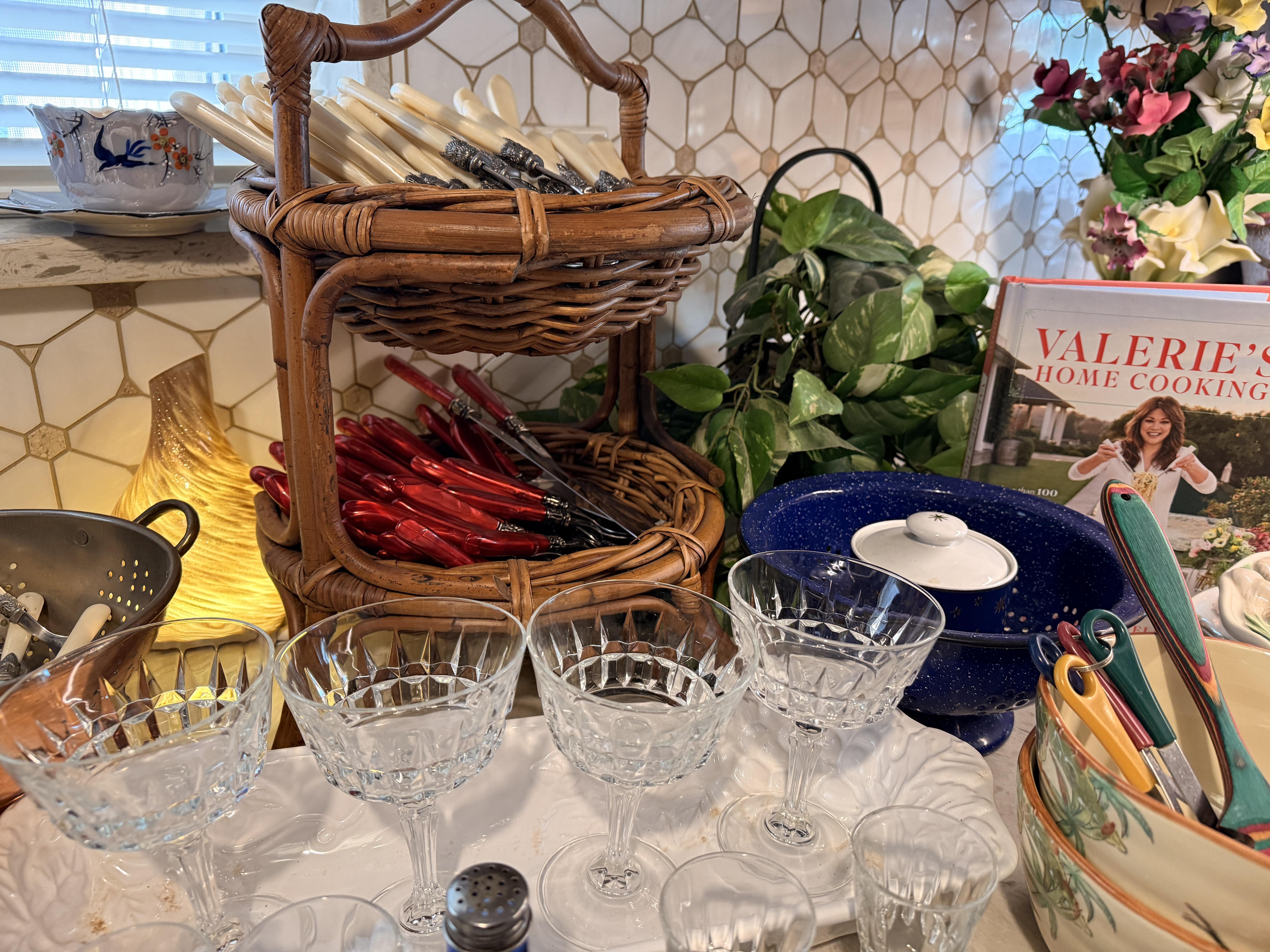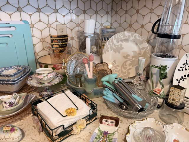 Incredible and BIG! antique ice chest with galvanized interior. Oak curio with curved glass front, full of More Capodimonte, gold tone flatware, set of versatile gold/ivory china, cobalt blue Moroccan tea glasses, gorgeous ornate brass candleholders, classic mantle clock, super pretty Sundance embroidered coat, pair of camel brown faux leather barstools, Majolica style cabbage bowls, colorful serving pieces, Mexican/Italian/Safari style pieces, Bugatti Italy stainless flatware with cream handles, similar set - but red handles also available, nicer cookware/bakeware, small appliances and utensils....