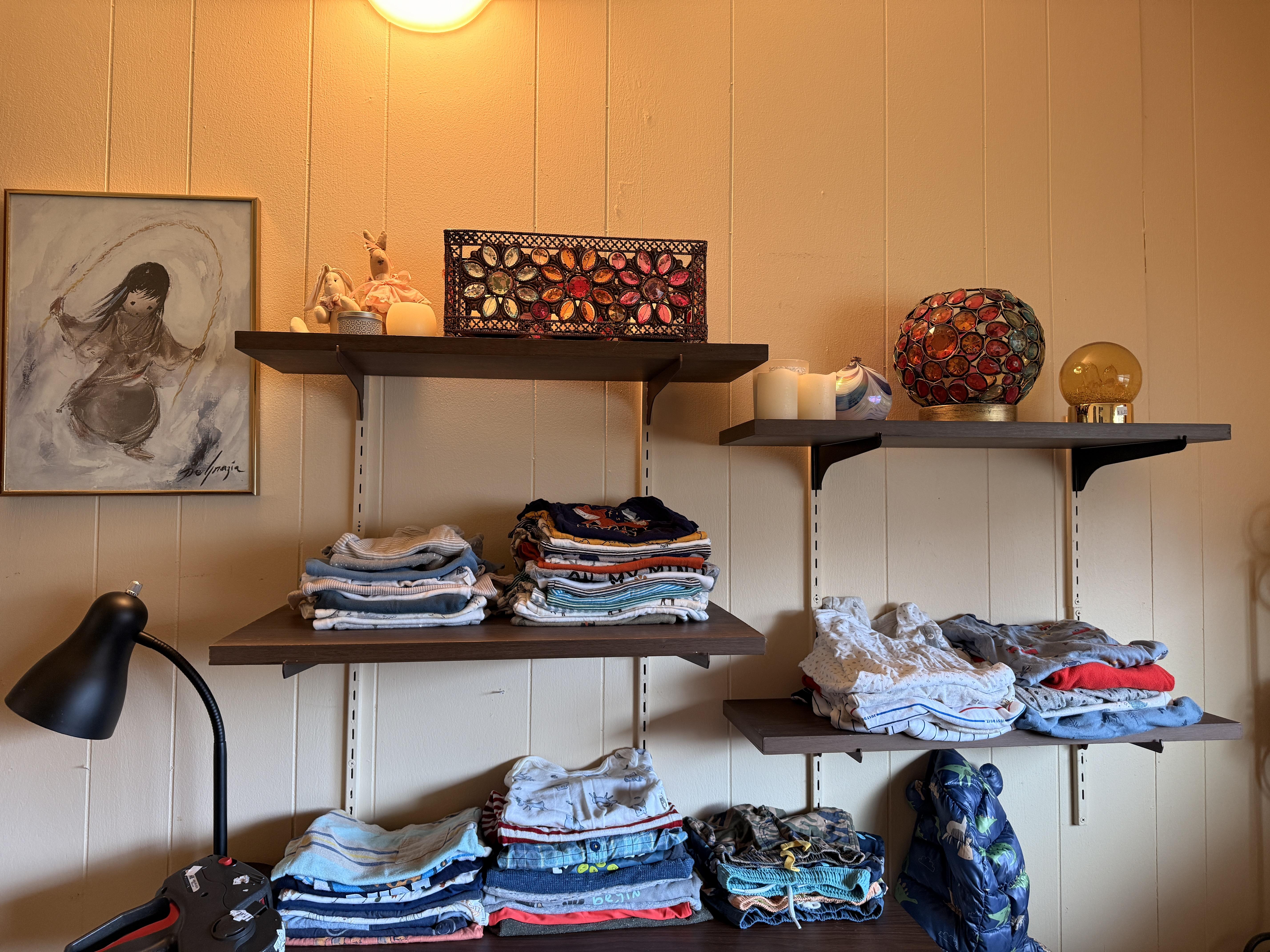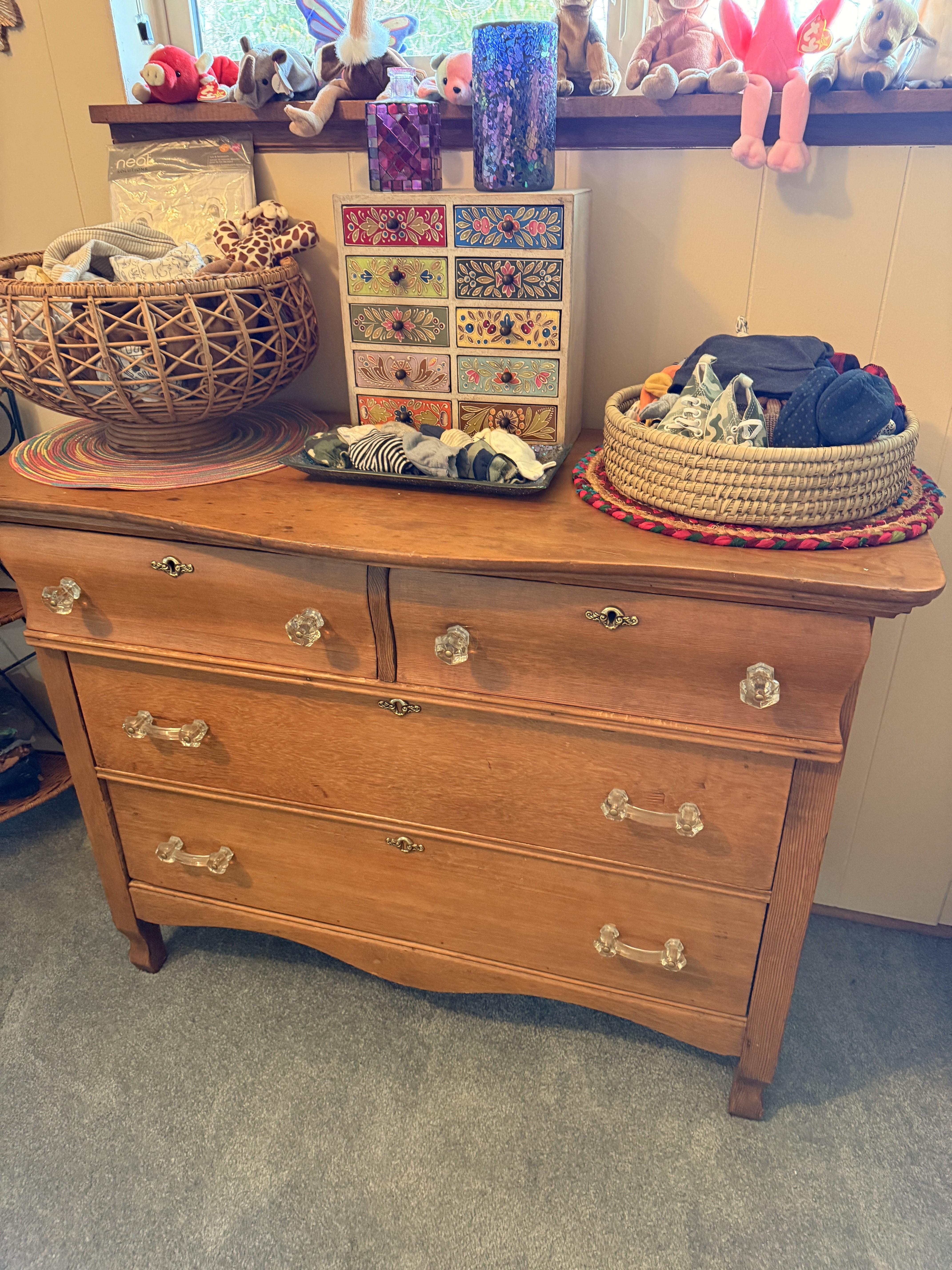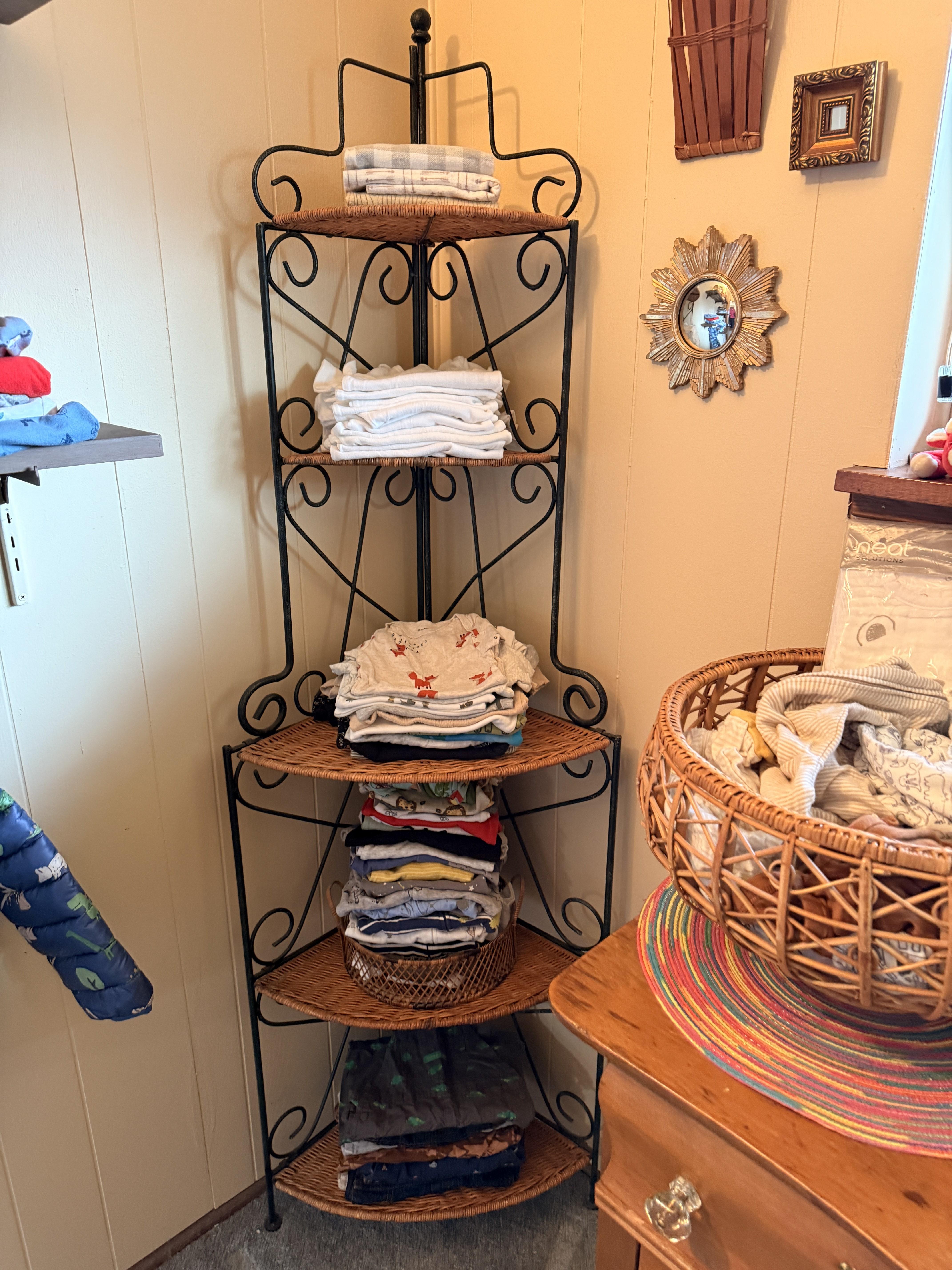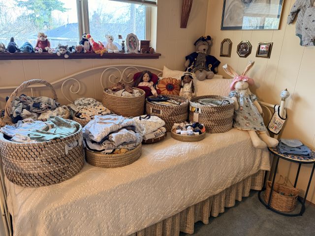 Don't worry, the baby is ok!! Just outgrew a lot of things and some still have tags. Clothing sizes 0-12 months, mostly. SO CUTE!! Bagged up by size and style for your convenience. TONS of them!! Socks, hats, swaddles, coats and more. Sweet white metal day bed, colorful beaded accent pieces, DeGrazia, super cute petite vintage secretary desk, antique oak dresser with glass knobs, some stuffies and toys, corner metal/wicker shelf. If you know someone who is about to, or just had a baby - you simply can't miss this room!