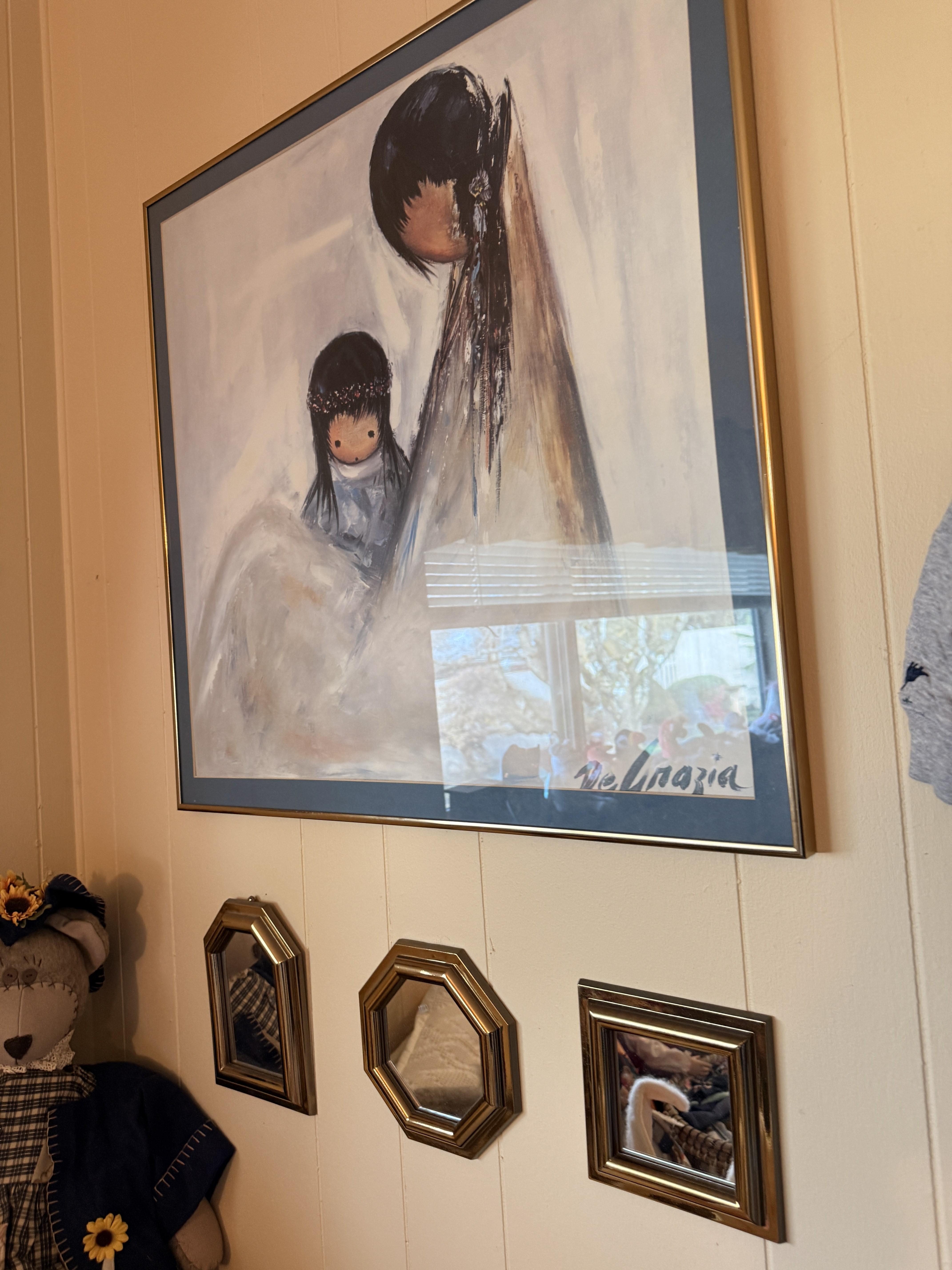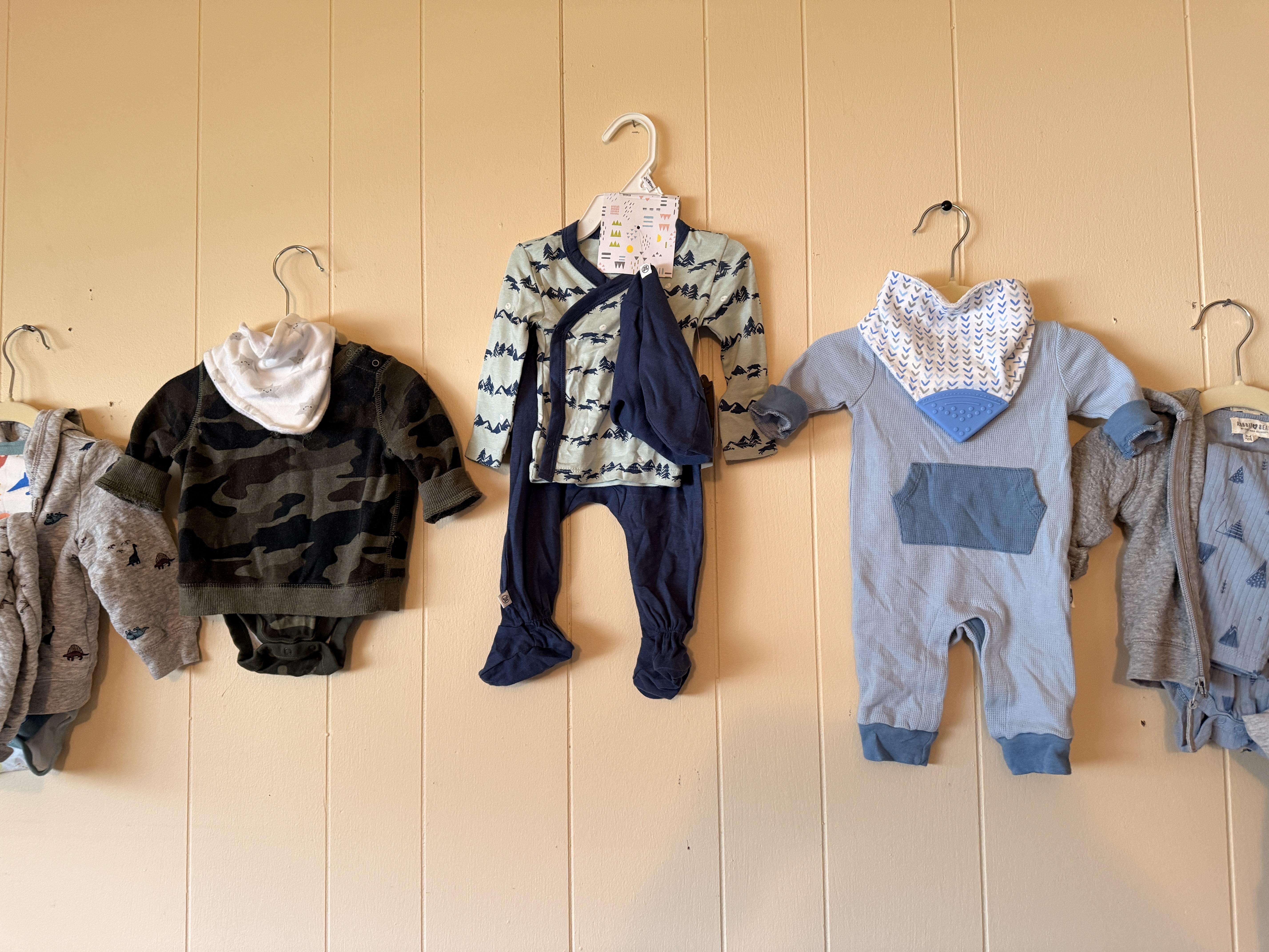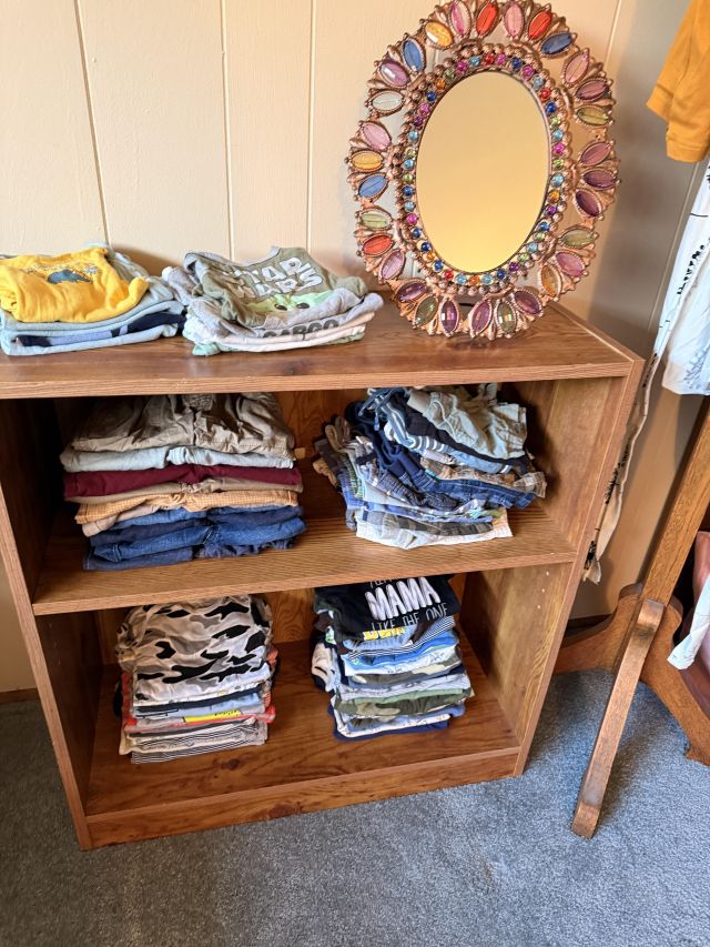 Don't worry, the baby is ok!! Just outgrew a lot of things and some still have tags. Clothing sizes 0-12 months, mostly. SO CUTE!! Bagged up by size and style for your convenience. TONS of them!! Socks, hats, swaddles, coats and more. Sweet white metal day bed, colorful beaded accent pieces, DeGrazia, super cute petite vintage secretary desk, antique oak dresser with glass knobs, some stuffies and toys, corner metal/wicker shelf. If you know someone who is about to, or just had a baby - you simply can't miss this room!