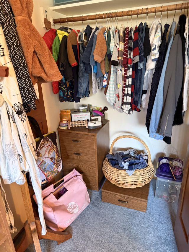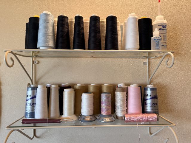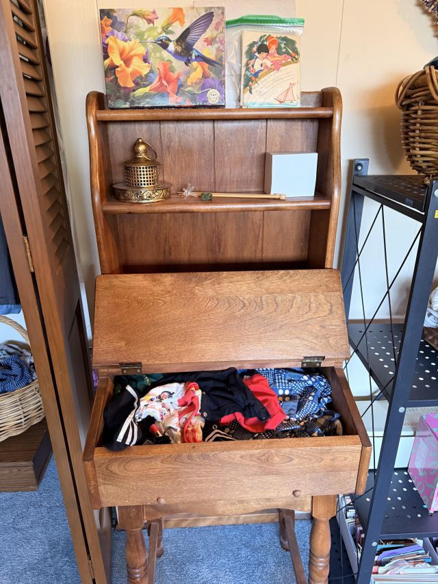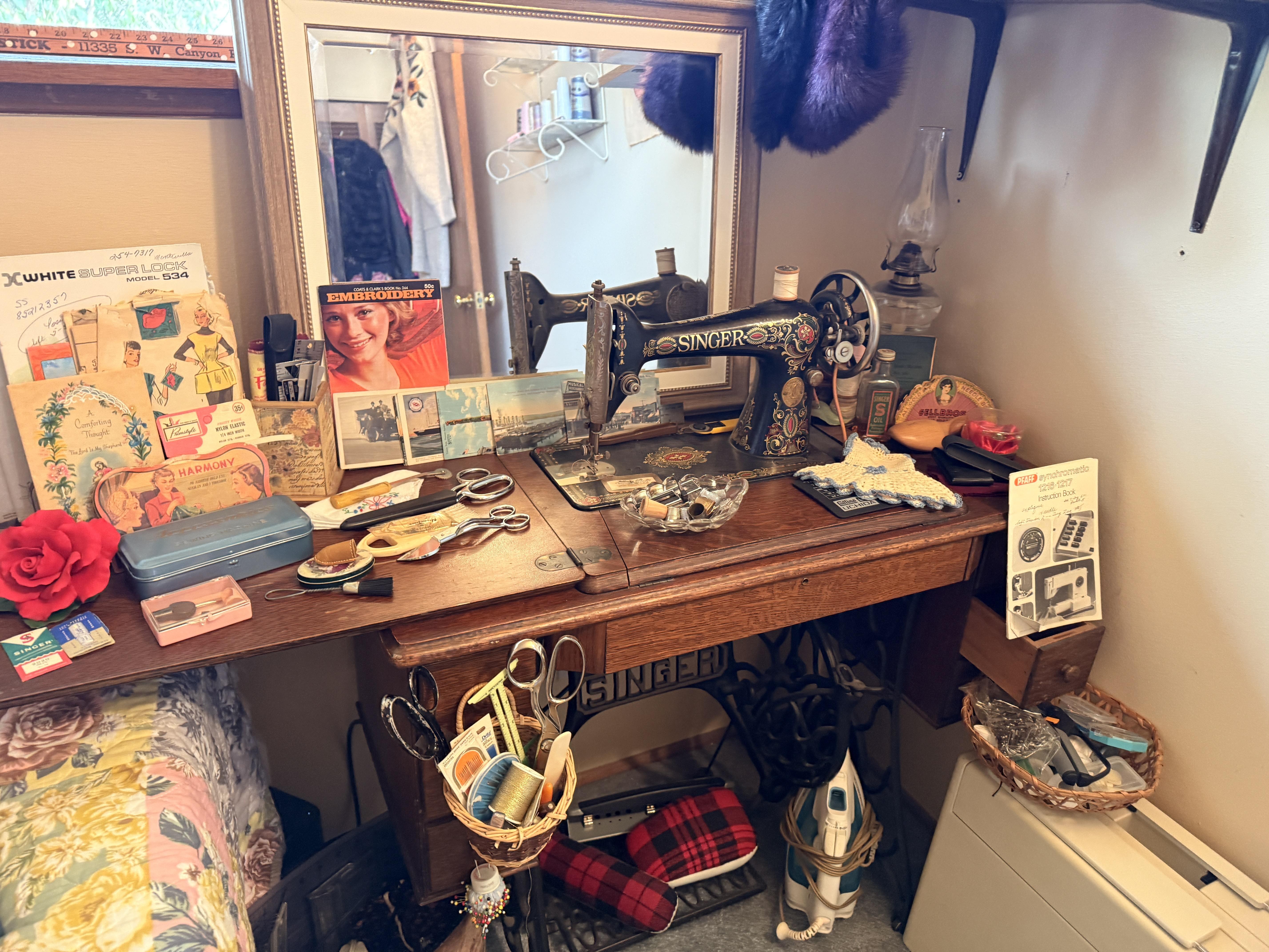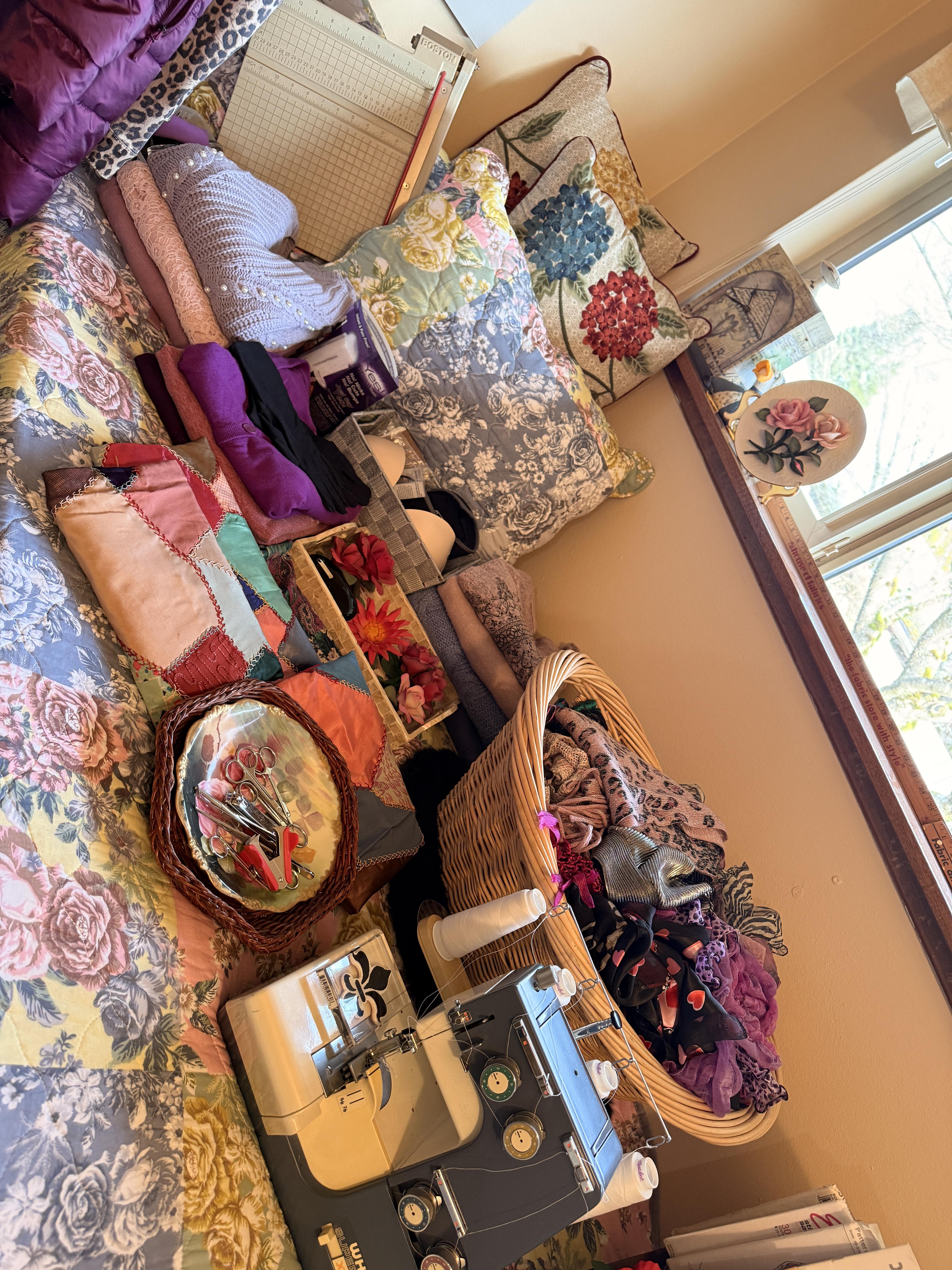 Well... not JUST sewing! Even MORE clothing in here! So full that my rack is starting to bow! Cute vintage metal ironing board, shelf of more clothes and accessories, pillows, scarves, sewing needs, overlock sewing machine, antique Singer machine with table, thread, floral art and more!