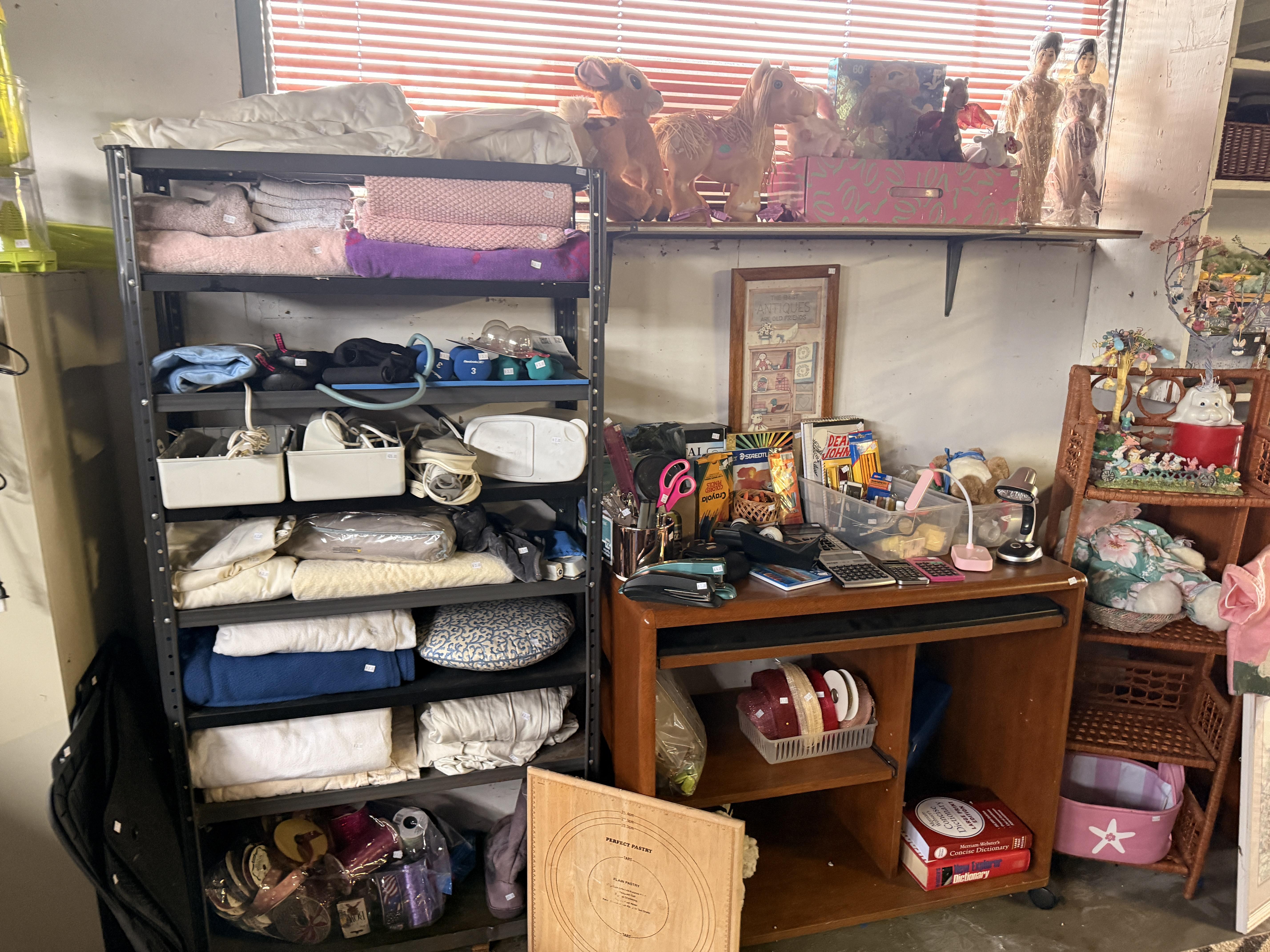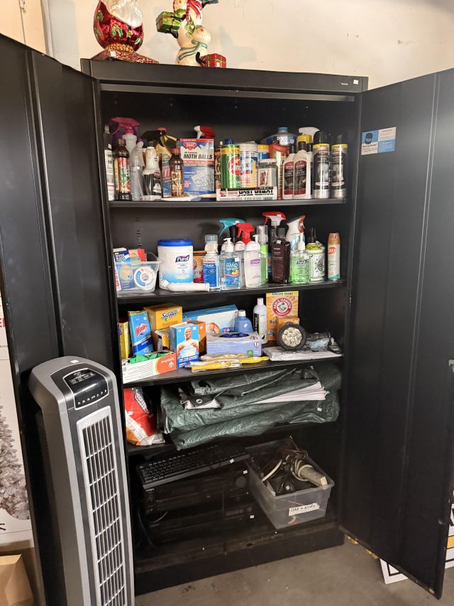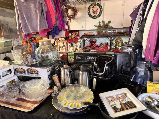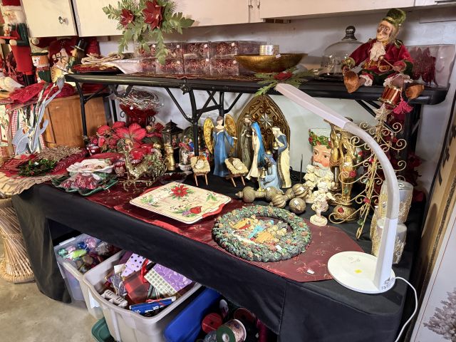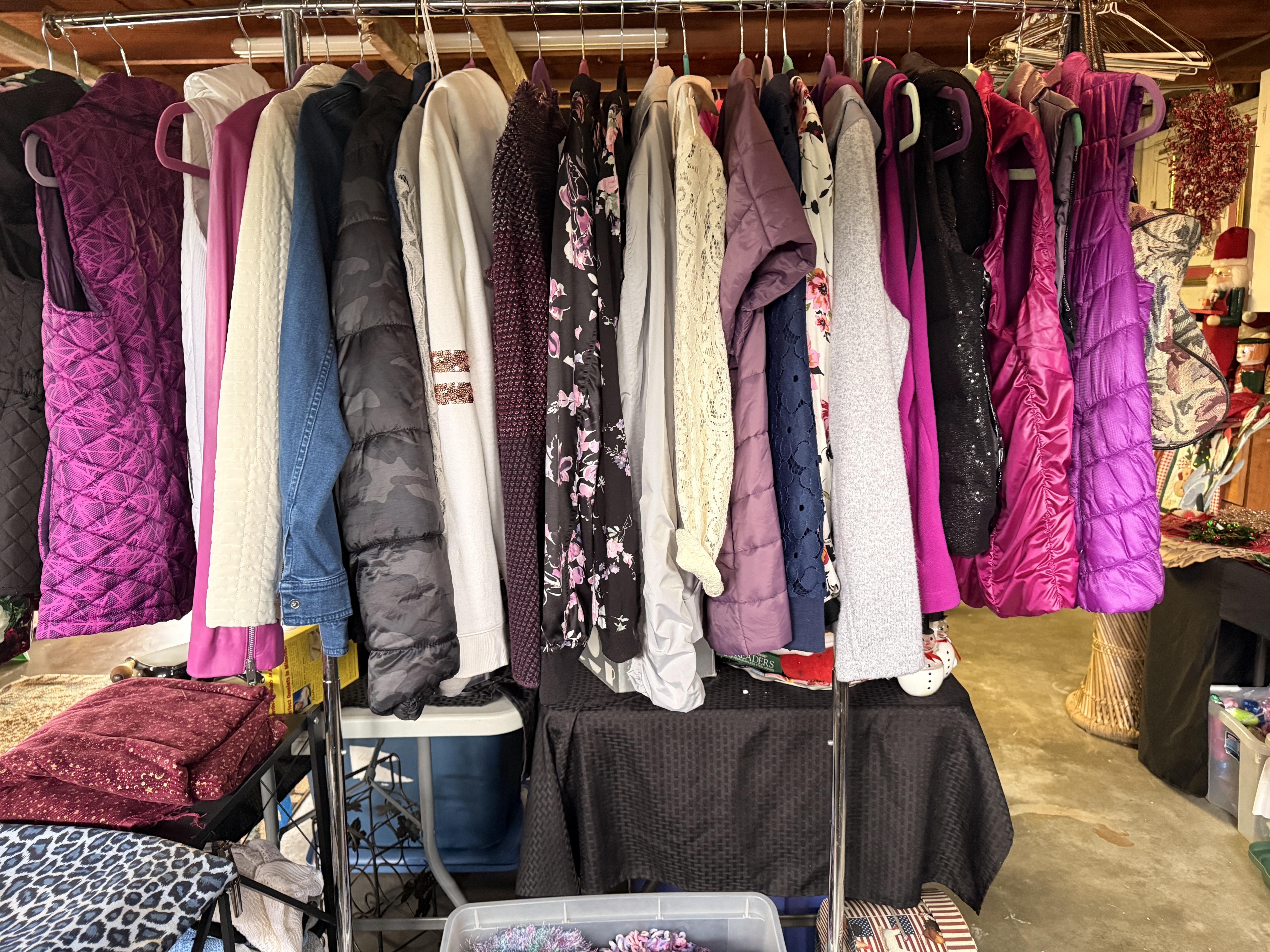 You will have to step outside to get to the garage - but it's covered right there. Of course there are more clothes! But it's not just that.... We've got lots of Christmas items, including a boxed flocked tree. Black metal cabinet full of household chemicals and misc, office supplies, some toys, kitchen items - some NIB, hand tools, dresser, fans, storage pieces. There's some really fun things in this garage :)