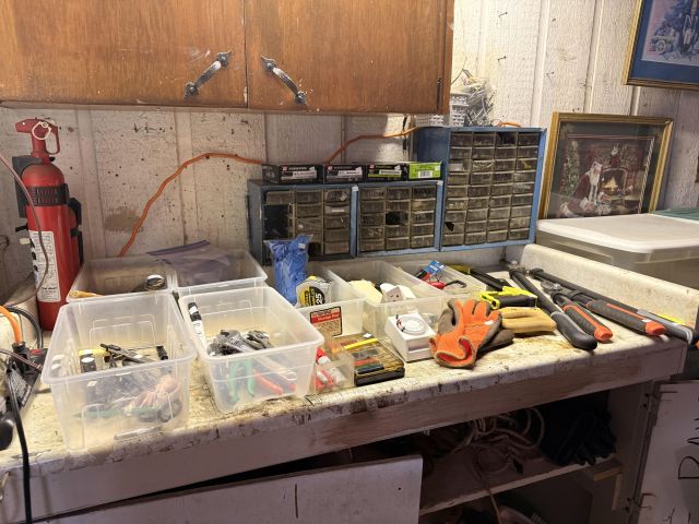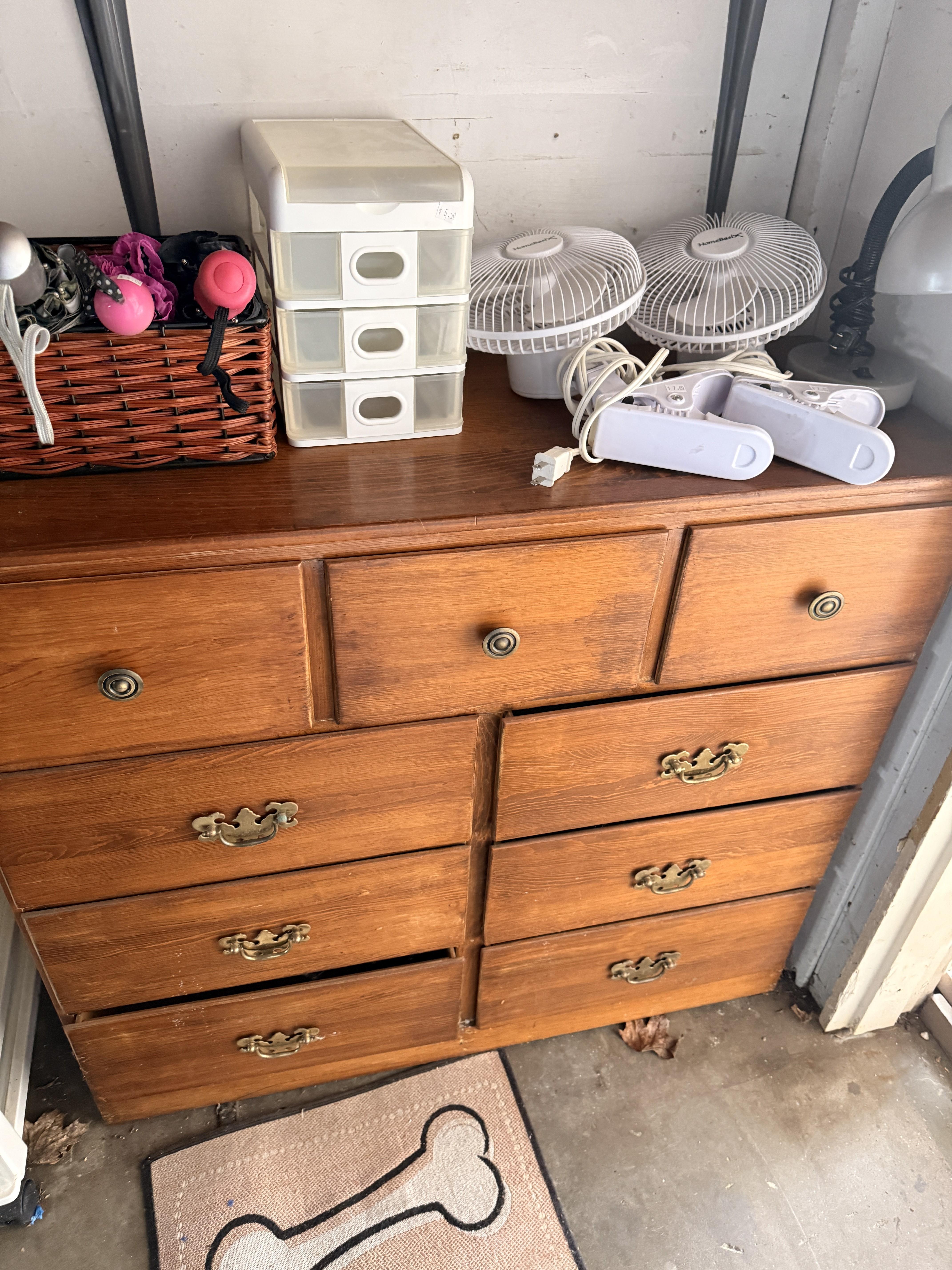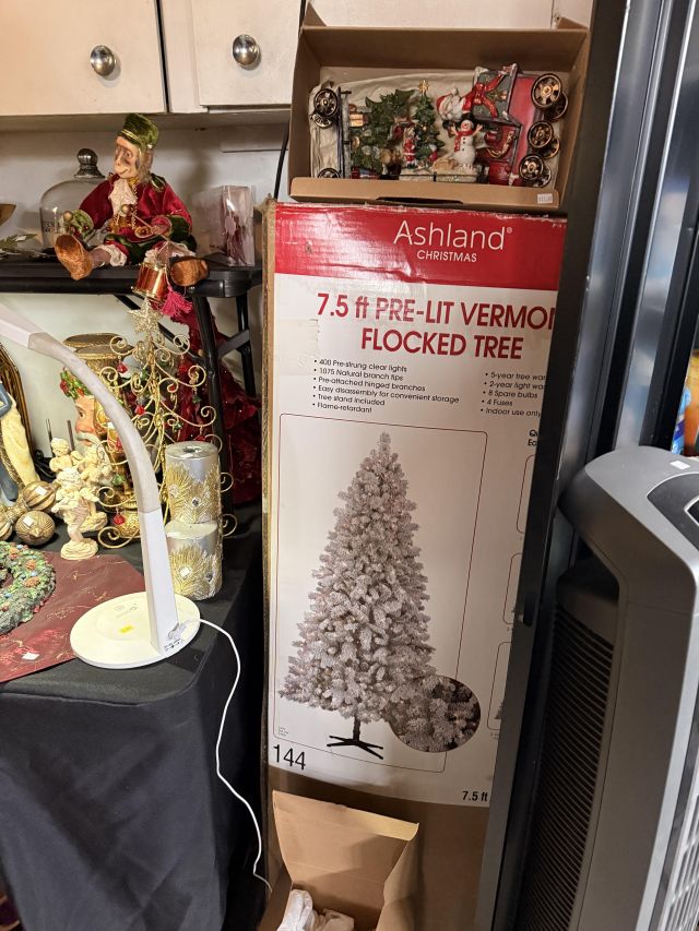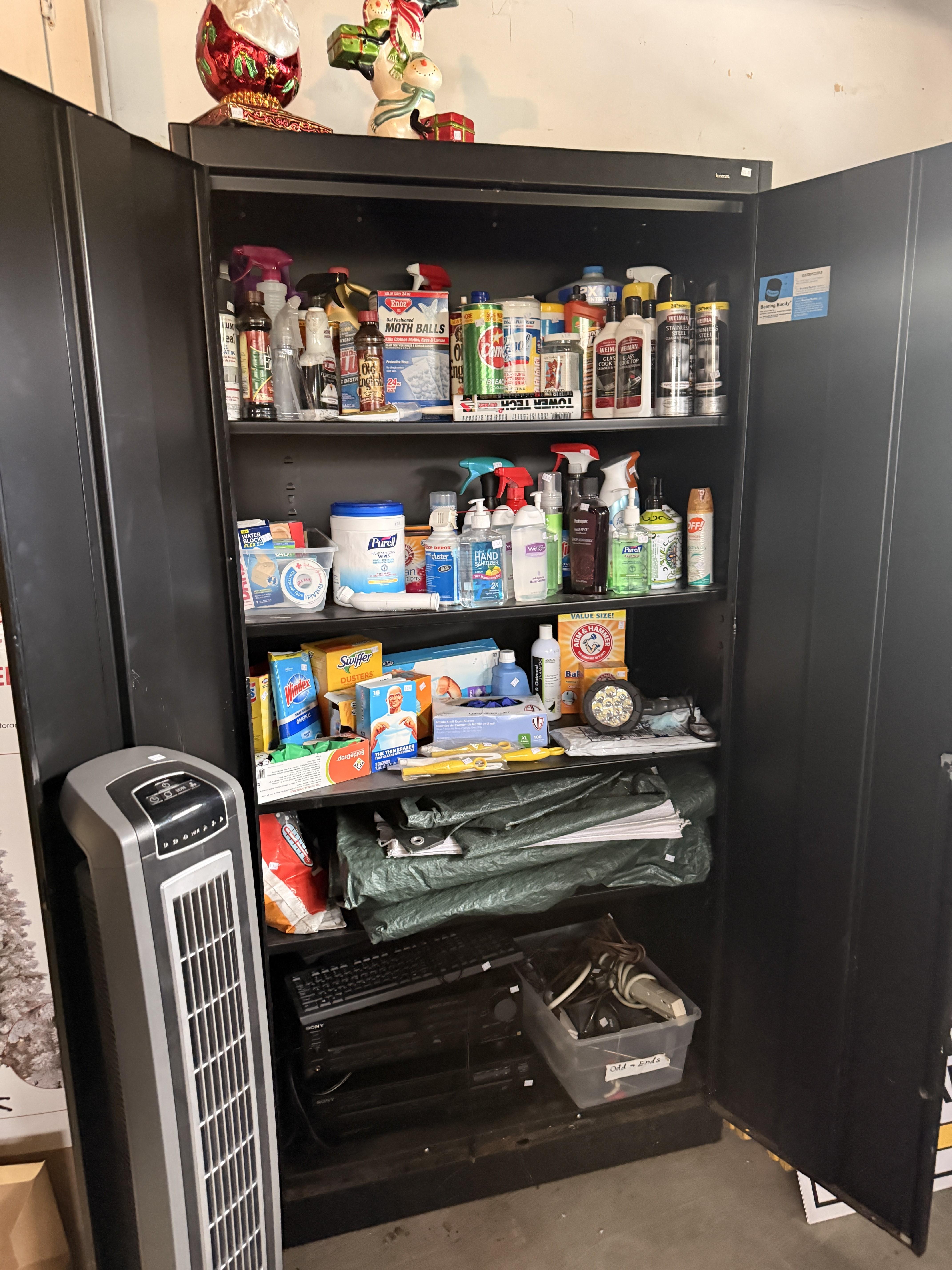 You will have to step outside to get to the garage - but it's covered right there. Of course there are more clothes! But it's not just that.... We've got lots of Christmas items, including a boxed flocked tree. Black metal cabinet full of household chemicals and misc, office supplies, some toys, kitchen items - some NIB, hand tools, dresser, fans, storage pieces. There's some really fun things in this garage :)