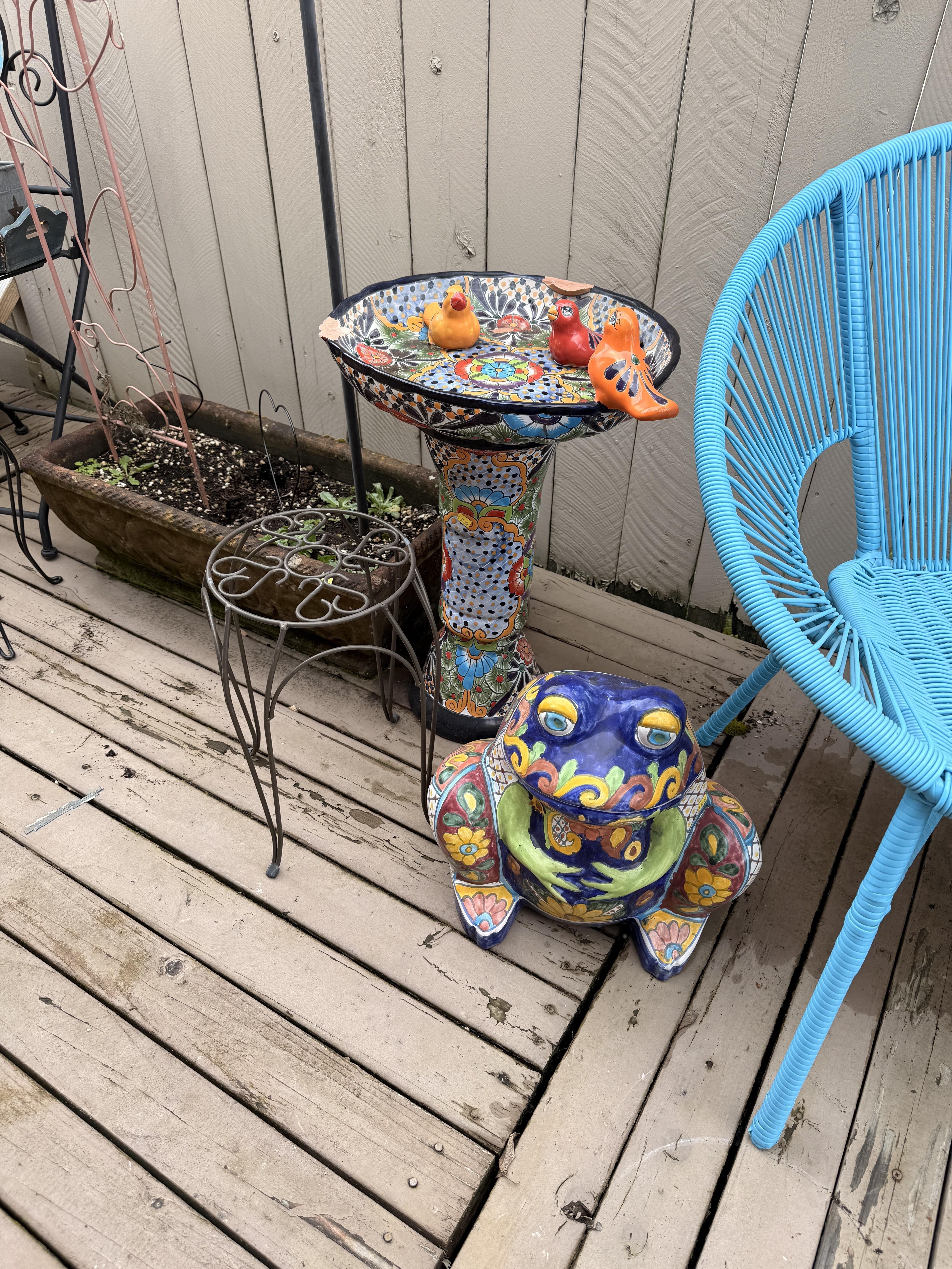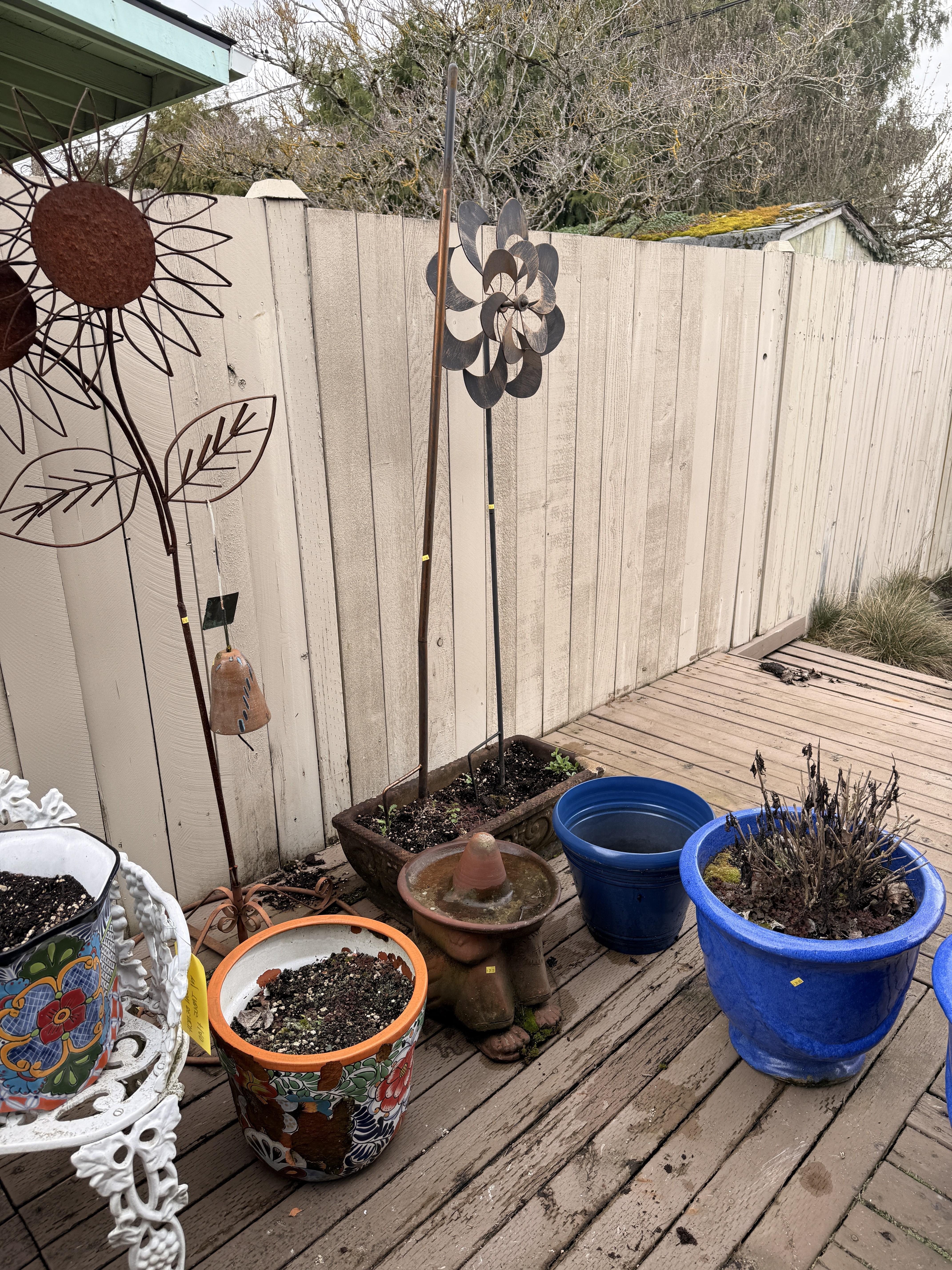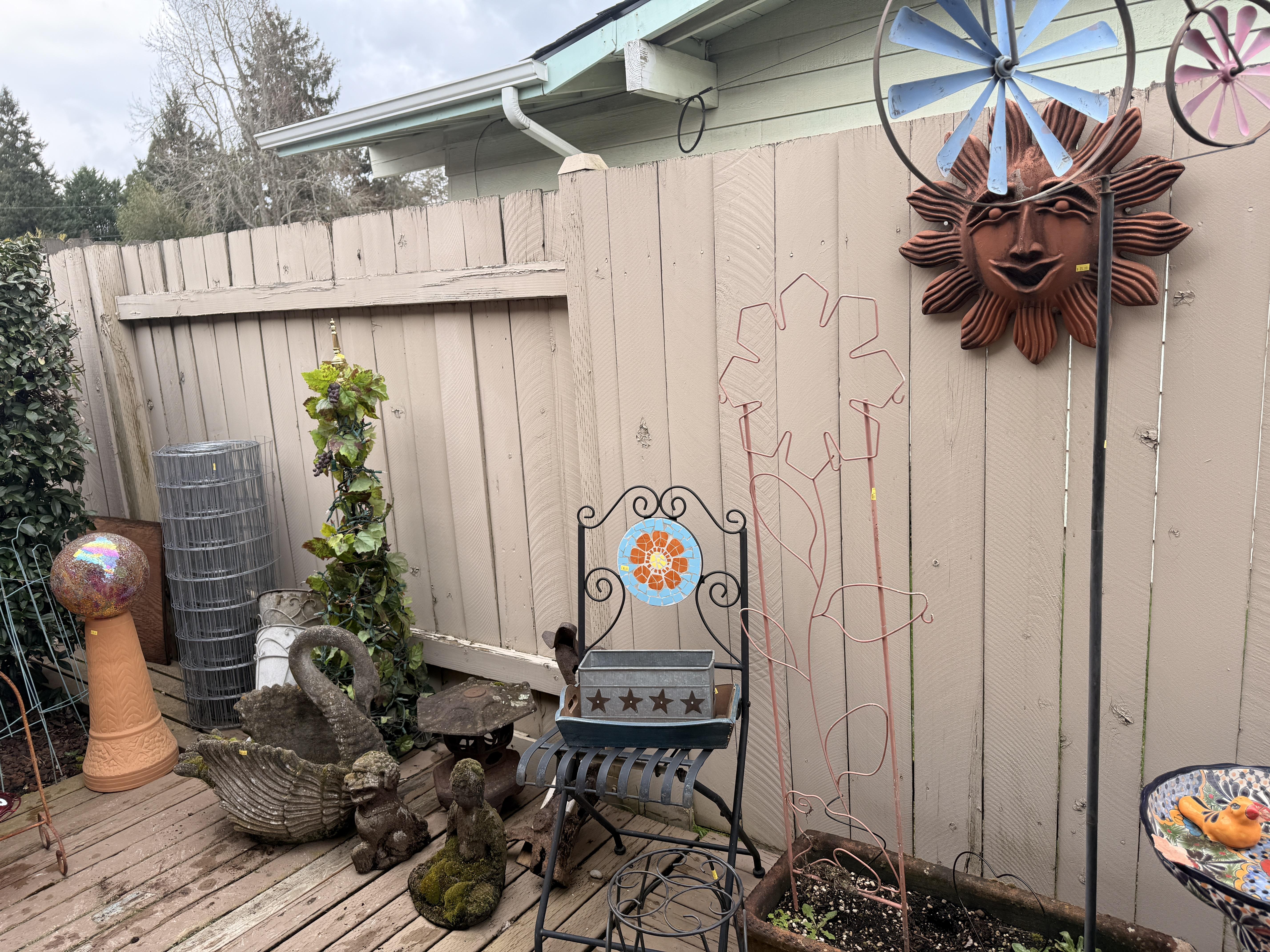 THREE turquoise steel frame round disc outdoor chairs! So cool. Lots of colorful Mexican pottery, white cast iron bench with table, terra cotta and blue pots, yard art, black metal outdoor patio set, patio umbrella, white metal nesting tables, peacock solar lit glass bird bath - in box! Around the corner off the deck you'll find cabinets full of yard and garden chemicals and supplies, yard tools, metal and wood bench, and more outdoor decor.