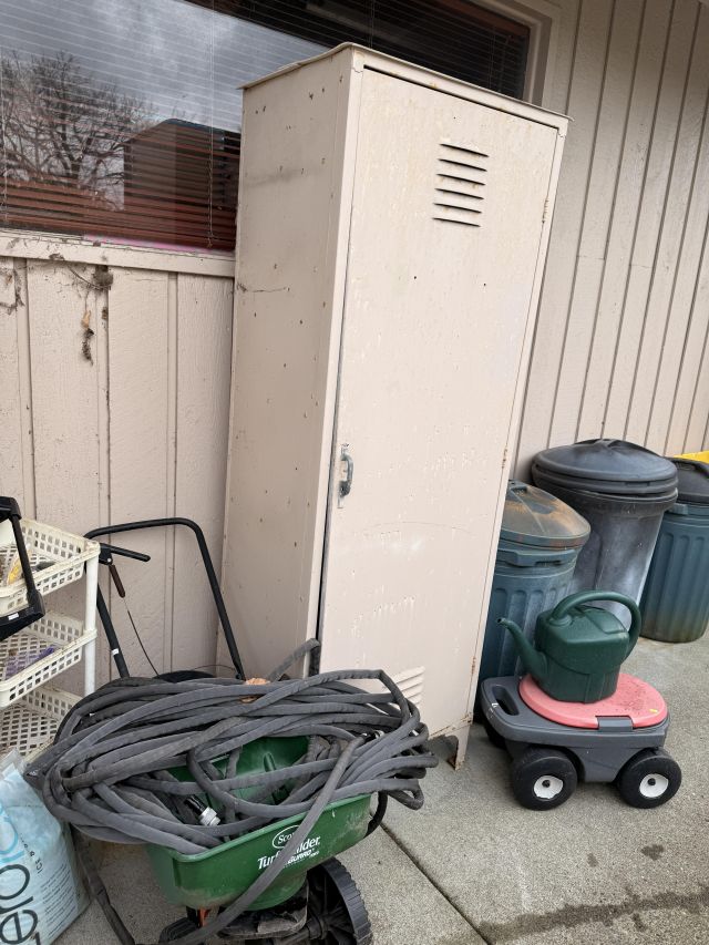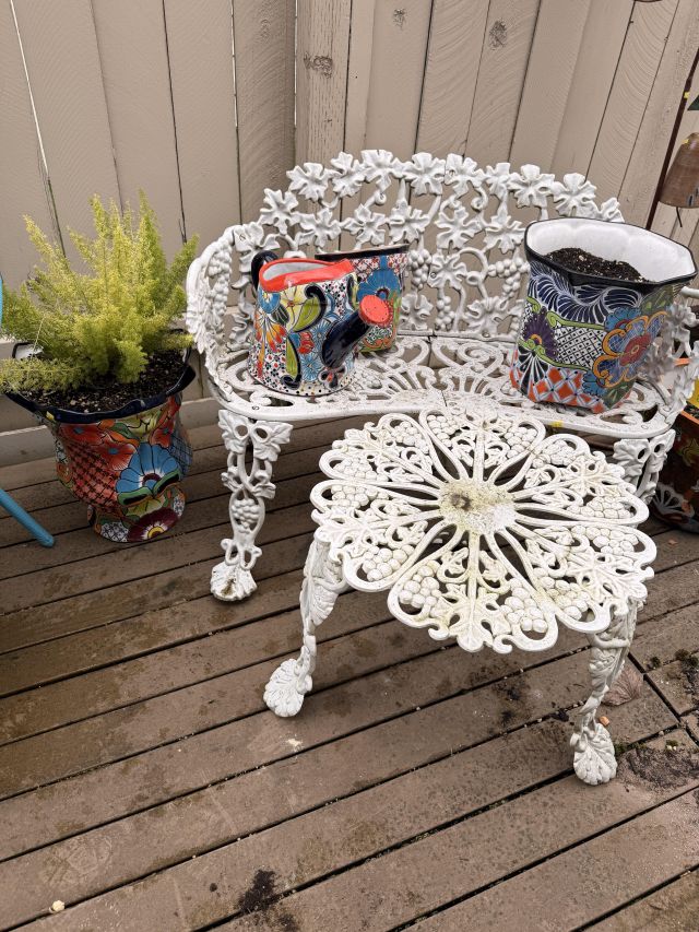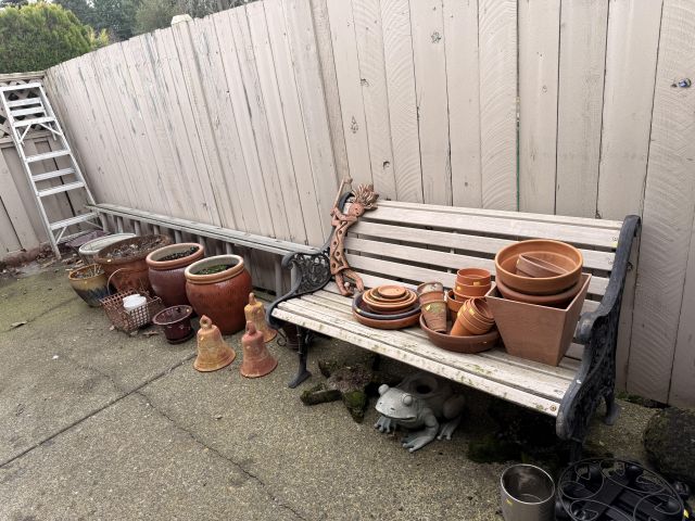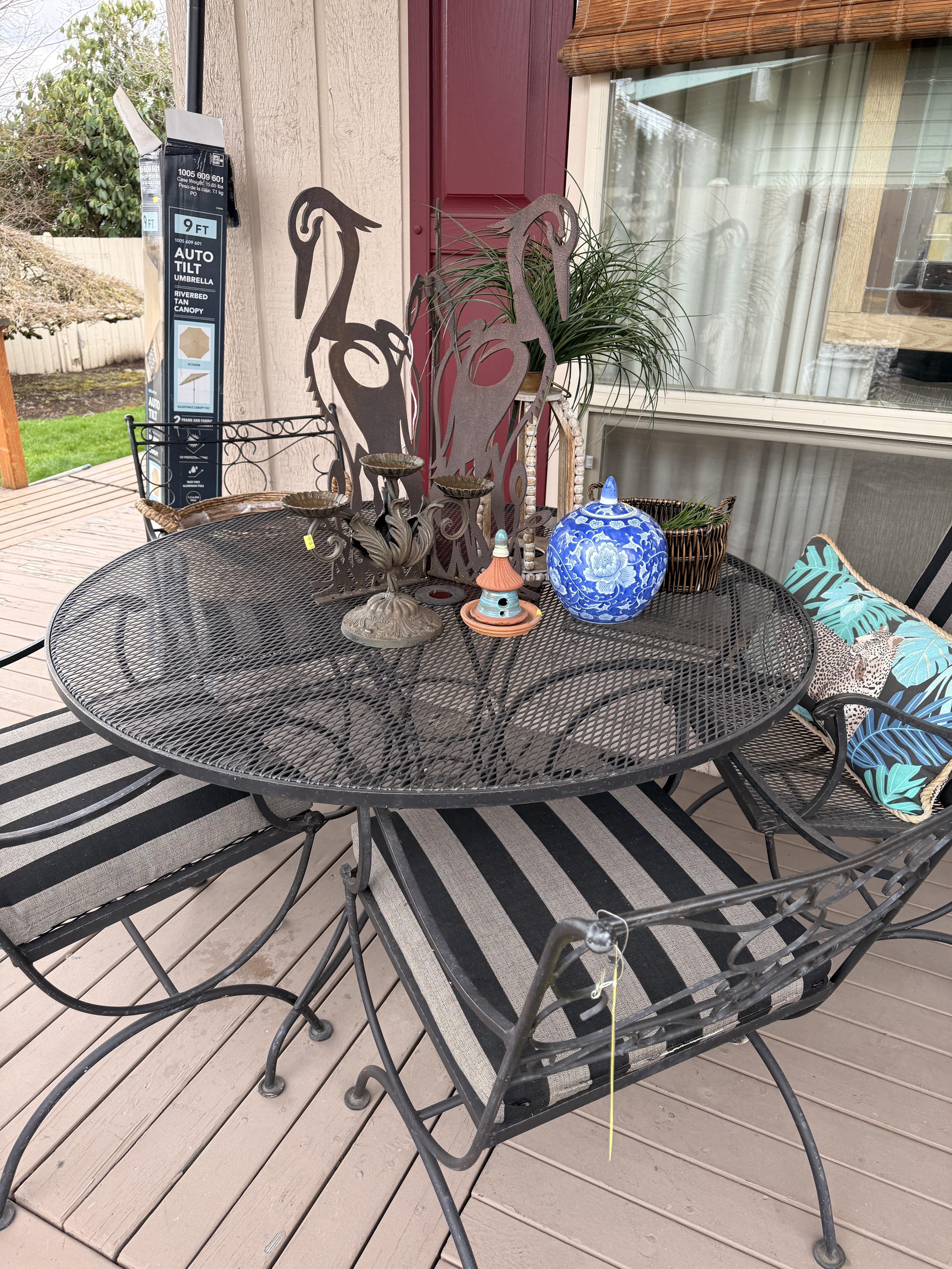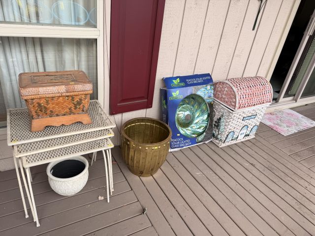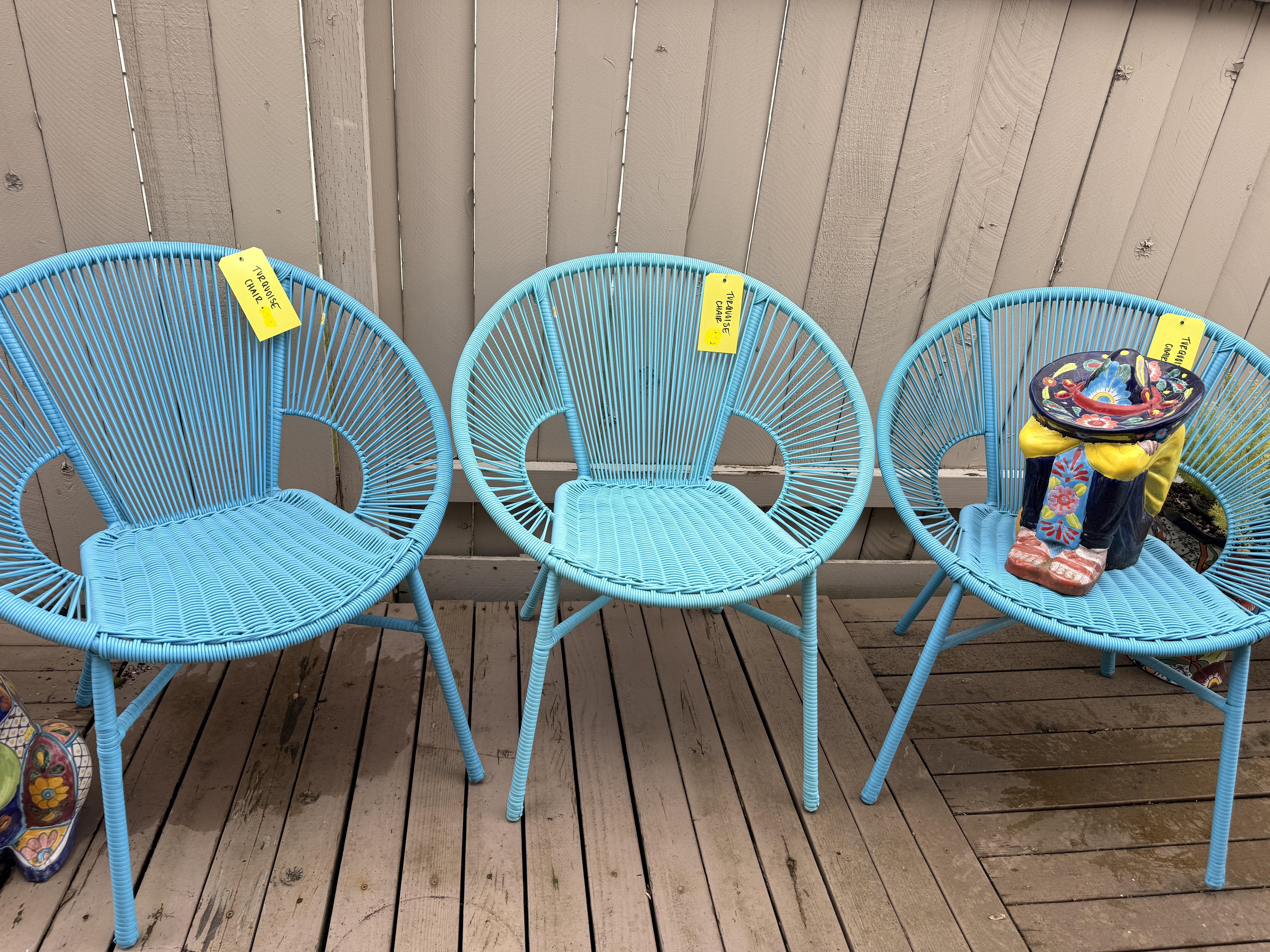 THREE turquoise steel frame round disc outdoor chairs! So cool. Lots of colorful Mexican pottery, white cast iron bench with table, terra cotta and blue pots, yard art, black metal outdoor patio set, patio umbrella, white metal nesting tables, peacock solar lit glass bird bath - in box! Around the corner off the deck you'll find cabinets full of yard and garden chemicals and supplies, yard tools, metal and wood bench, and more outdoor decor.