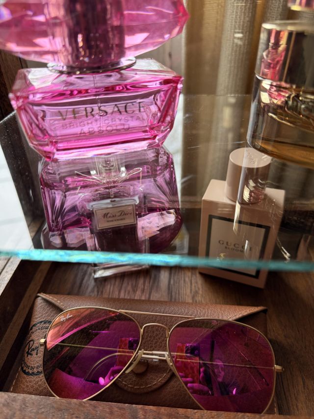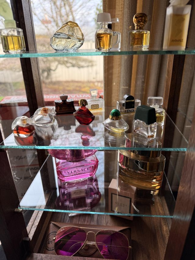 Perfumes in a case (with the sunglasses) - Gucci, Versace, Michael Kors, Dior. Several collectible miniatures as well.