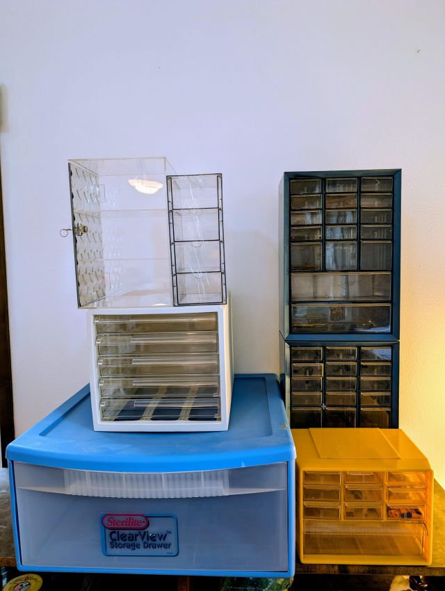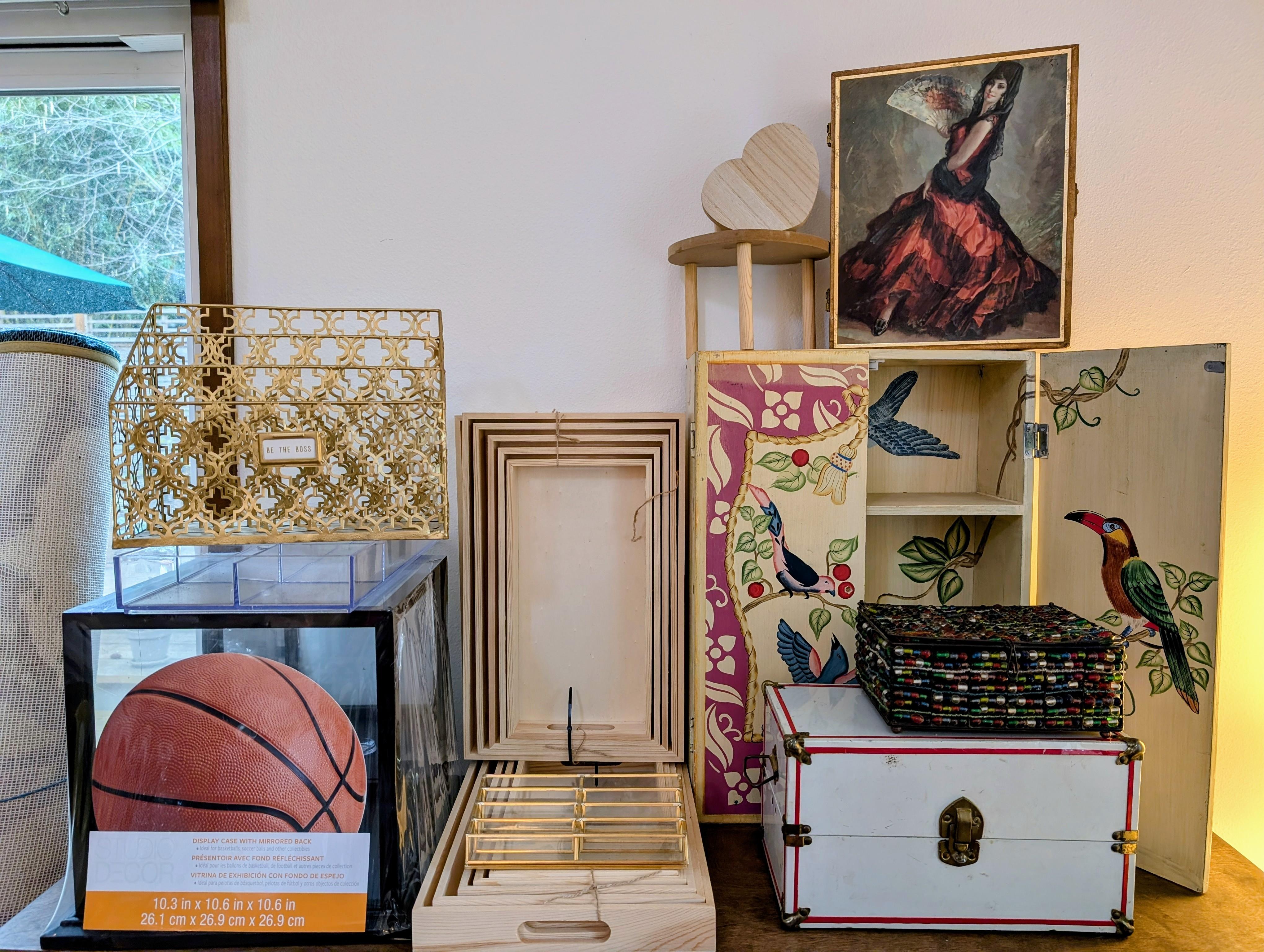 1960s-1990s jazz and rock Records; newer & vintage Clothing in a range of sizes X-Small through Plus Sizes: blouses, skirts, jackets, coats, dresses; newer & vintage Accessories: hats, gloves, bags & purses, scarves, and shoes (in a variety of sizes); decorative figurines and dishes; newer & vintage Linens & Fabric: window curtains, quilts, throw pillows, aprons, towels, tablecloths, napkins and fabric; vintage Vanity Items: powder boxes, compacts, perfume bottles; vintage Furniture: glamorous mirrored tall free standing jewelry case, wood and glass standing display case, wooden bookcases, wooden stand, wooden chest of drawers, wooden computer desk; Holiday Decor: newer Easter/Spring decor items, and newer and vintage glass Christmas ornaments in an array of colors; Stationery: greeting cards, and notebooks; Jigsaw Puzzles: 500-1,000 piece jigsaw puzzles; Kid's Books and Toys: chapter books and graphic novels, stuffed animals and various toys; new in box Picture frames and vintage picture frames; decorative boxes, storage drawers and parts cabinets, and much more!