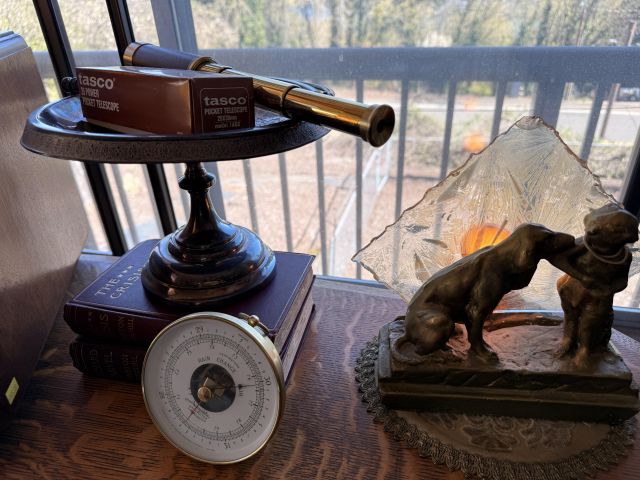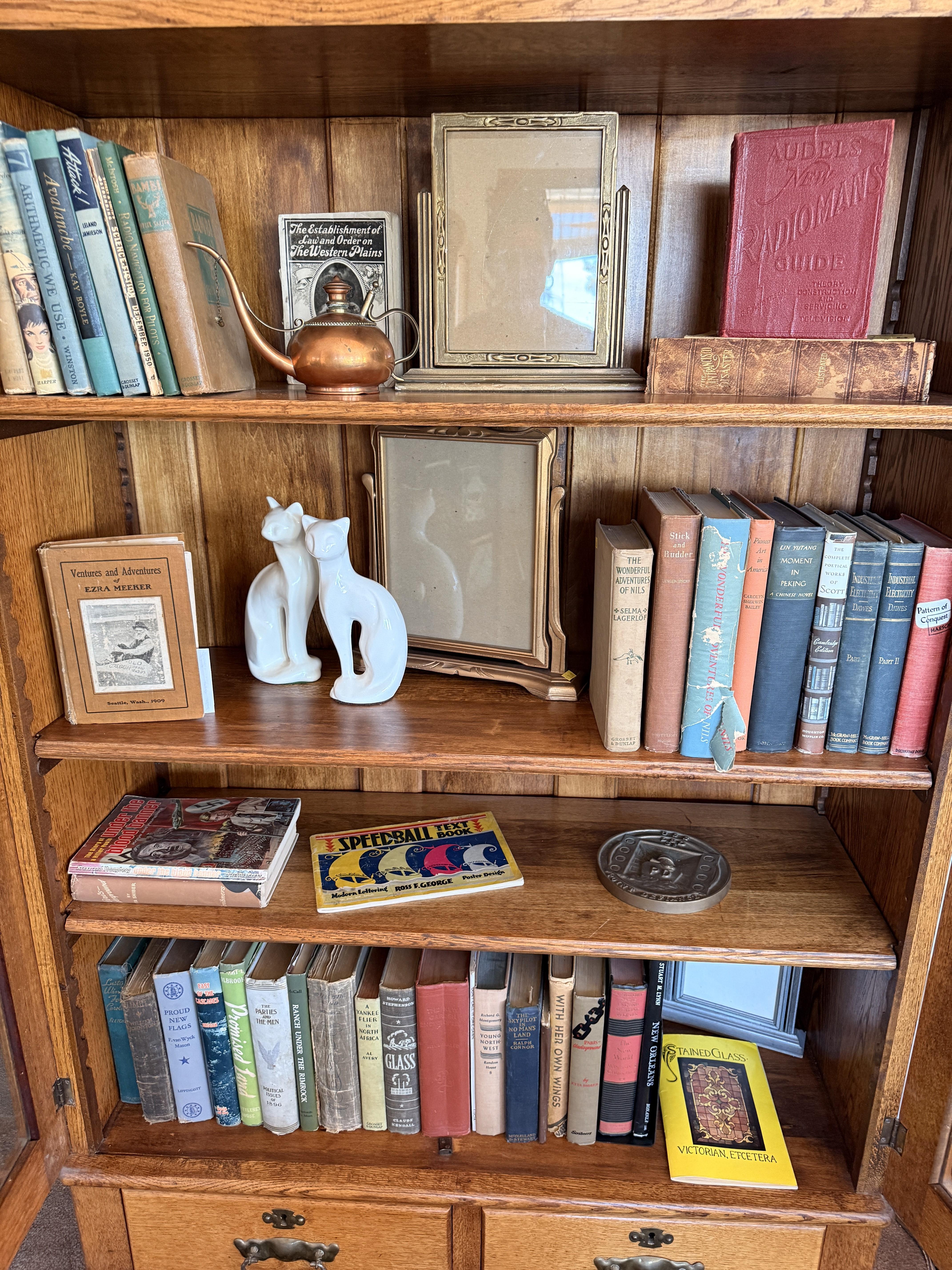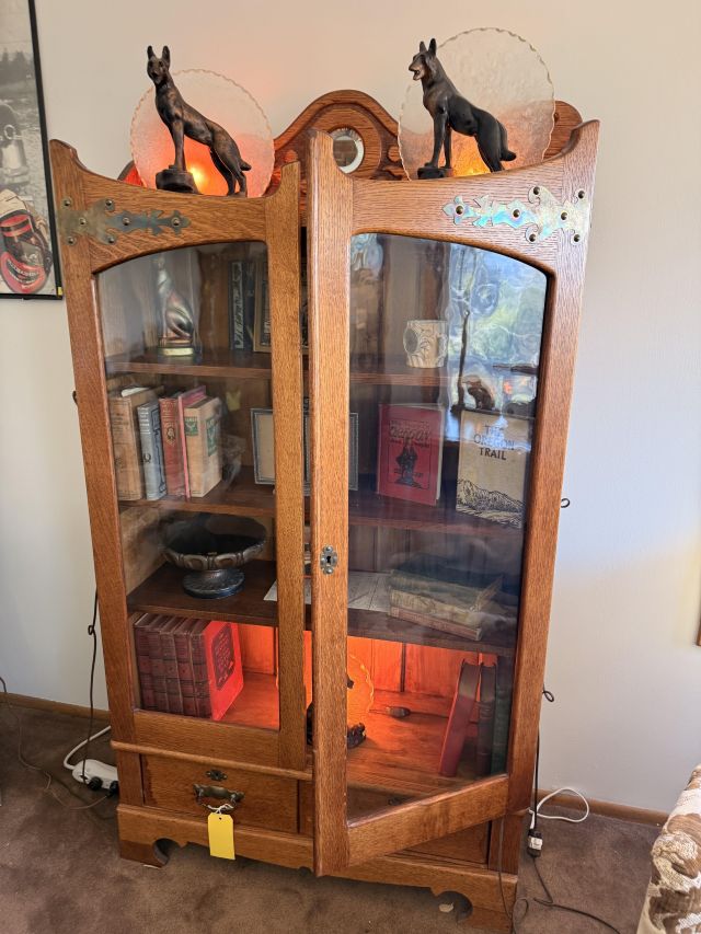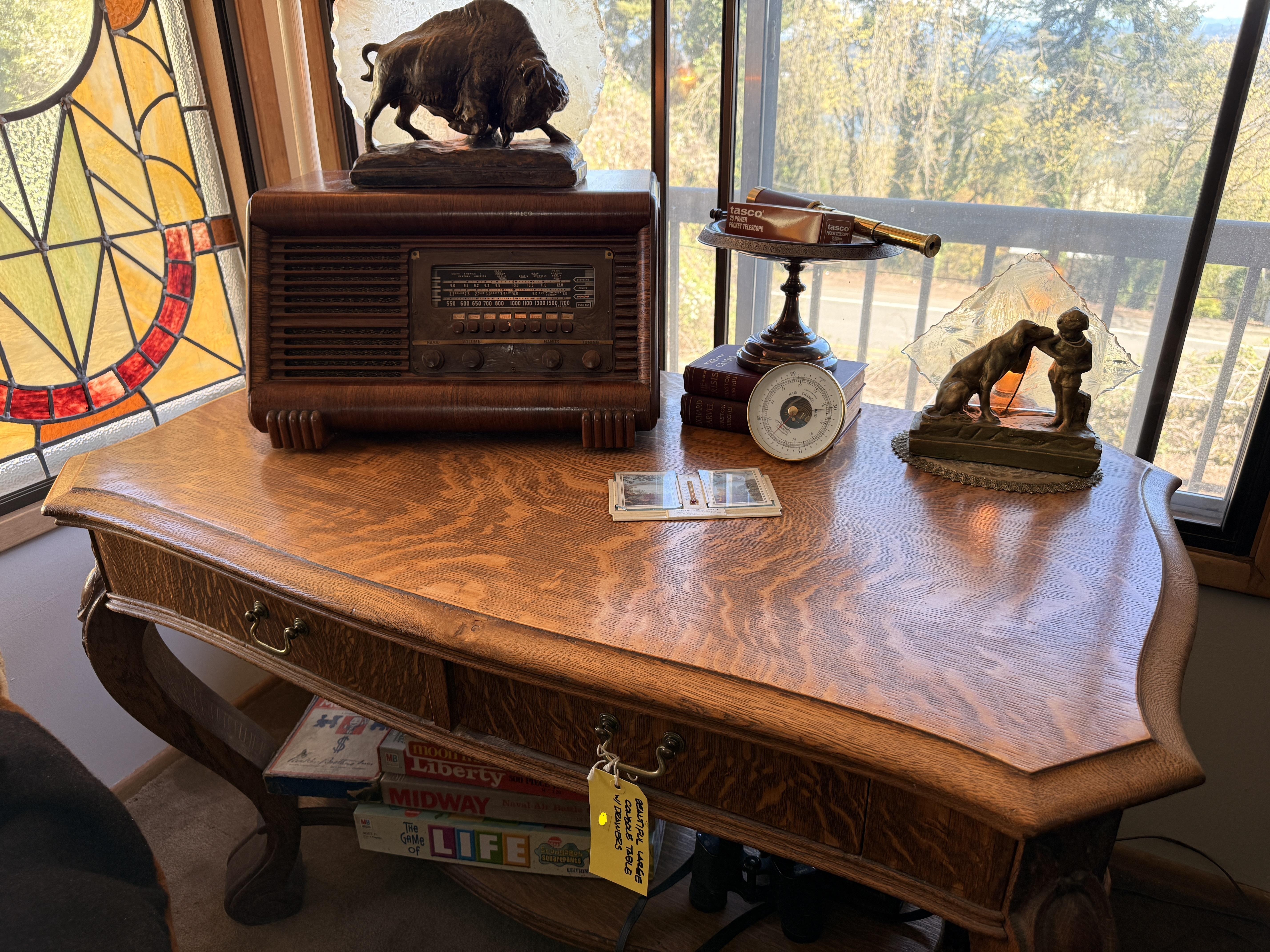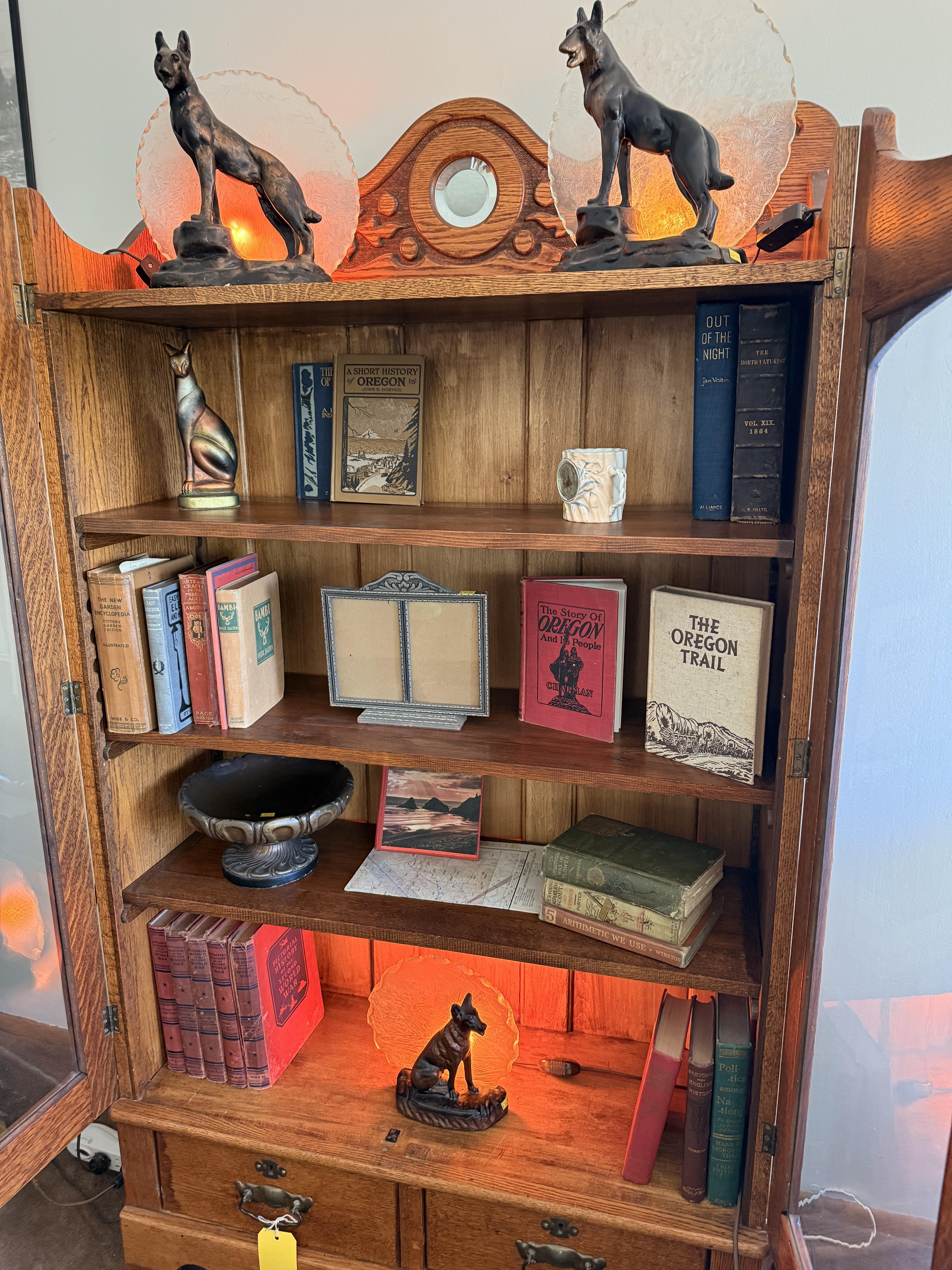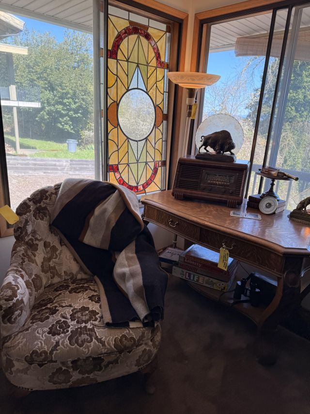 As you enter, you will see a gorgeous classic antique oak hall tree... turn to the left and you'll enter the living room where there are more great pieces! TWO incredible antique oak cabinets with glass fronts. These are not your usual curved front curios... these are very unique and have the coolest shelf structure inside. Speaking of inside - in the cabinets are lots of old books, including several on Portland and the PNW. Cat figures, swing frames, copper teapot and other interesting finds! On top of one - there is a Nipper salt and pepper set, as well as a great record holder with marble record. The lamps - oh my, the lamps! I know there is a name and I'm sure someone will come tell me at the sale - but I cannot find what they are called! But what I do know is that they are amazing. I usually only see one in a blue moon (no pun intended) - but here we have several. Art deco style figural lamps with the cut glass behind the figure - dogs, buffalo, ships.... they are wonderful and all work! Back to furniture - we have two antique oak accent tables - one with claw feet and the other with a FACE on the claw feet! Super cute antique sofa with matching chairs, oak coffee table and a gorgeous desk. Antique style floor lamps, glass - including uranium, pottery, and... some real Portland history. Don't shoot the seller! We've got a tabletop antique radio (works!), brass telescope, some games, binoculars, fantastic stained glass, copper boiler and an incredible mirror front wardrobe cabinet.