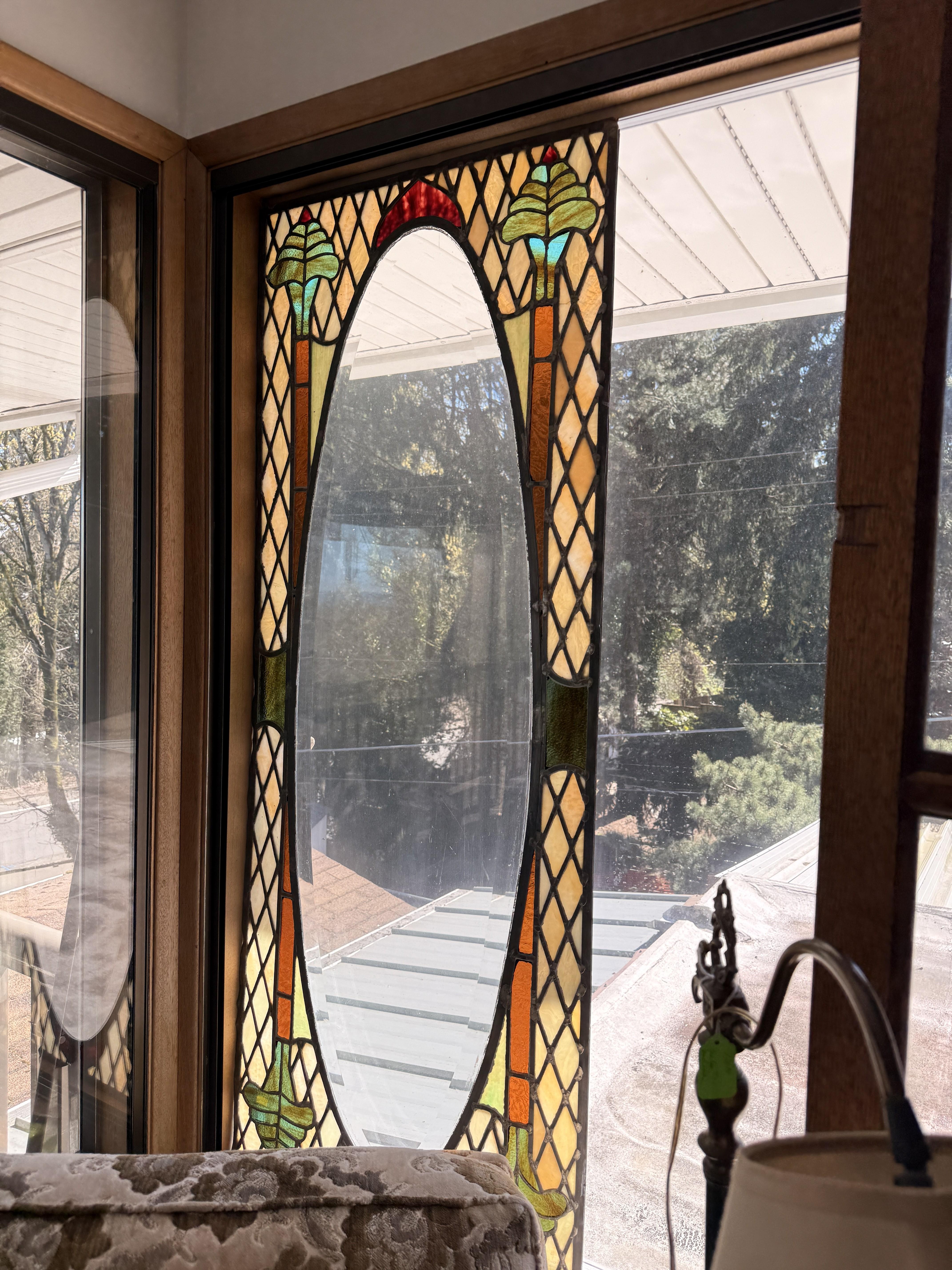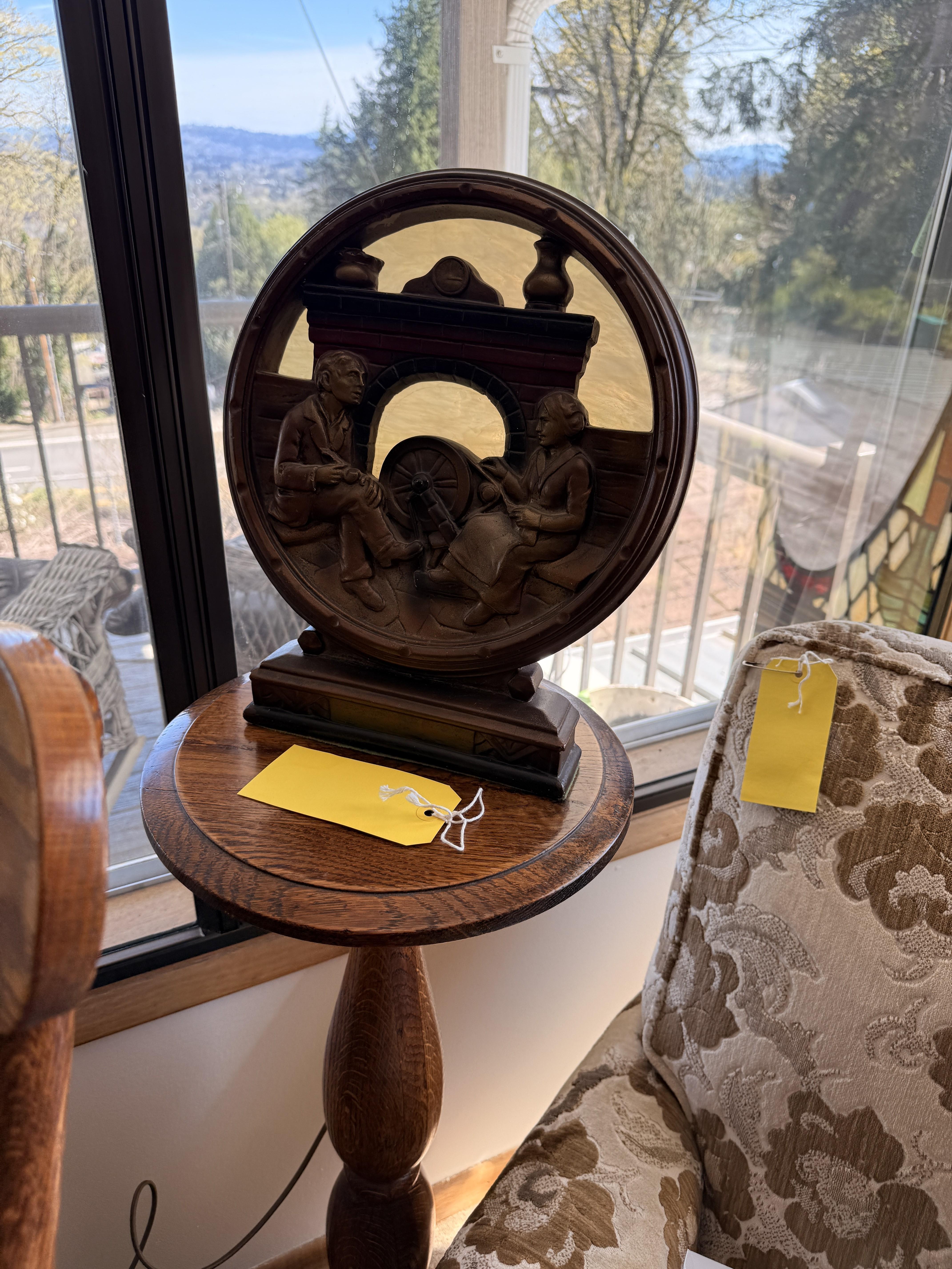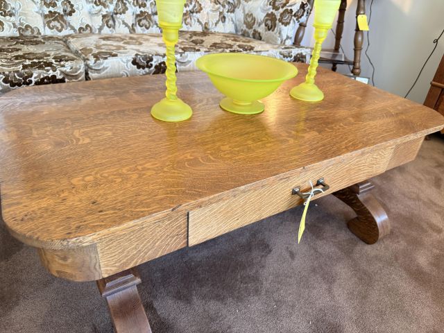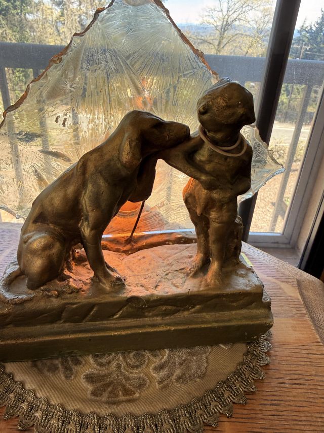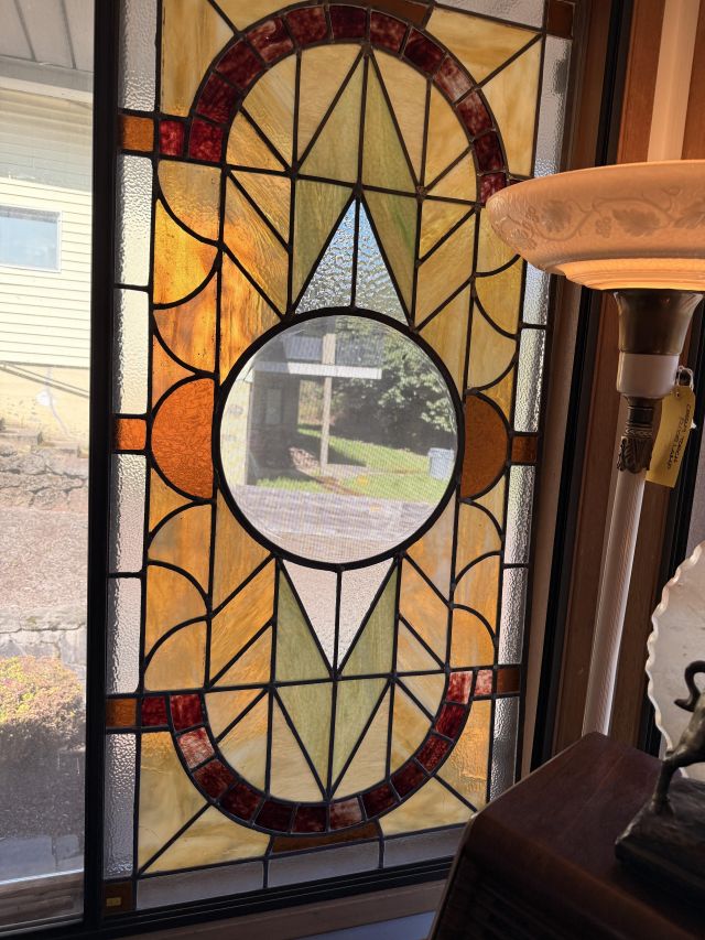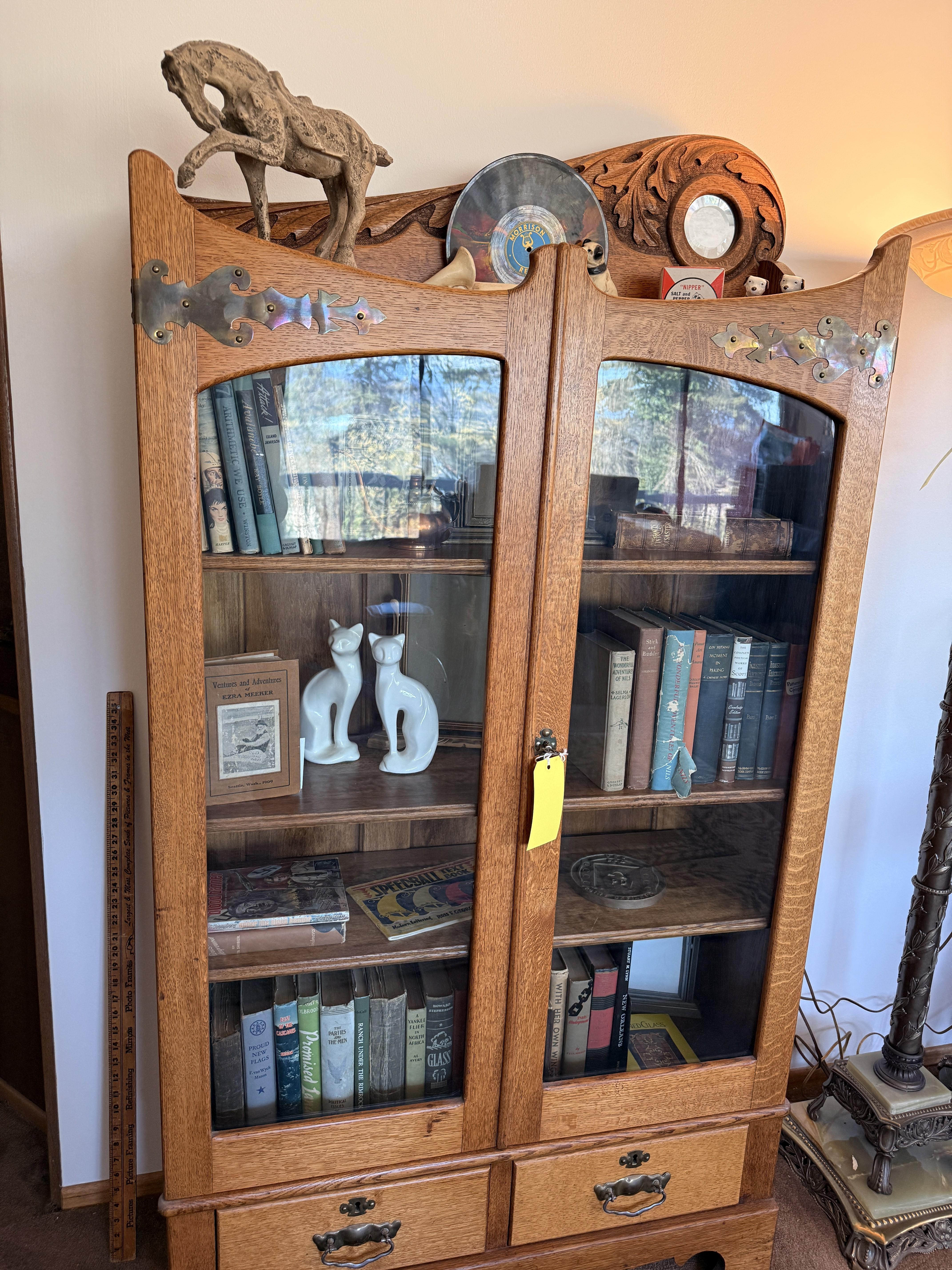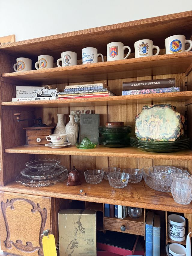 As you enter, you will see a gorgeous classic antique oak hall tree... turn to the left and you'll enter the living room where there are more great pieces! TWO incredible antique oak cabinets with glass fronts. These are not your usual curved front curios... these are very unique and have the coolest shelf structure inside. Speaking of inside - in the cabinets are lots of old books, including several on Portland and the PNW. Cat figures, swing frames, copper teapot and other interesting finds! On top of one - there is a Nipper salt and pepper set, as well as a great record holder with marble record. The lamps - oh my, the lamps! I know there is a name and I'm sure someone will come tell me at the sale - but I cannot find what they are called! But what I do know is that they are amazing. I usually only see one in a blue moon (no pun intended) - but here we have several. Art deco style figural lamps with the cut glass behind the figure - dogs, buffalo, ships.... they are wonderful and all work! Back to furniture - we have two antique oak accent tables - one with claw feet and the other with a FACE on the claw feet! Super cute antique sofa with matching chairs, oak coffee table and a gorgeous desk. Antique style floor lamps, glass - including uranium, pottery, and... some real Portland history. Don't shoot the seller! We've got a tabletop antique radio (works!), brass telescope, some games, binoculars, fantastic stained glass, copper boiler and an incredible mirror front wardrobe cabinet.