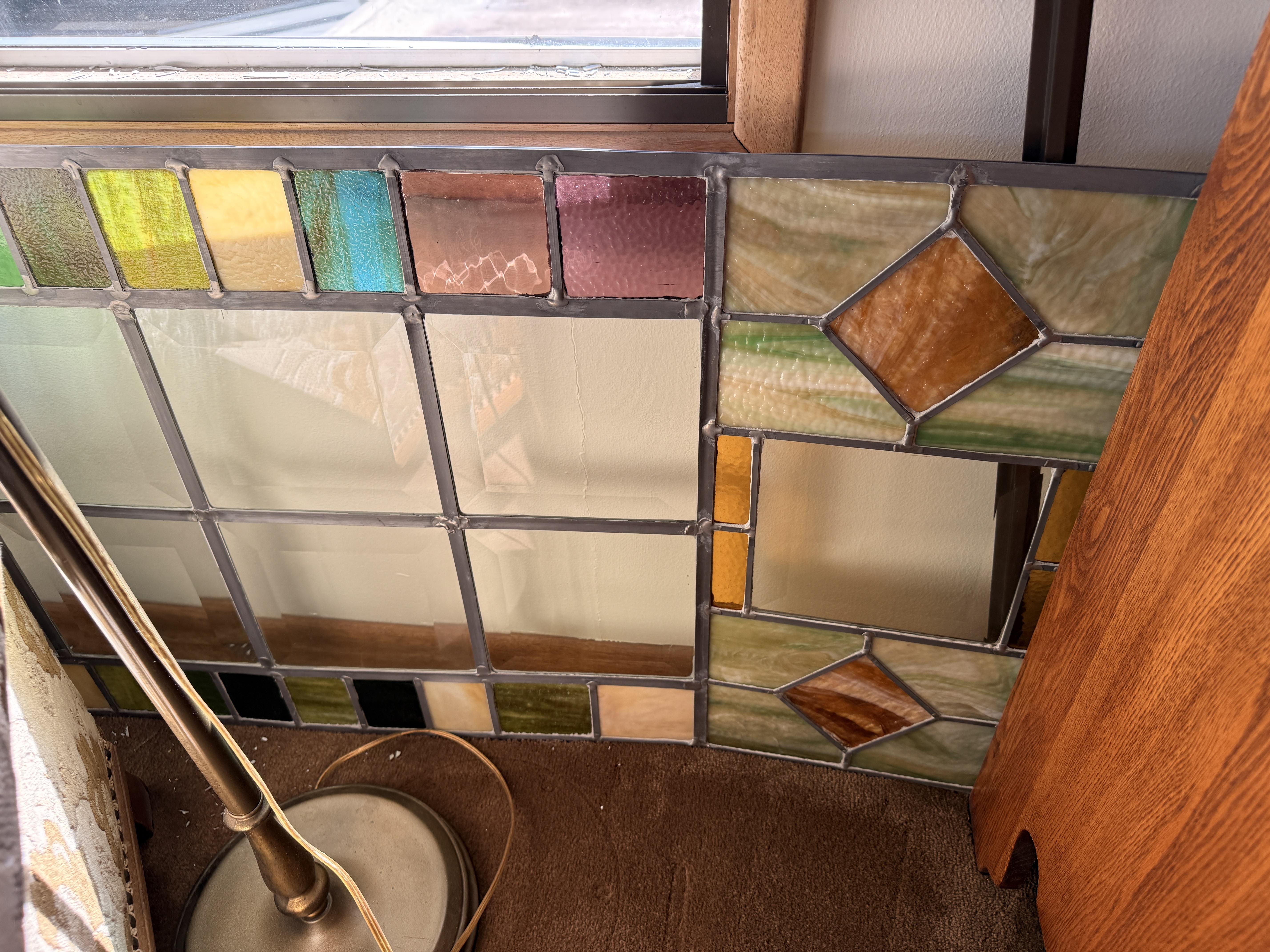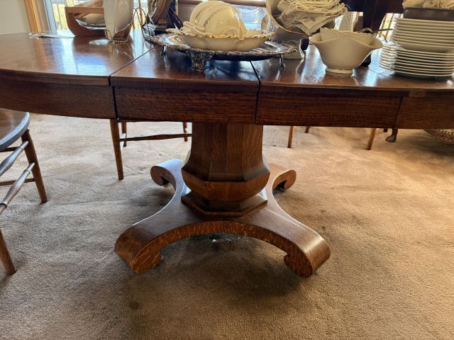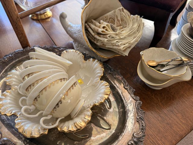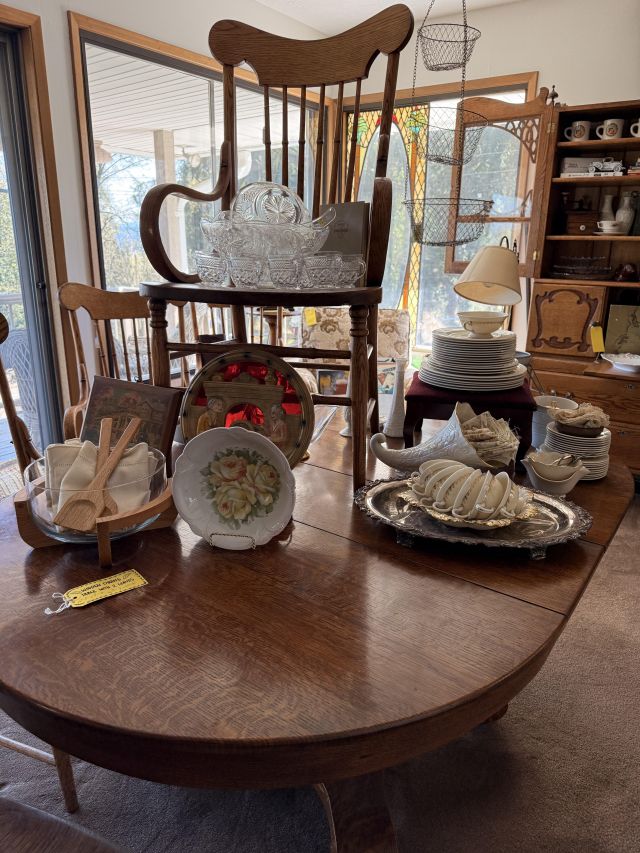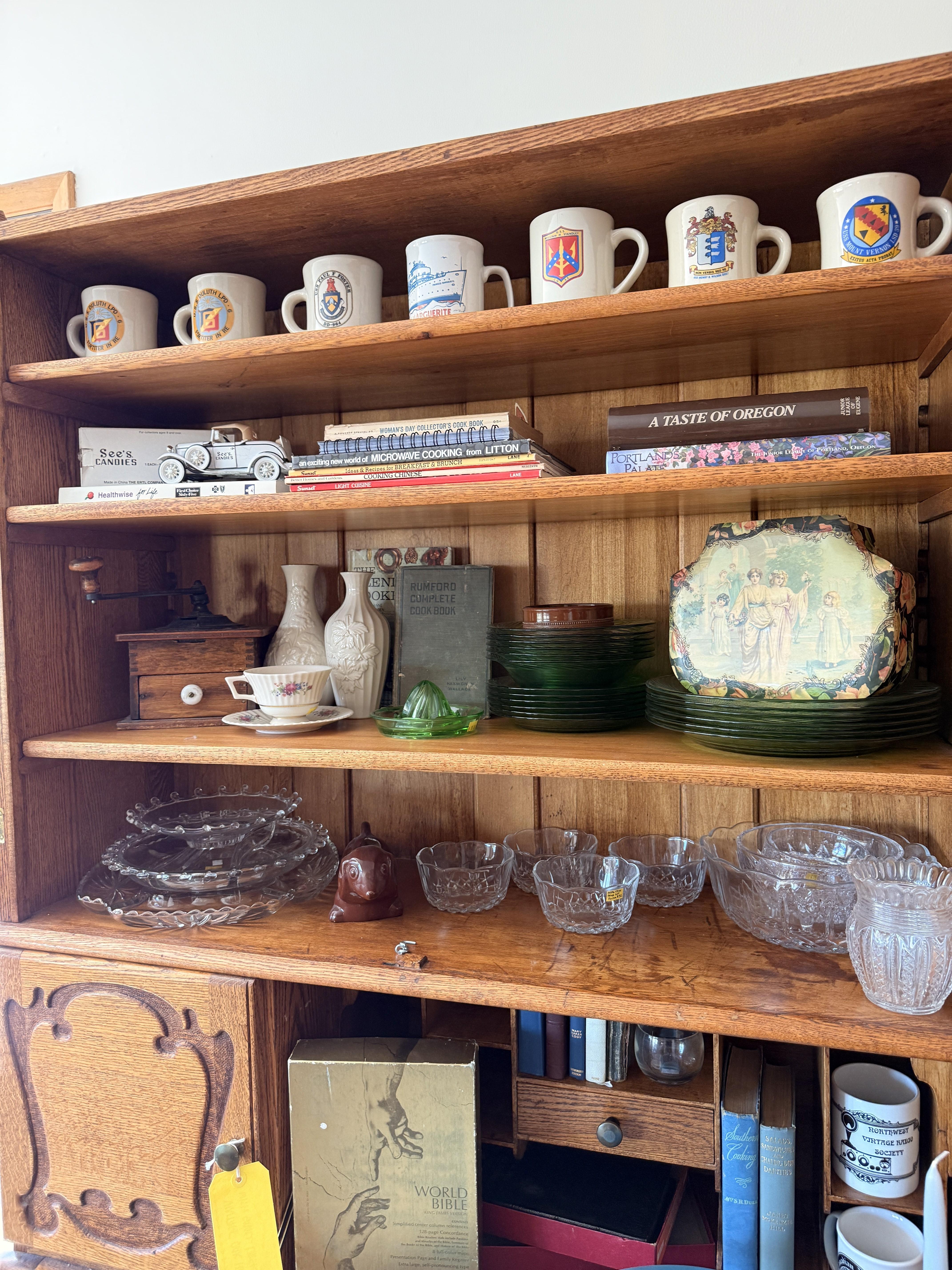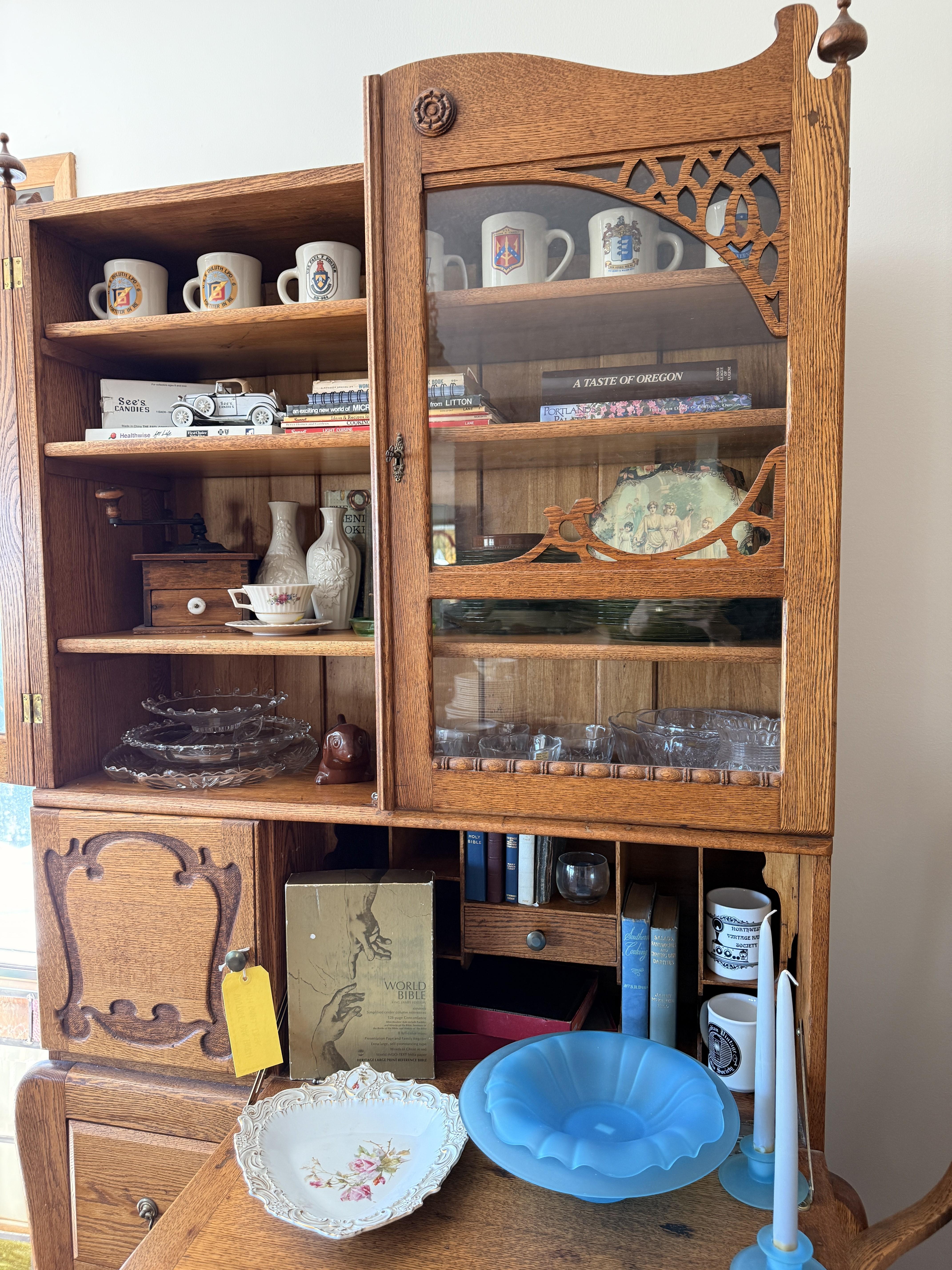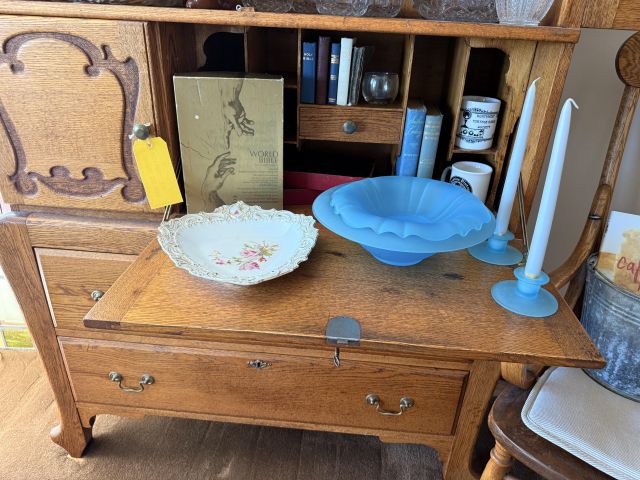To the right of the entry is the dining room with kitchen. In the dining room you'll find a gorgeous oak dining table with leaves and several chairs. Silverplate flatware sets, fine china (including Lenox Windsor), MORE art deco lamps, stained glass, floral chair and more formal table ware. There is an amazing hutch with fold out desk in the same style as the living room cabinets. It is so pretty!! Inside are more glass and china pieces with some other treasures.