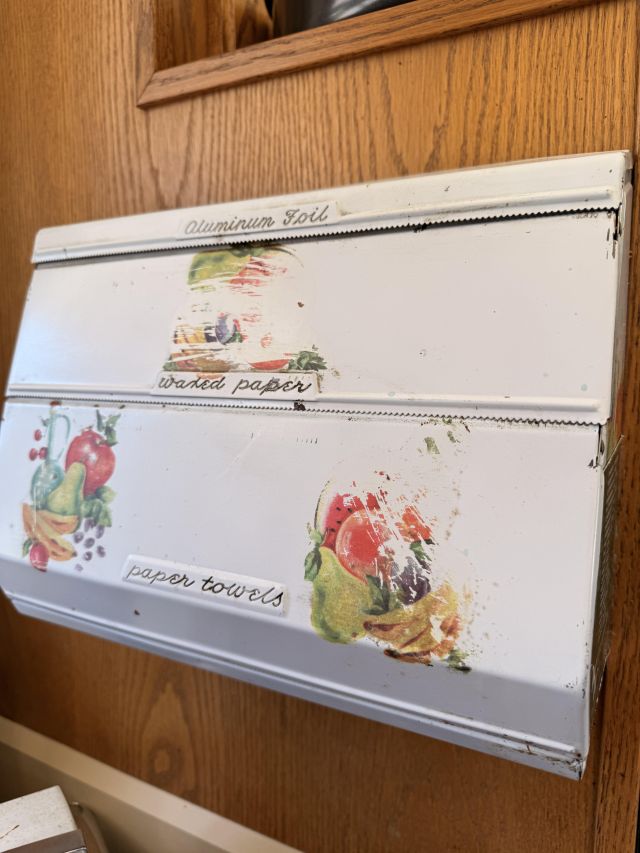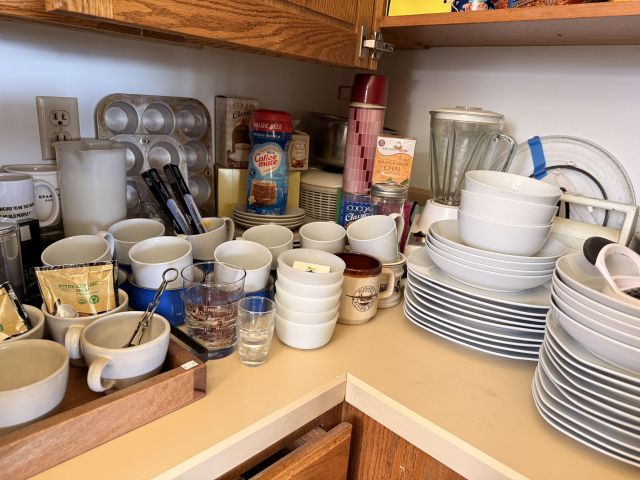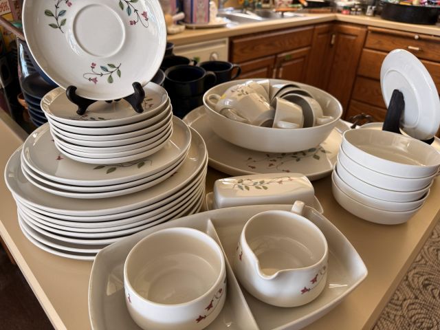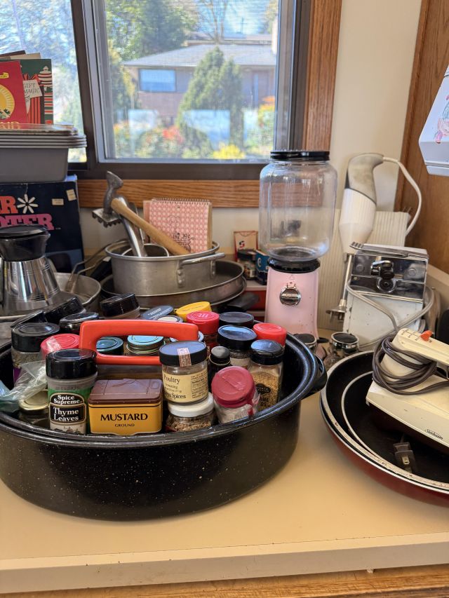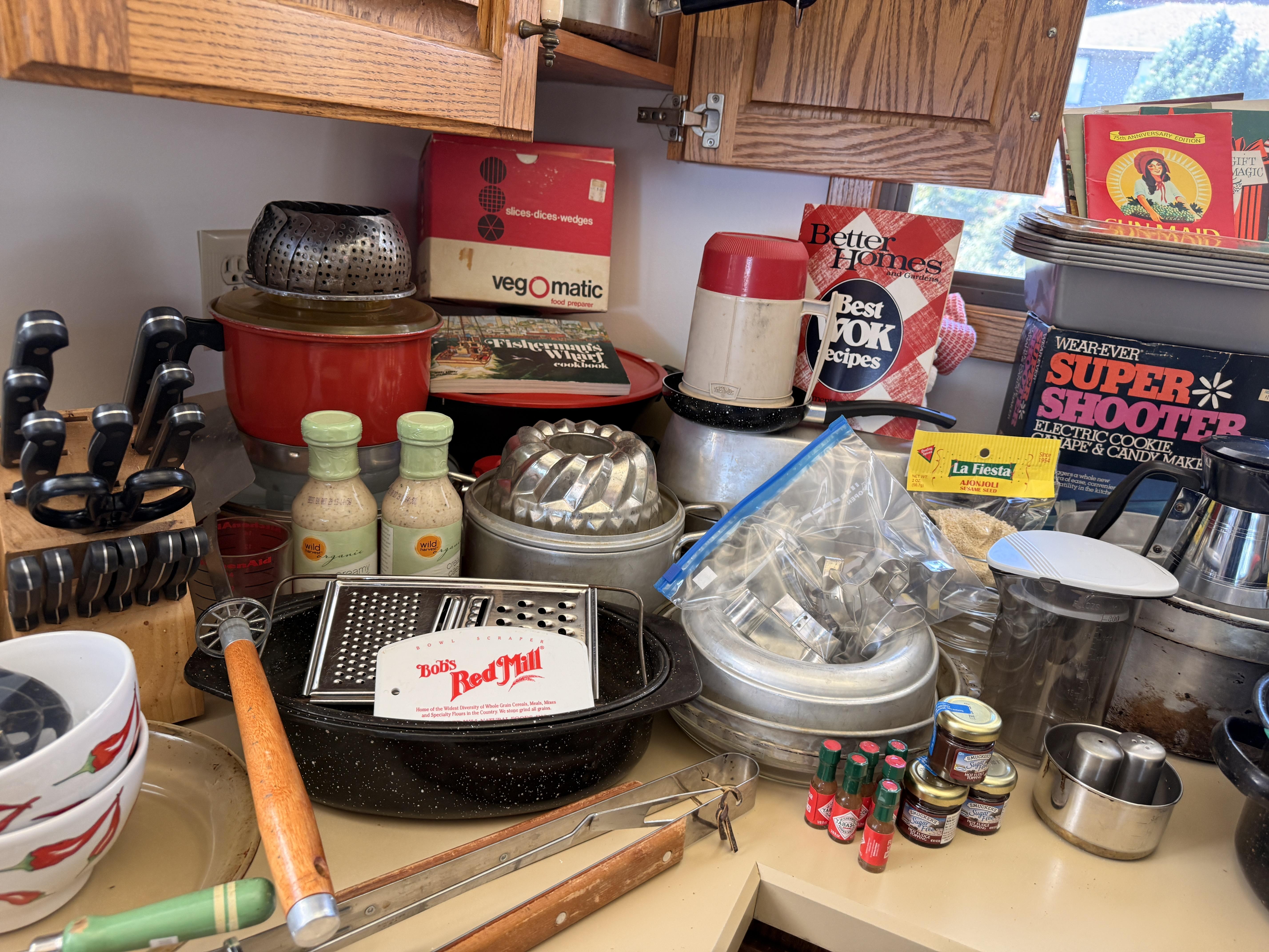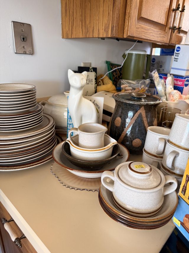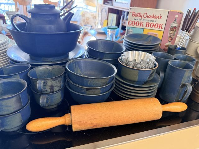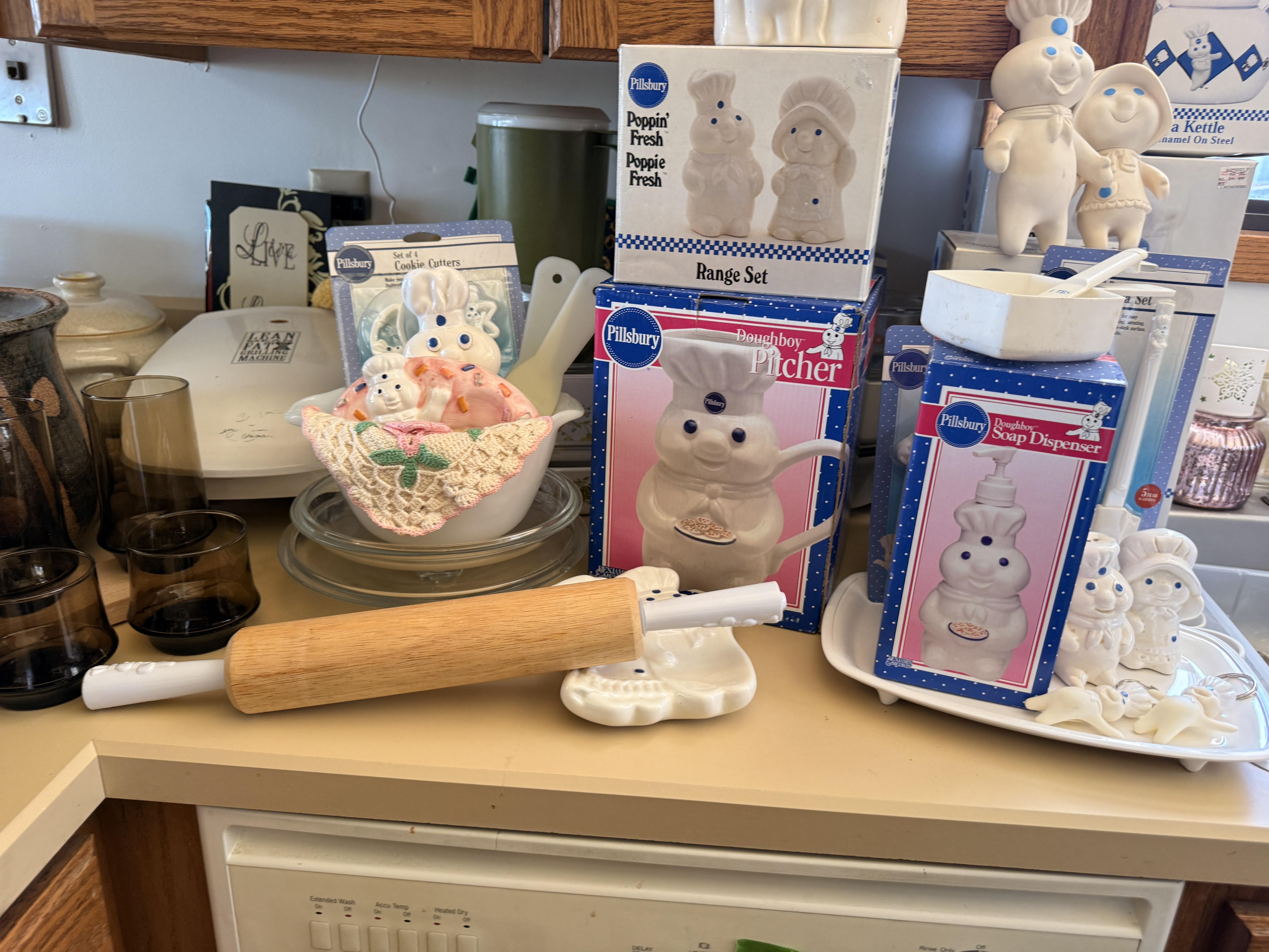 in the kitchen we've got pottery dishes, vintage florals, Pillsbury collectible kitchen items, lots of practical and decorative kitchen things, white dishes as well as spices and some food items.