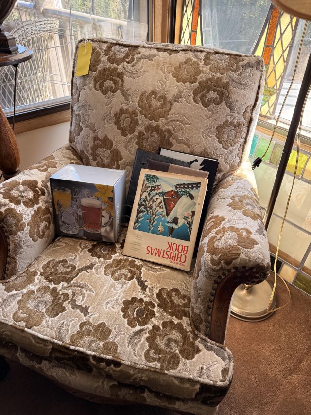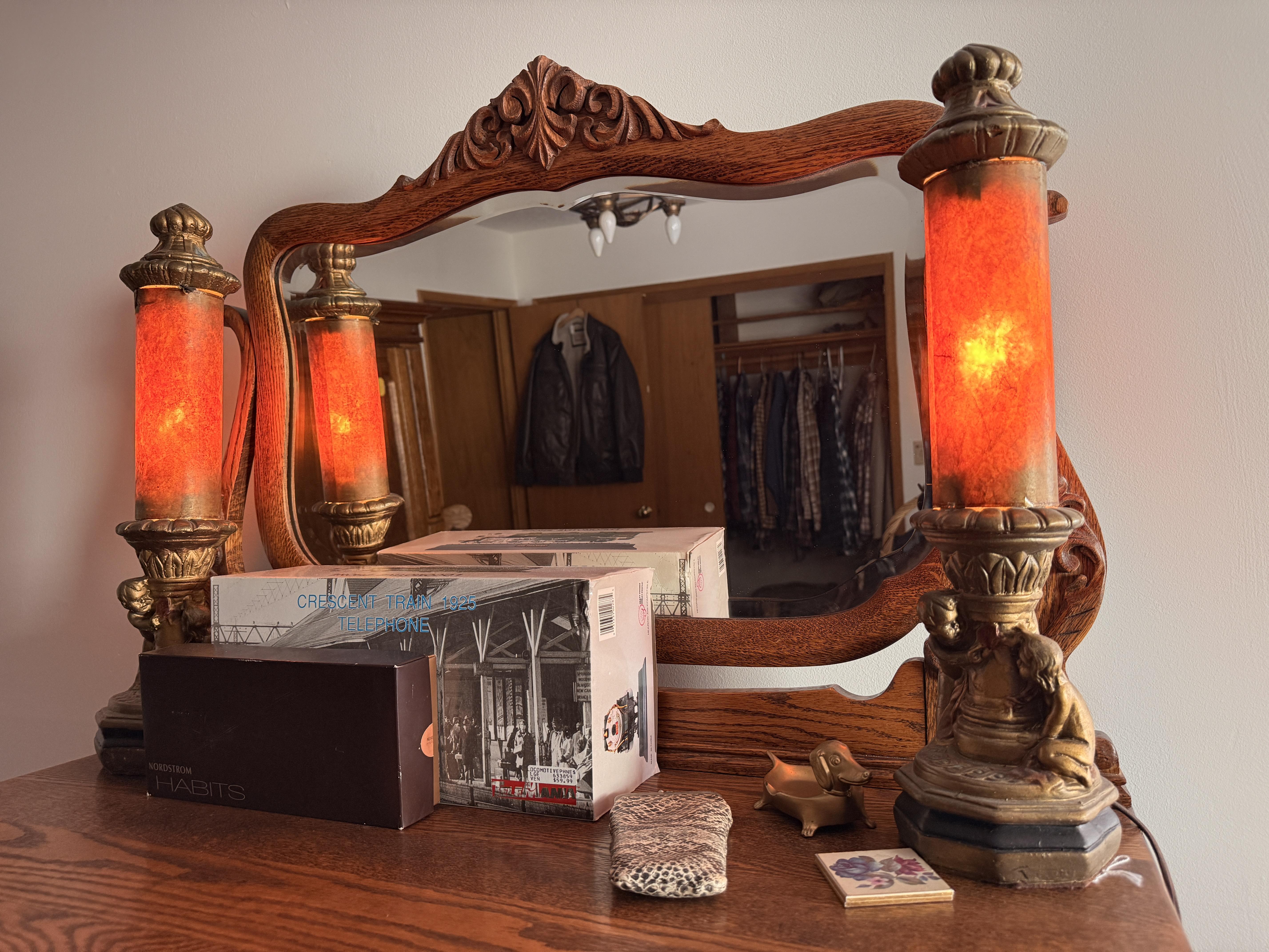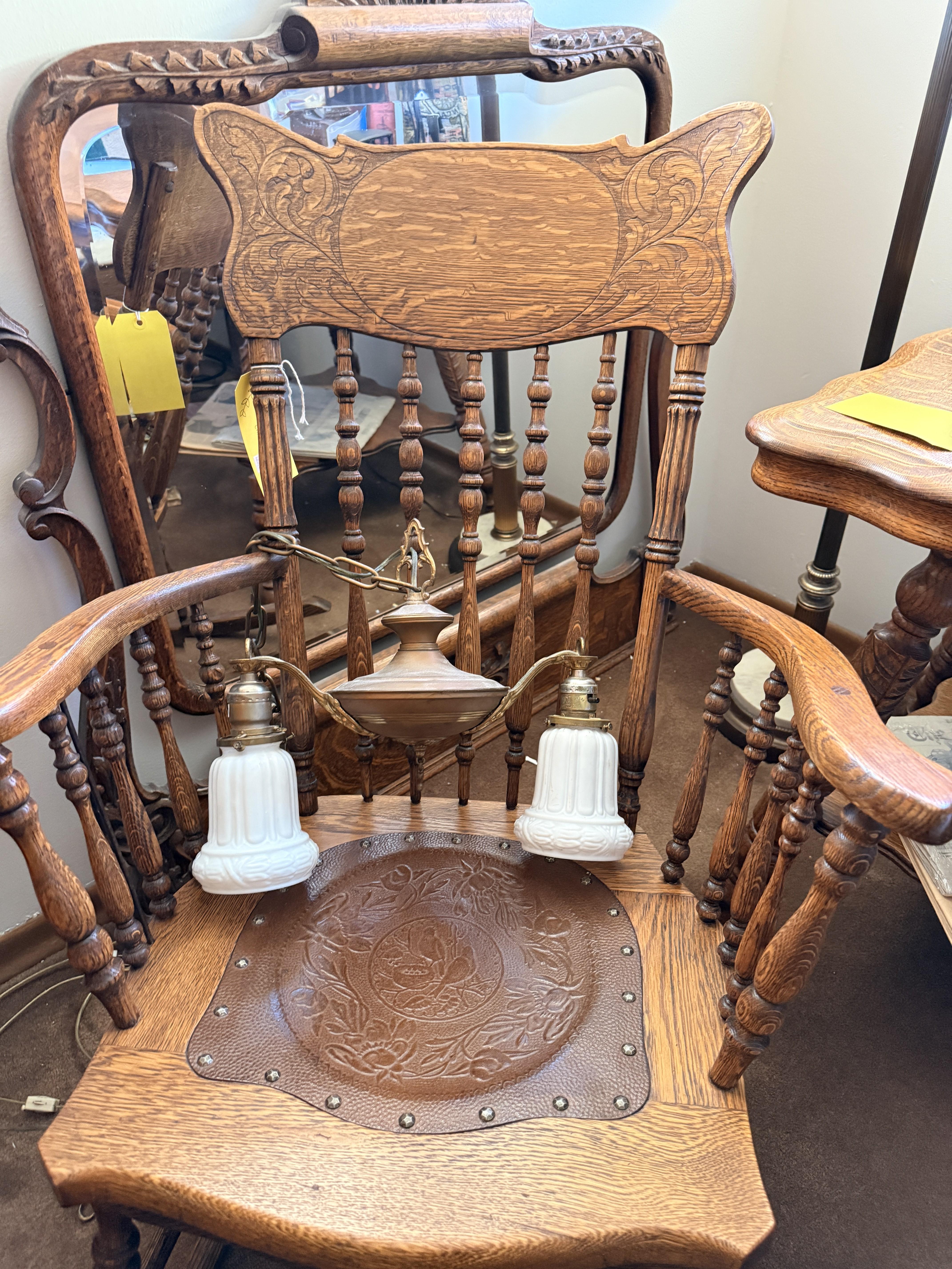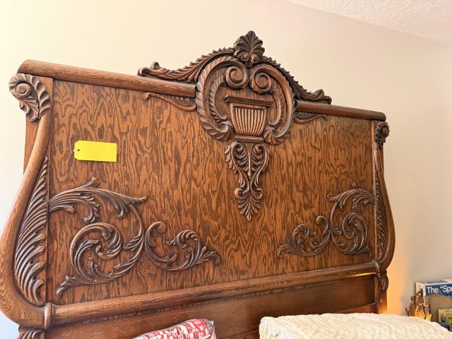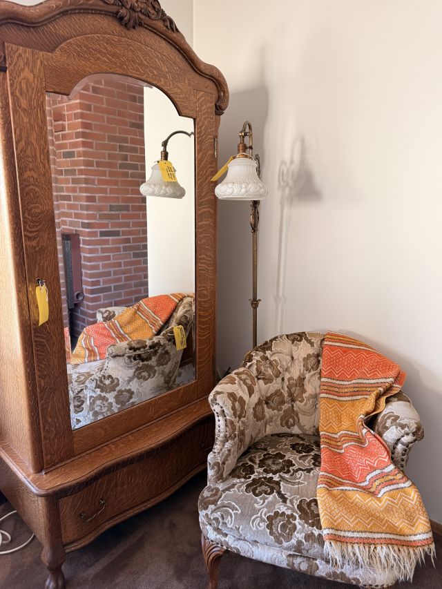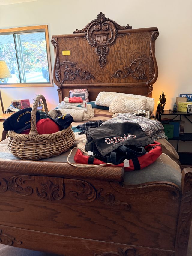 The bed is the real showstopper here. Stunning antique oak with so much detail!! We've also got another gorgeous wardrobe, tall dresser with mirror, wonderful rocking chair with tooled leather seat and yet another side table. MORE incredible lamps! Ships and lamps with cylinder shades. Lionel trains and tracks, linens and hats, vintage books some clothing - check it out if you love your flannels!!