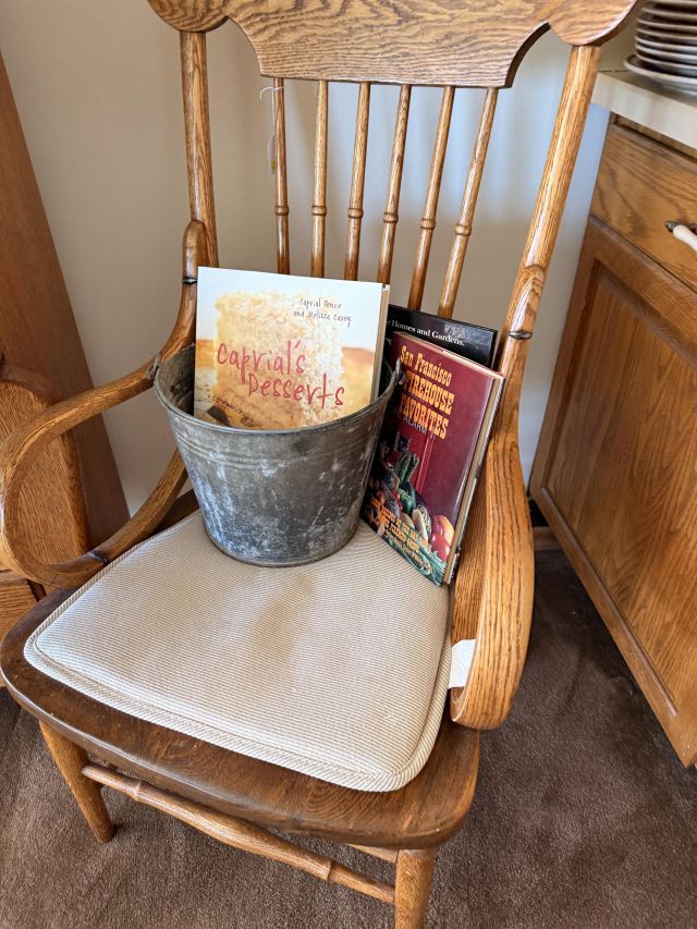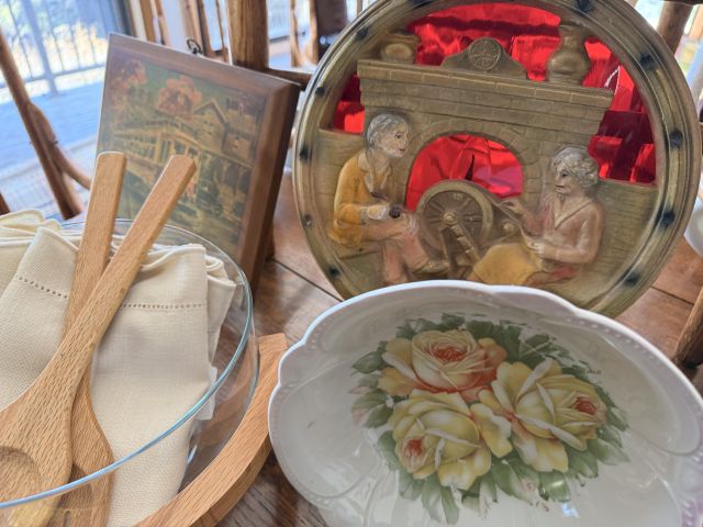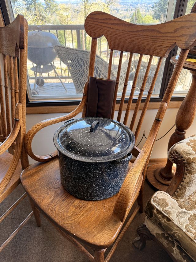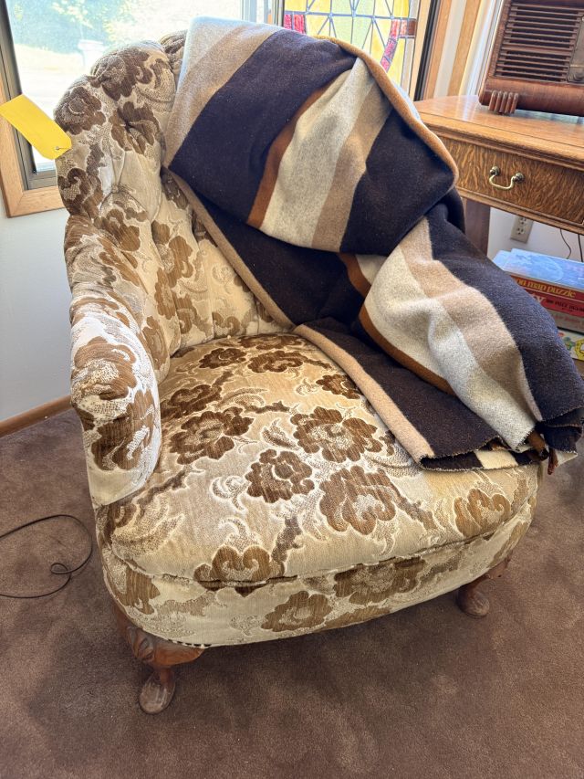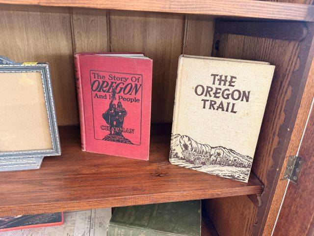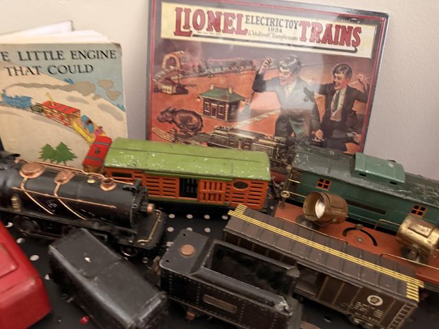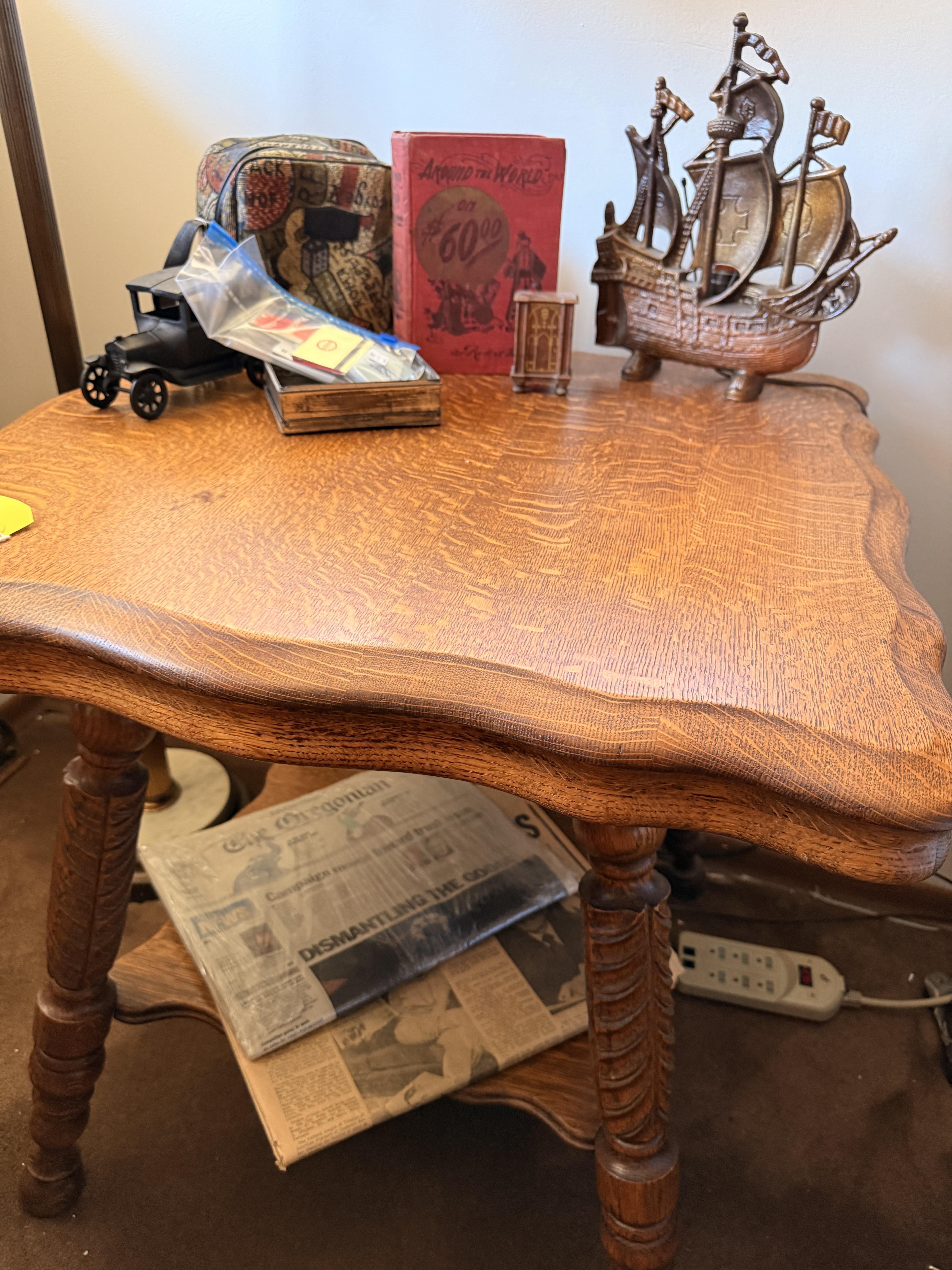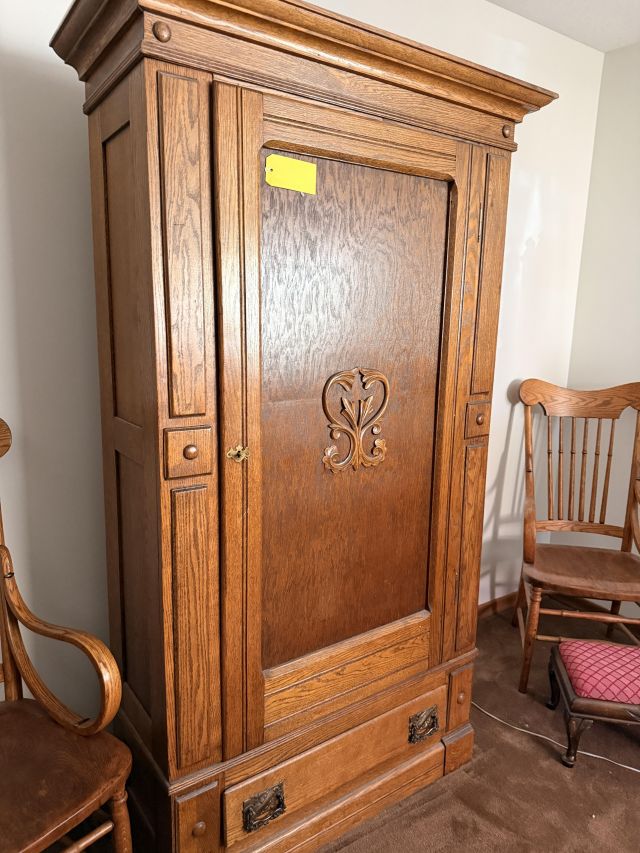 The bed is the real showstopper here. Stunning antique oak with so much detail!! We've also got another gorgeous wardrobe, tall dresser with mirror, wonderful rocking chair with tooled leather seat and yet another side table. MORE incredible lamps! Ships and lamps with cylinder shades. Lionel trains and tracks, linens and hats, vintage books some clothing - check it out if you love your flannels!!