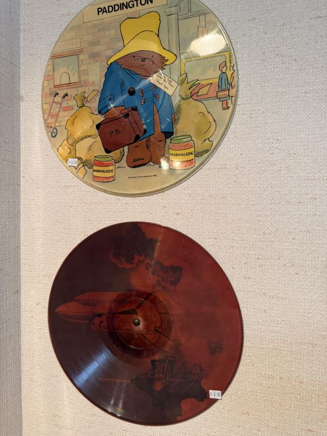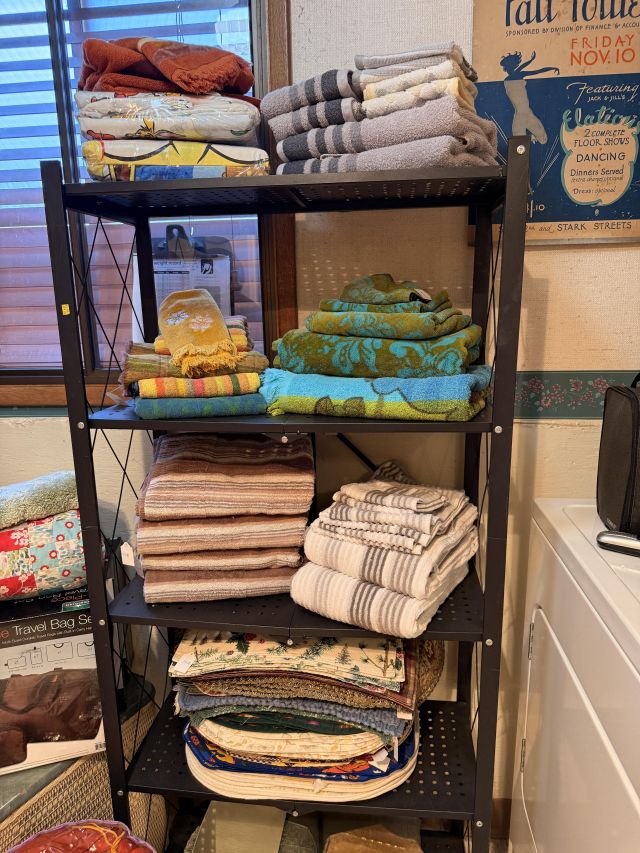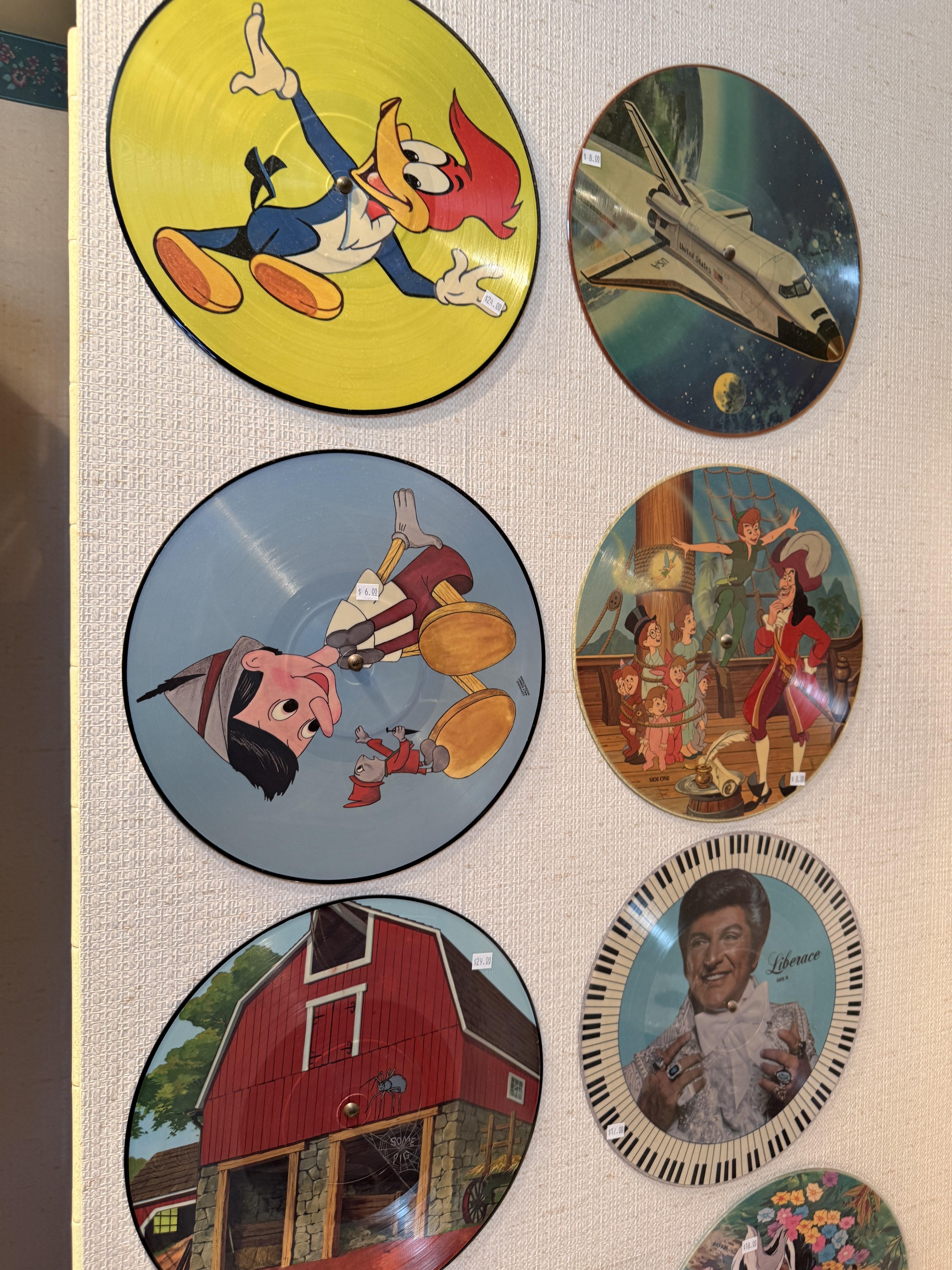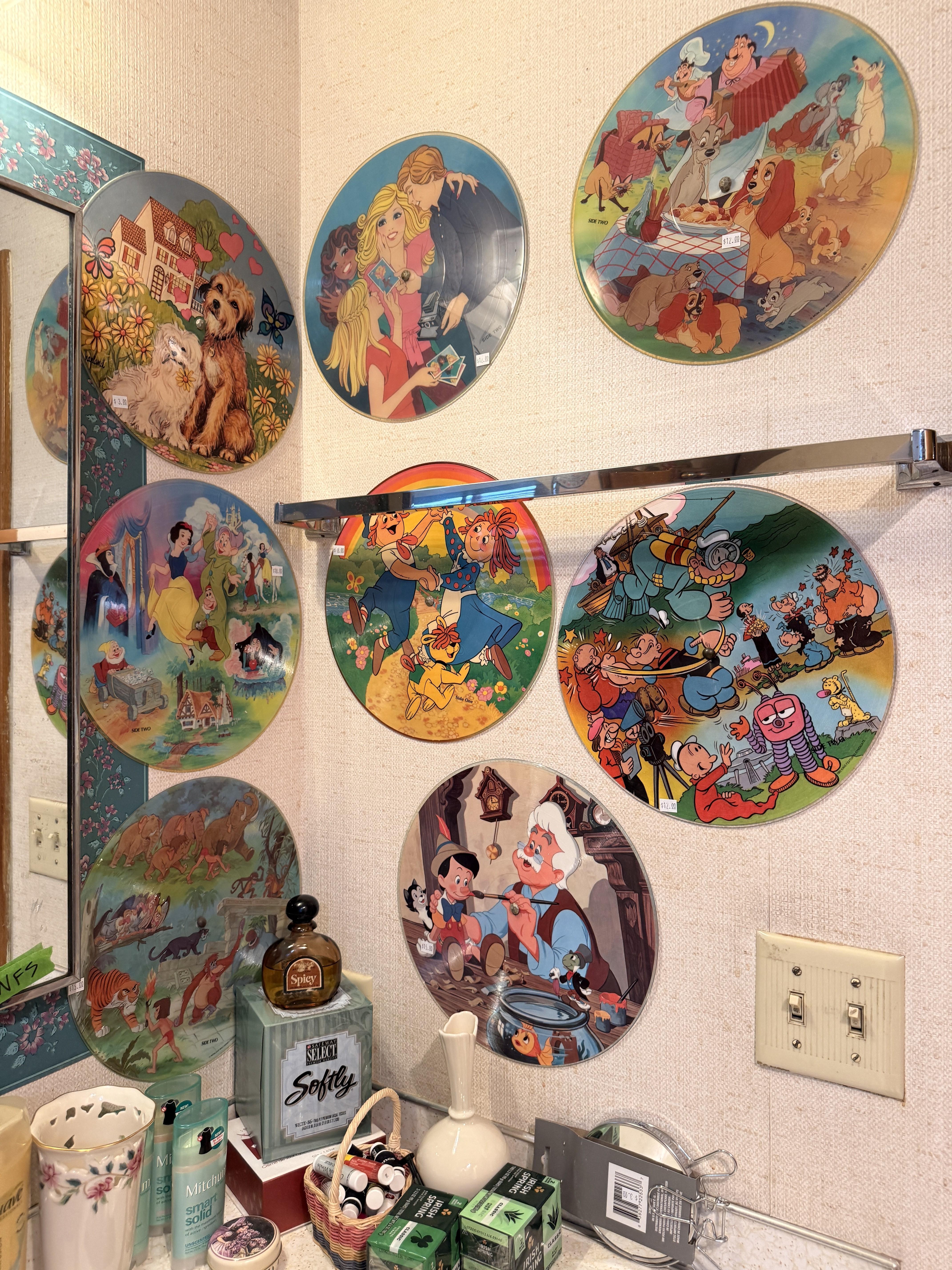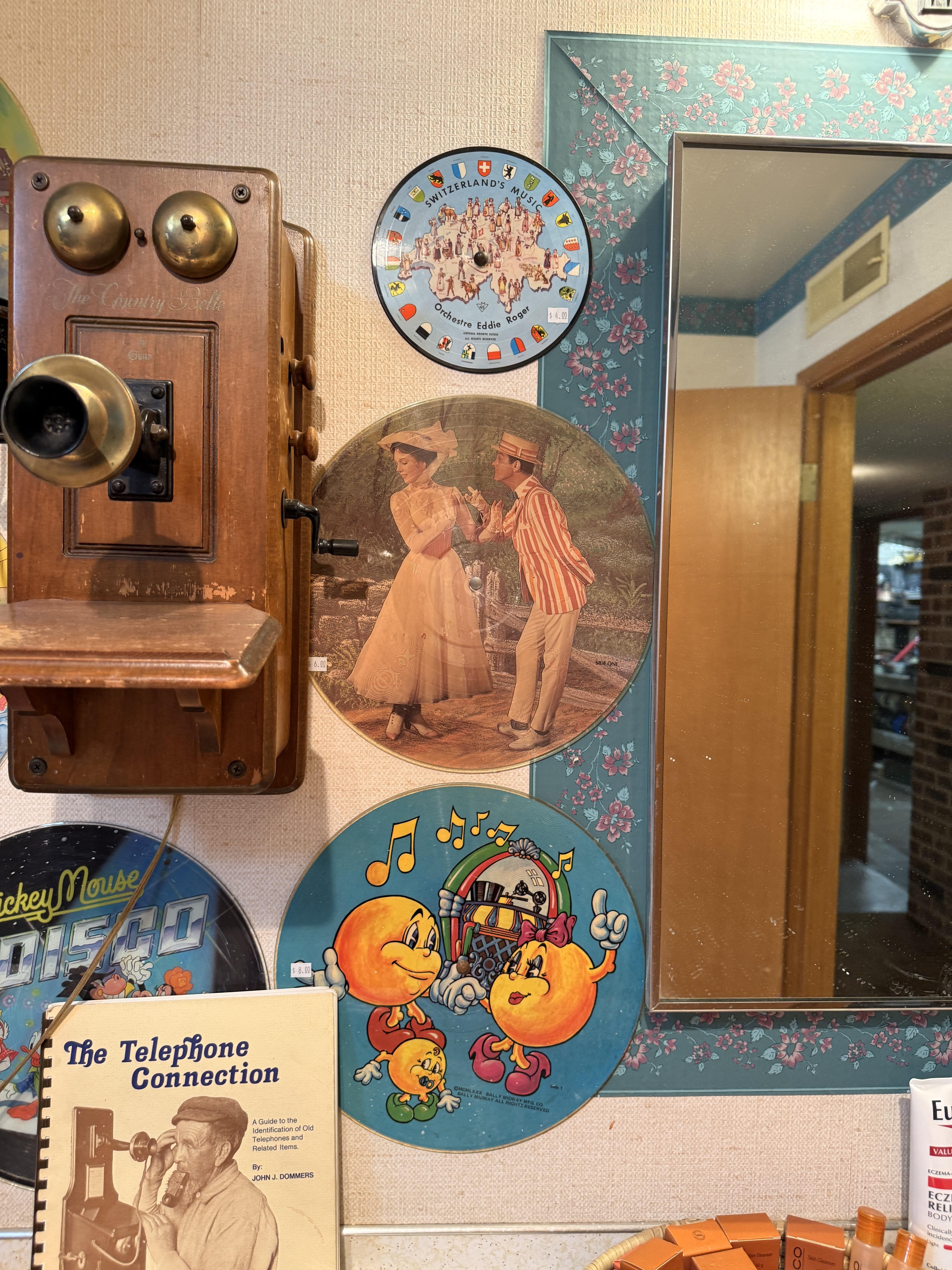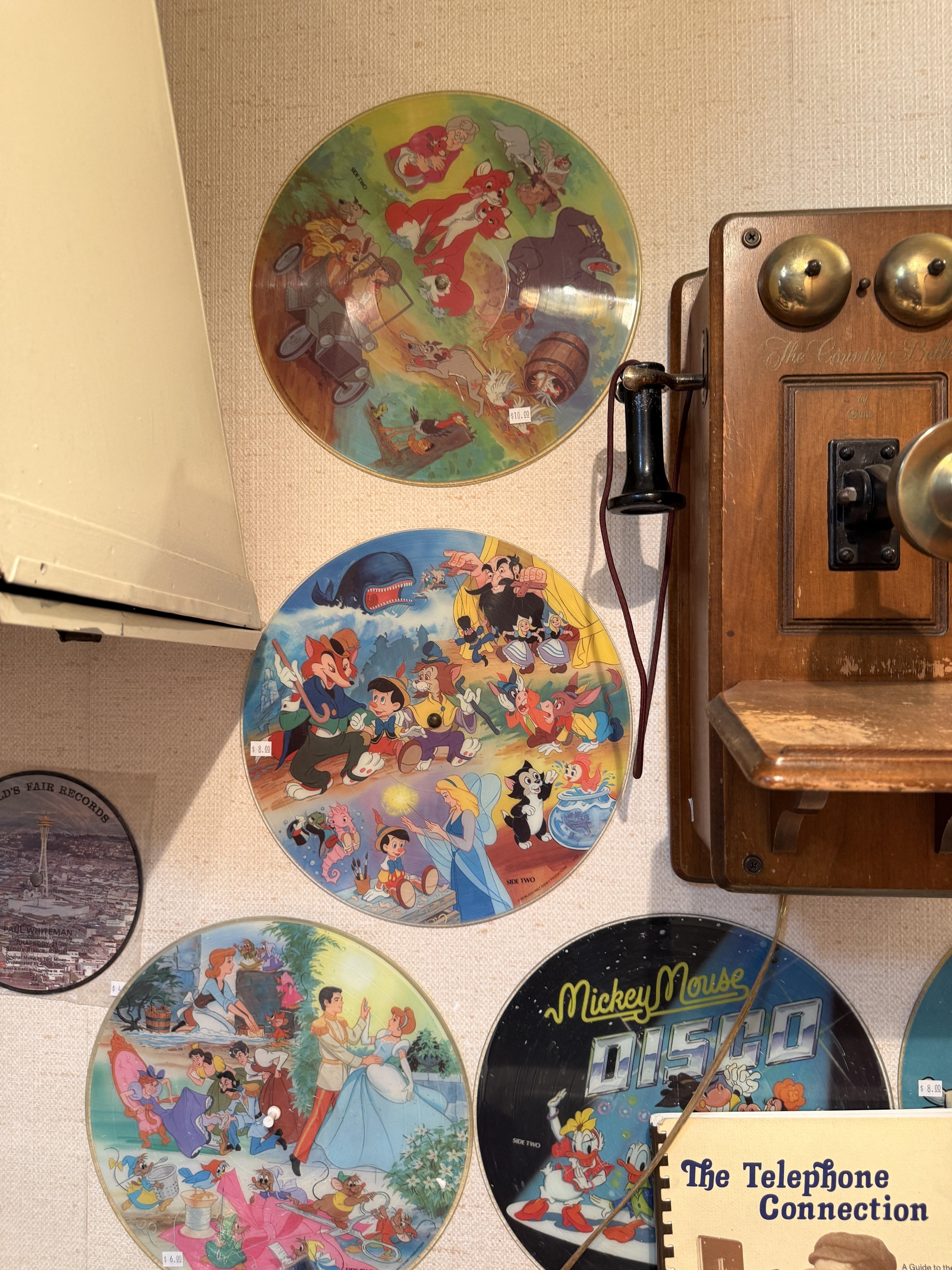 MORE records! These ones are for the kids, or kids at heart. Disney. Space, lots of popular cartoons!! Oak wardrobe converted into linen closet (such a great piece), more linens (many vintage), antique wall phone and more. Large antique scale.