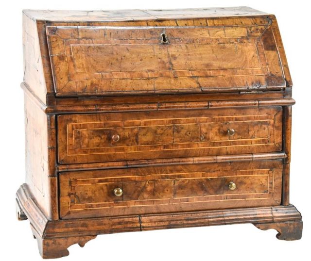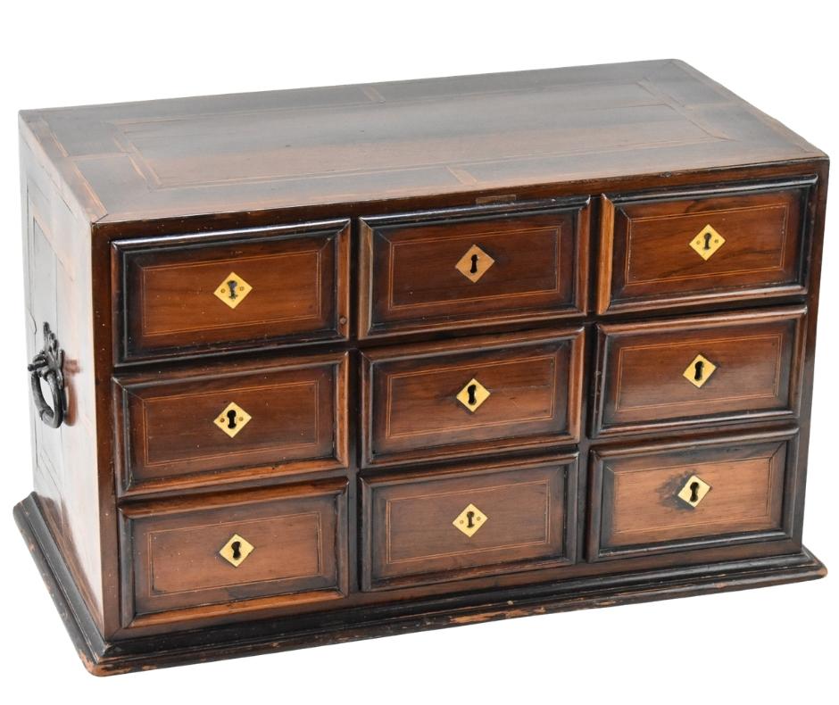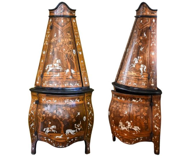 -ANTIQUE FURNITURE including William Cowling & Son Queen Anne mahogany & marquetry dressing table, French Renaissance Revival oak hunt cabinet, Baroque period marquetry cabinet on chest, Globe Wernicke stacking bookcases, Milanese Italian inlaid marquetry ebonized corner cabinets, Spanish renaissance Bargueno Escritorio, Queen Anne walnut miniature bureau, 18th C. Dutch rosewood valuables chest, mahogany work table attr. to Samuel McIntire, Early George III mahogany secretaire-chest chiffonier, Merklen style library table & more