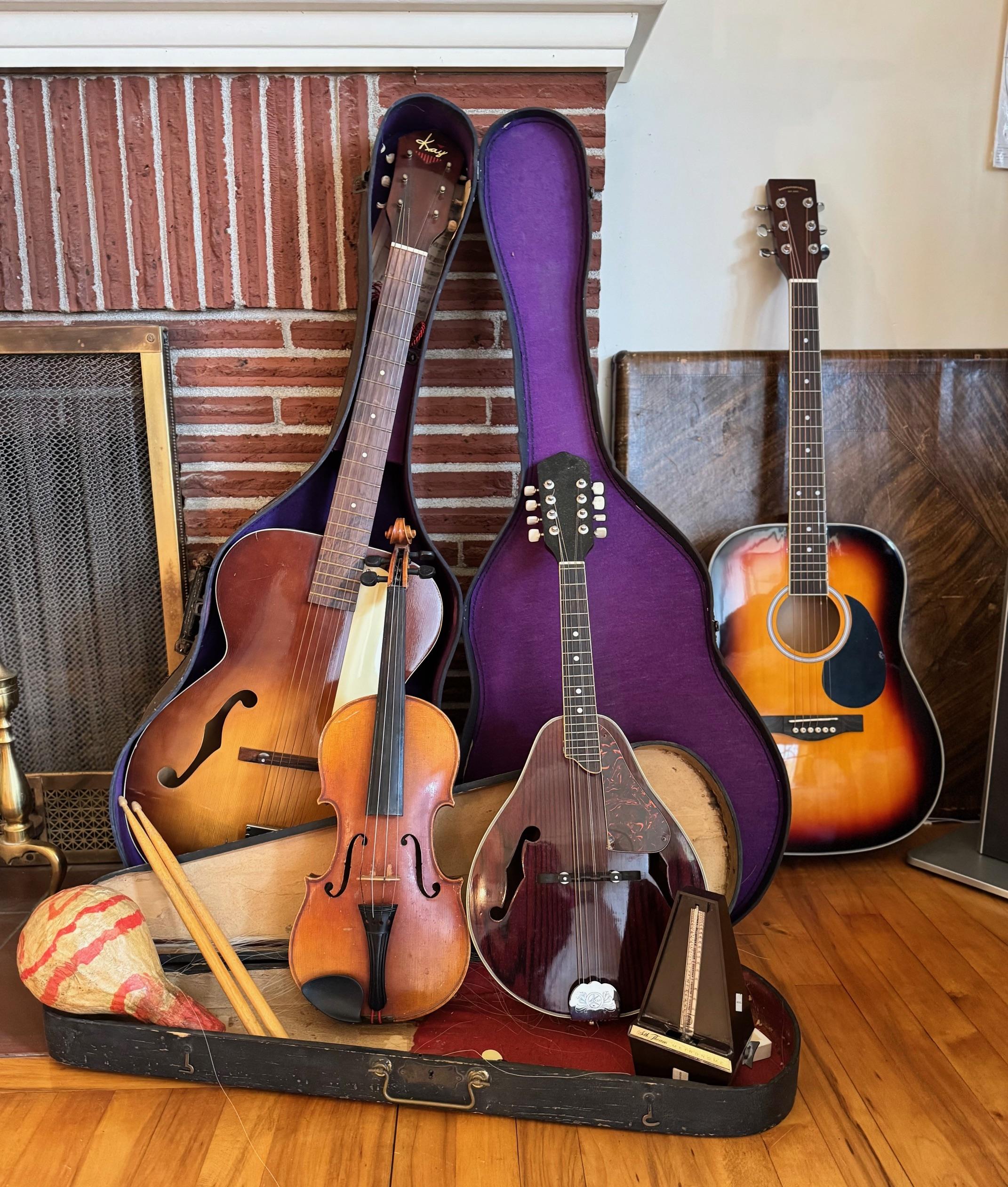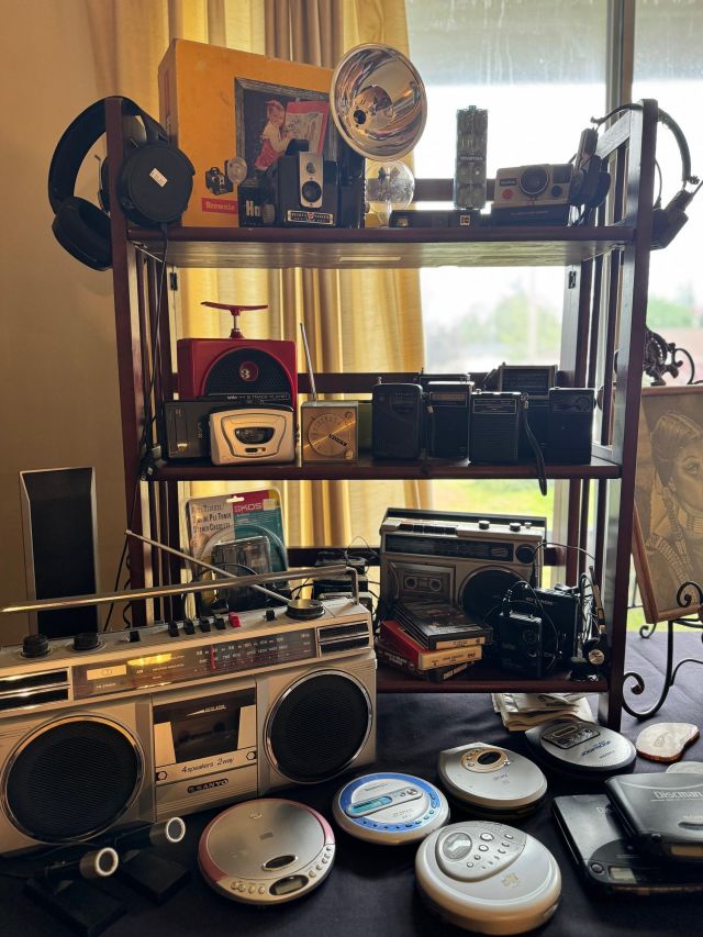 Music, guitar, harmonicas, 100s of cassettes, cameras, audio equipment and audio books. Radios and office goods. Discman!!