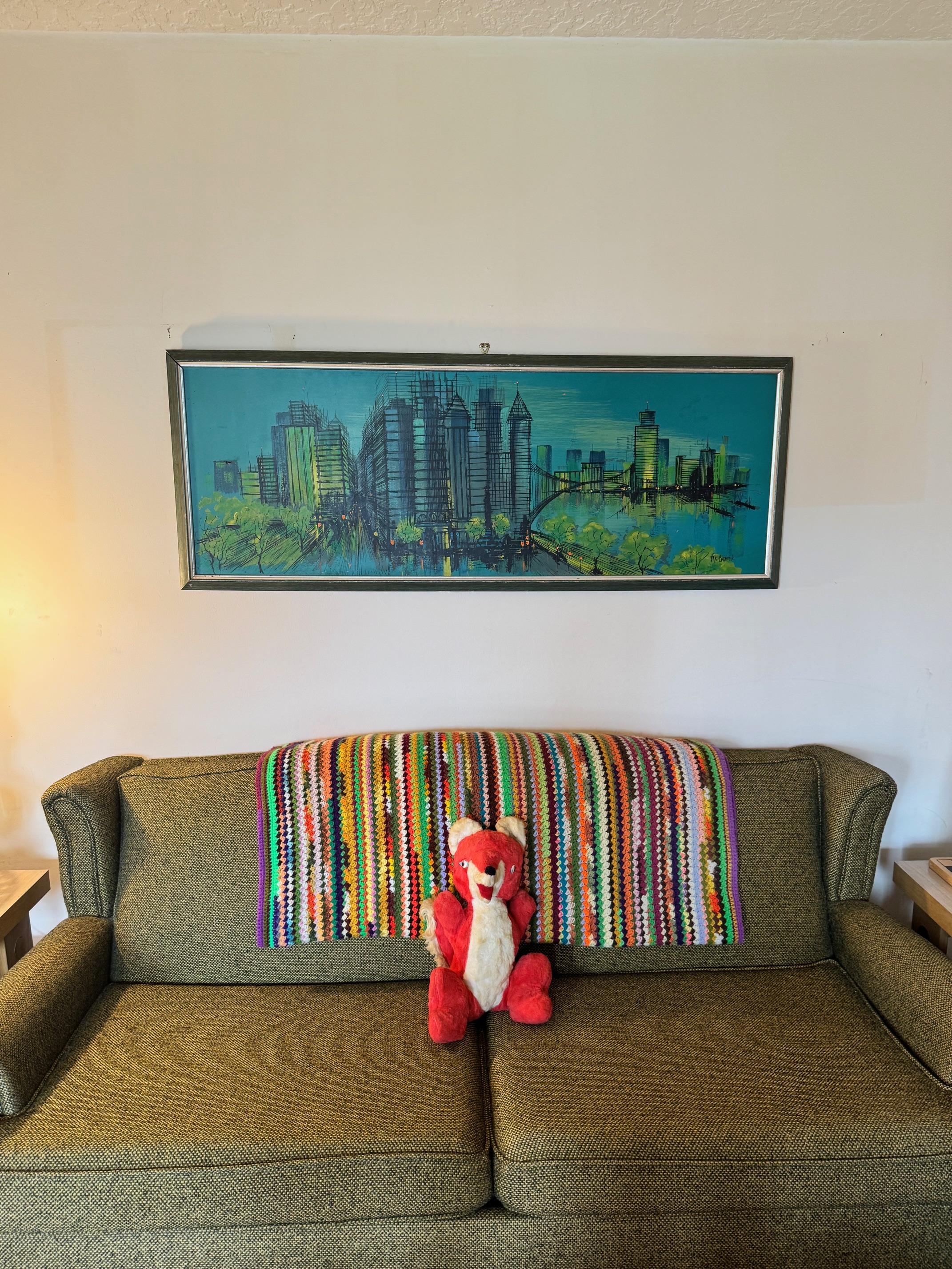 Furniture: MCM festival!! Best green sofa ever. Coffee table and side tables. The iconic art piece featuring Seattle skyline.