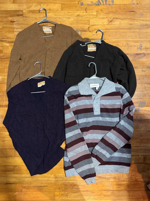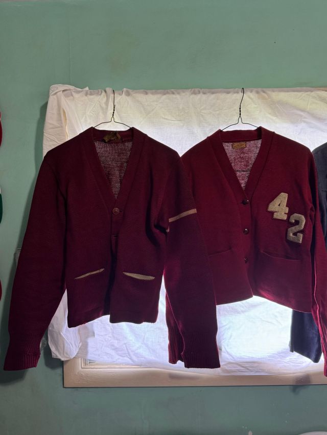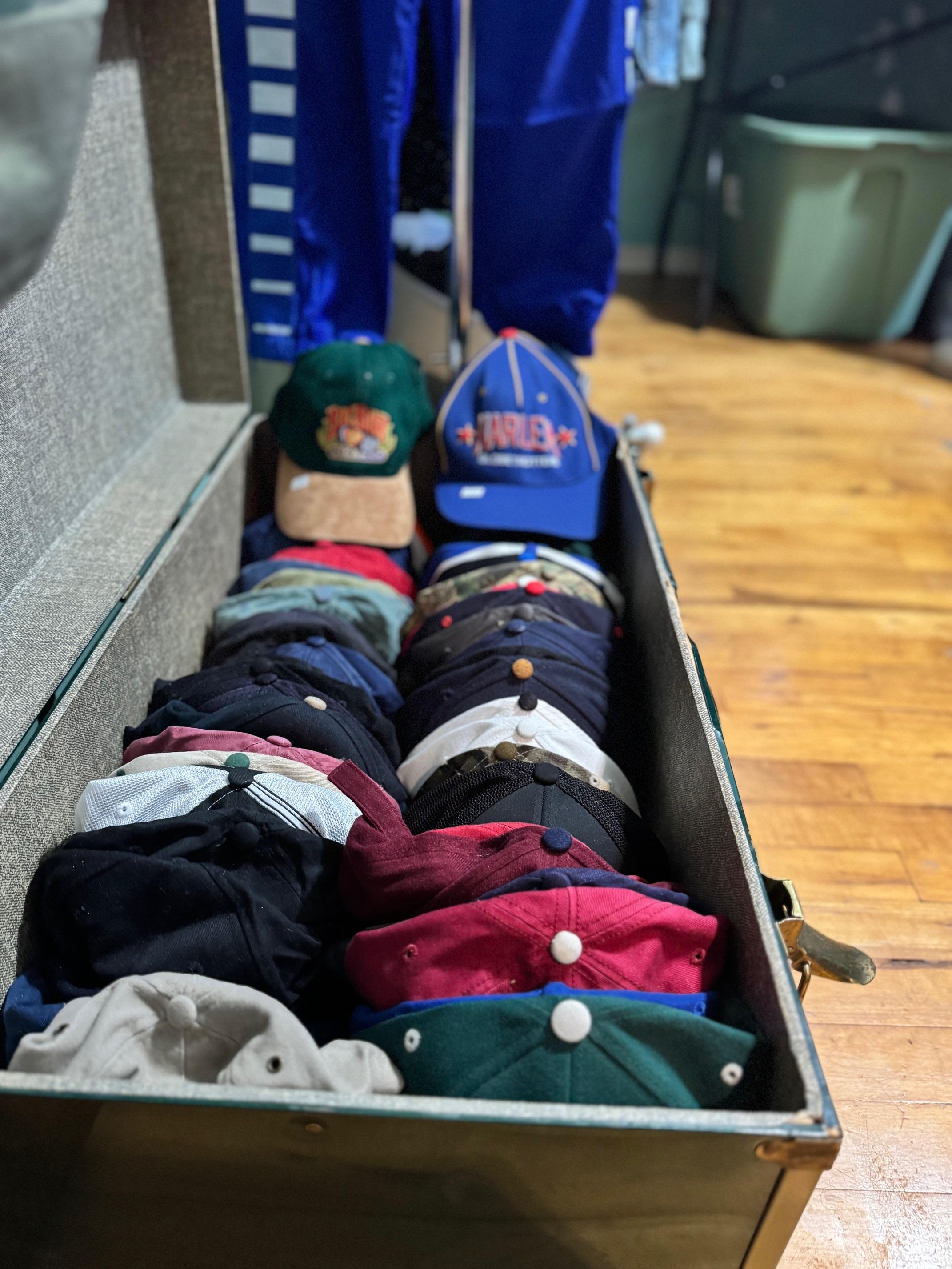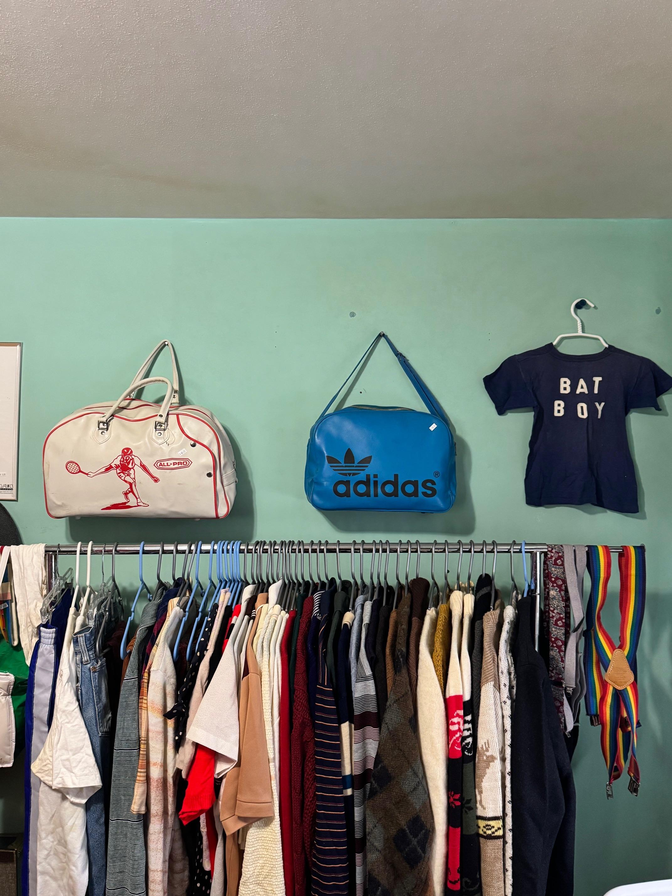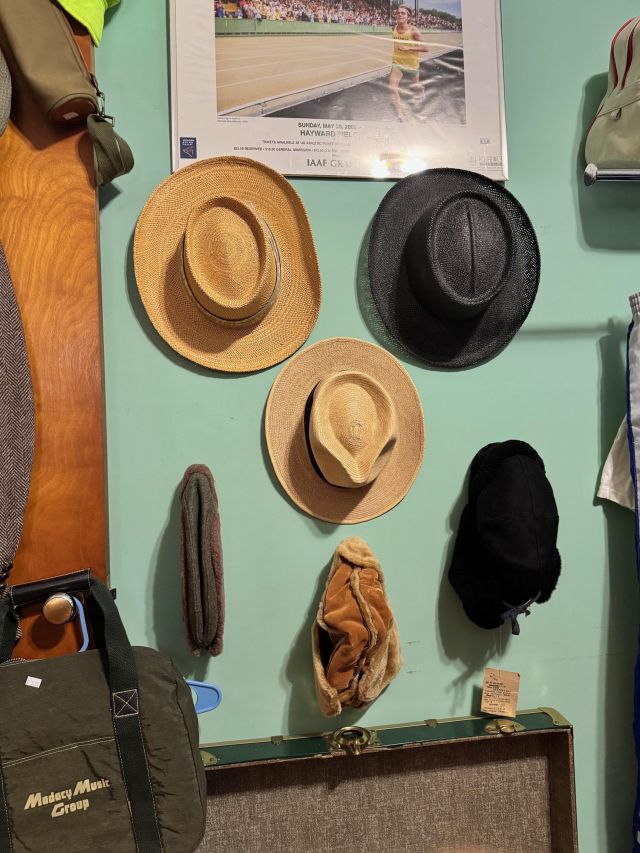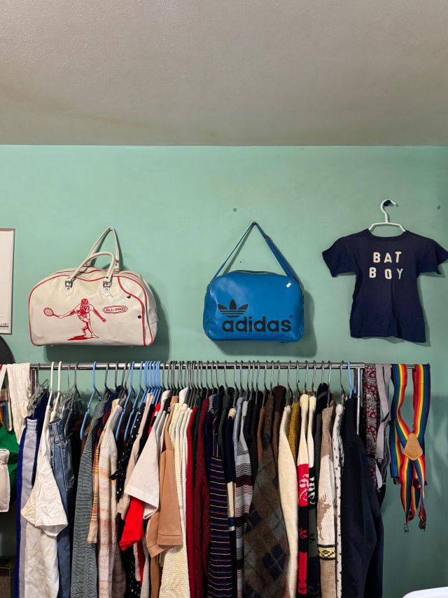 Vintage sports clothing! And caps!! Loads of vintage leather as well as men’s retro clothing, belts and hats galore.